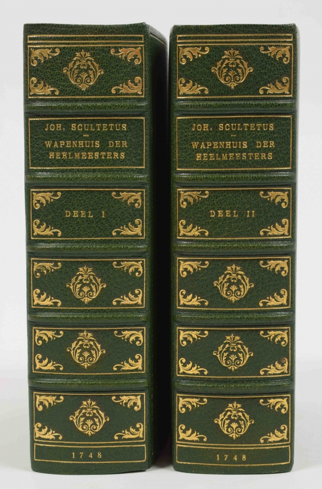 Good, untrimmed copy. Occ. sl. foxed/ tanned (incl. along the front edges, where the paper is sl. brittle); title of the second vol. expertly restored in margins. Rare, very extensive Dutch edition of this complete catalogue of all surgical aids known at the time, by the leading doctor Johannes Schultes (1595-1645). The first edition appeared posthumously at Ulm in 1655 under the title Cheiroploteke seu armamentarium chirurgicum.