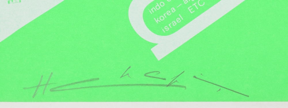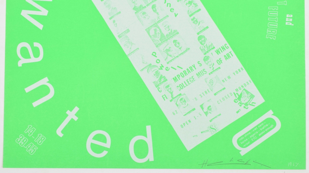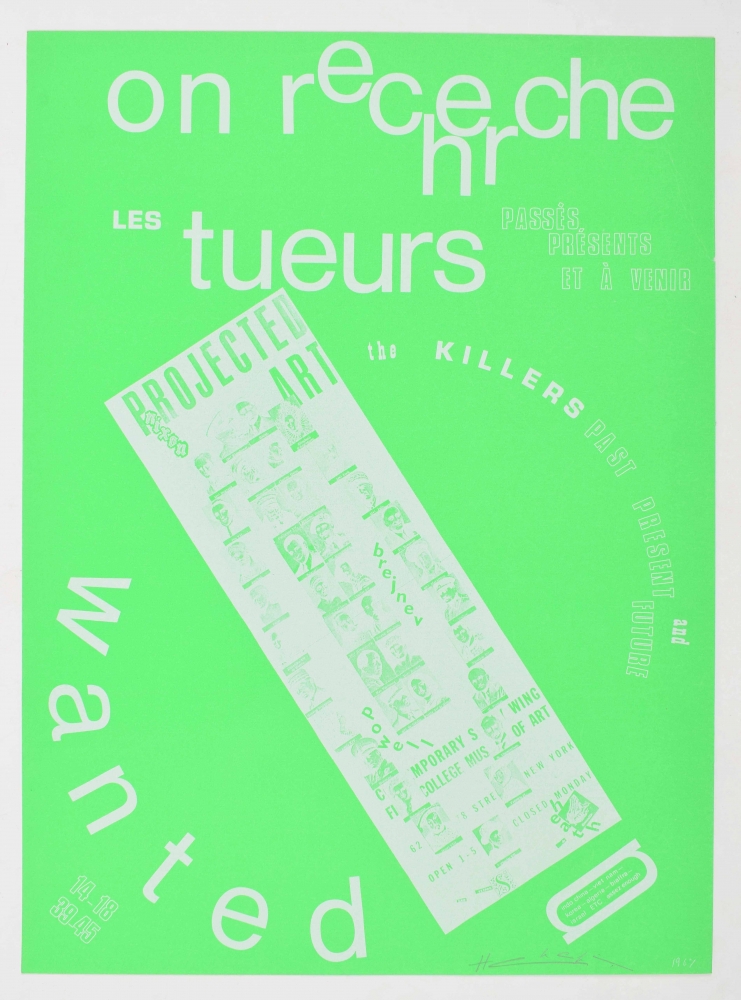 "On recherche les tueurs. Passés présents et à venir". Serigraph in silver and green, 1967. Signed at bottom with pencil. 62.5 x 46 cm.