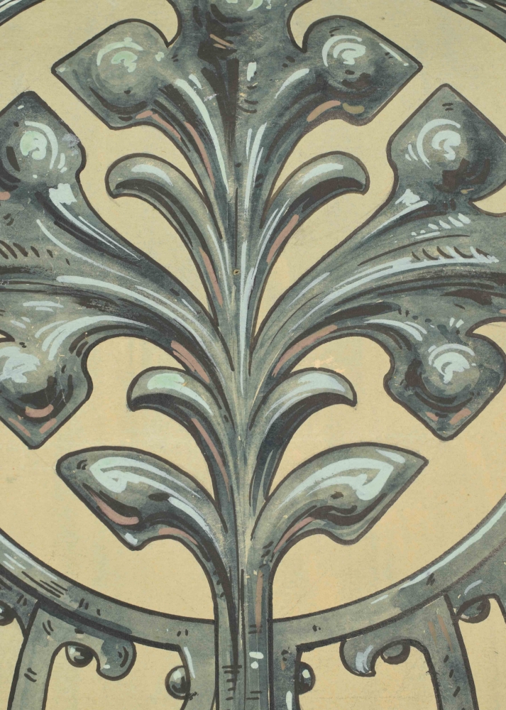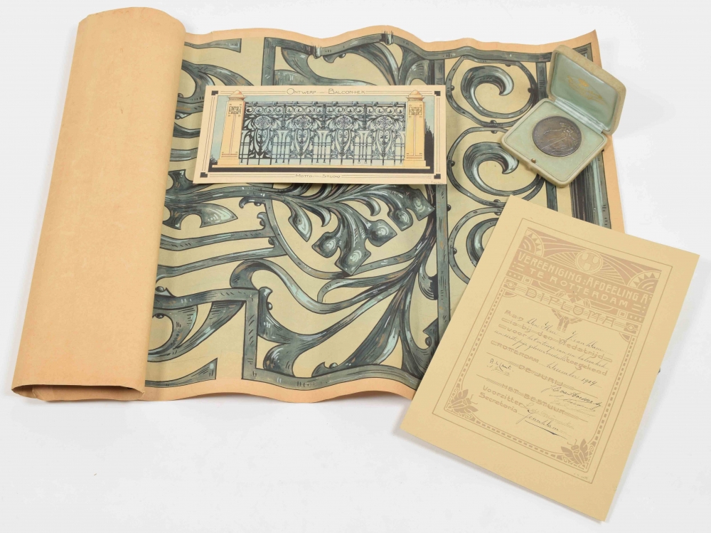 (2) (Much enlarged detail of ironwork of the balcony fence (1)). Original design in pen and ink and gouache, sheet size 102 x 53 cm, signed lower r. (creases/ rolled up); (3) "Vereeniging Afdeeling A te Rotterdam. Diploma. Aan den heer J. van Dam is bij den wedstrijd voor het ontwerp van een balconhek een eerste prijs, zilveren medaille toegekend. Rotterdam December 1904". Printed diploma filled in by hand, as designed by J.W. Arts, sheet size 34 x 23 cm. Signed with pen by the members of the jury, amongst which Adolf le Comte (1850-1921) and Jacob Cornelis van Dorsser (1880-1858). Also signed by the chair of the board L. de Munnik, and by J. van Dam himself as secretary of the society; (4) The silver token [coin] mentioned on the diploma, of de Vereeniging tot Verfraaiing van Rotterdam en tot Bevordering van het Vreemdelingenverkeer (uitgegeven in 1903), in original box of the maker J.M. van Kempen & Zonen (Voorschoten). Diameter 6 cm. (total 4)