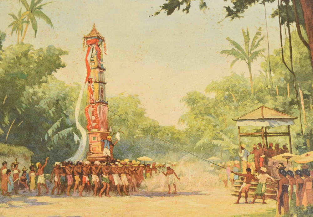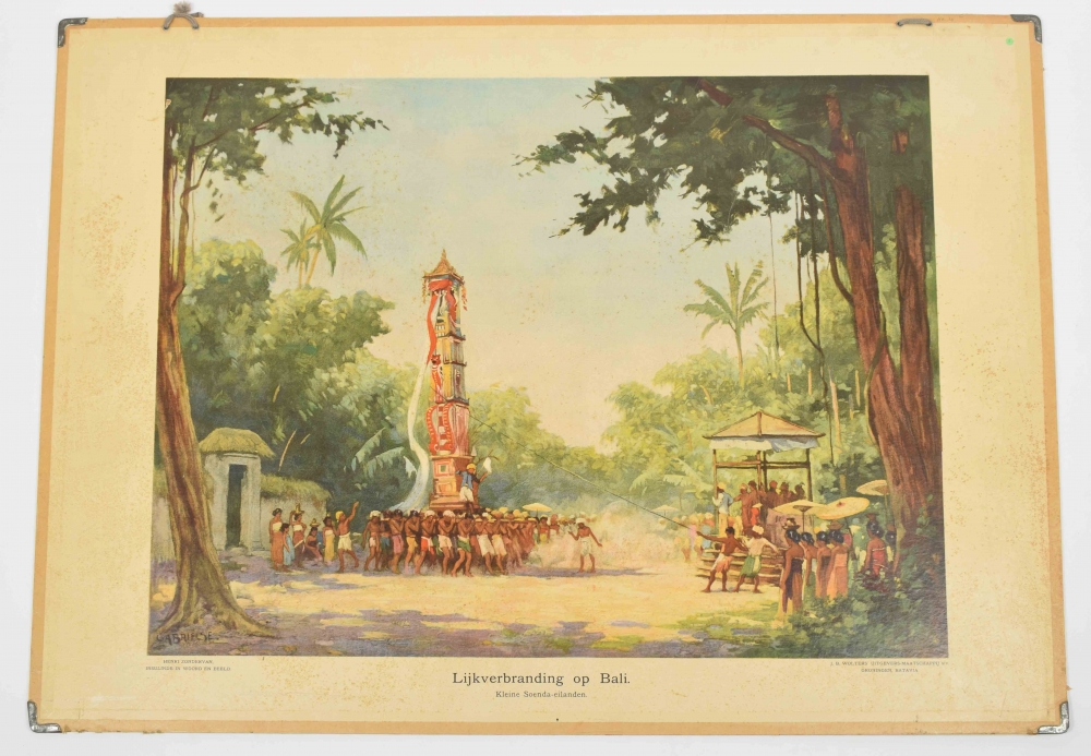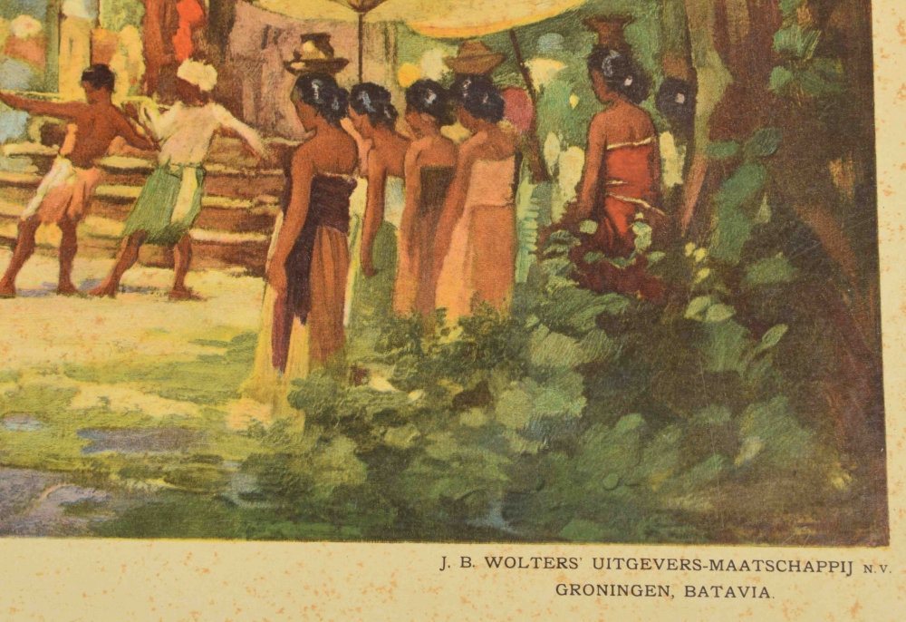 5 plates from the series: no. 4: De steile Zuidkust. Java (Gabriëlse); no. 5: Rijstbouw. Java (2x); no. 12: In de Minahasa. Celebes (Gabriëlse); no. 13: De Missie in Insulinde. Kerk op Lomblem. Kleine Soenda-eilanden; no. 14: Lijkverbranding op Bali. Kleine Soenda-eilanden (2x). Groningen/ Den Haag, J.B. Wolters, c. 1927. 75 x 102 cm.
