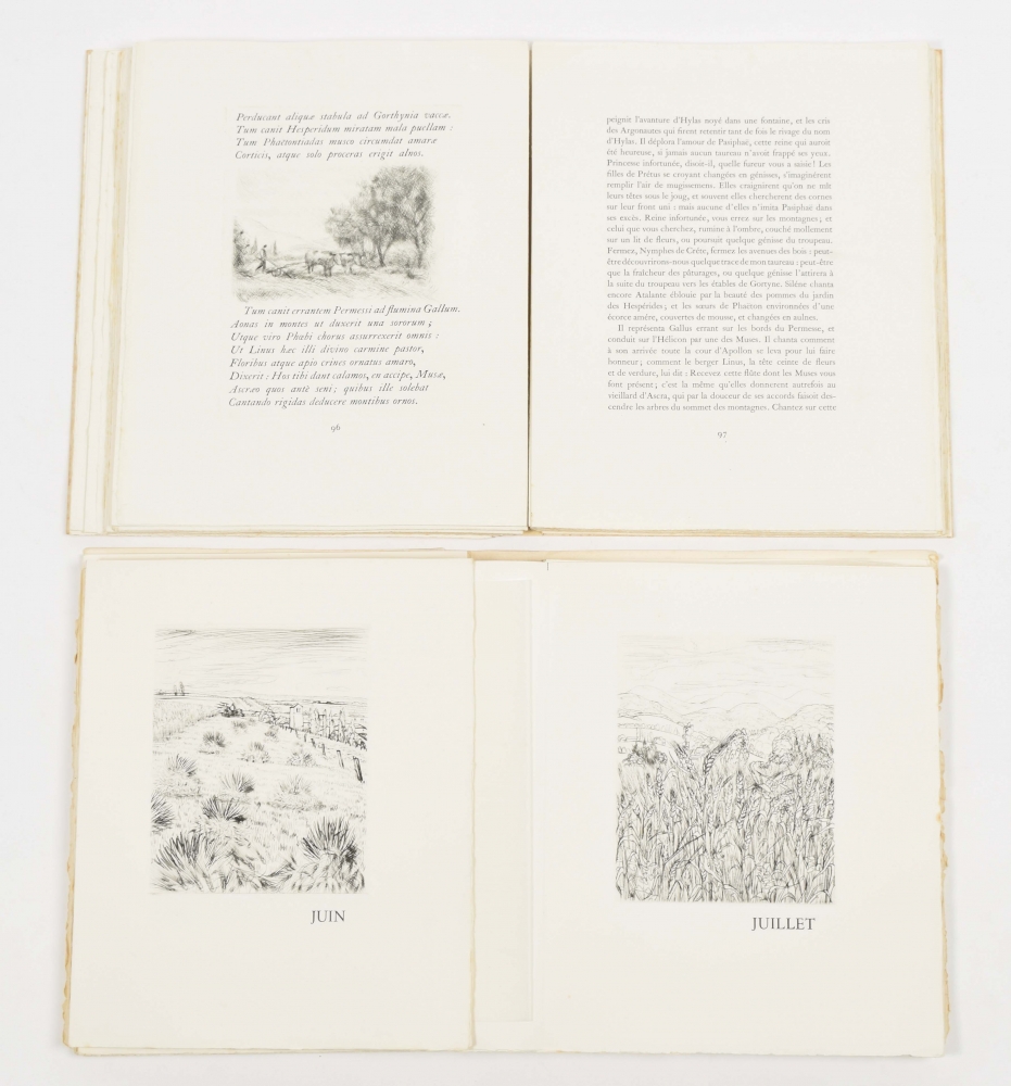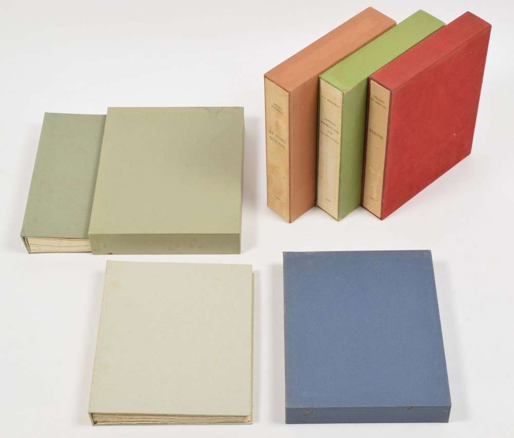 Wrapper and chemises more or less foxed. Comprises: (1) Les Bucoliques de Virgiles. Engraved illustrations by Marcel Roche (1952) (top of slipcase waterstained); (2) Jean Rostand. Notes d'un biologiste. Engraved ills. by Albert Flocon (1954); (3) Henri Pourrat. Le temps qu'il fait. Engraved ills. by André Jacquemin (1956); (4) Jean-Jacques Rousseau. Lettres élémentaires sur la botanique. Colour woodcuts by Paul Baudier (1957); (5) Gérard de Nerval. Sylvie. Engraved ills. by Jean-Pierre Blanchet (1963). (total 5)