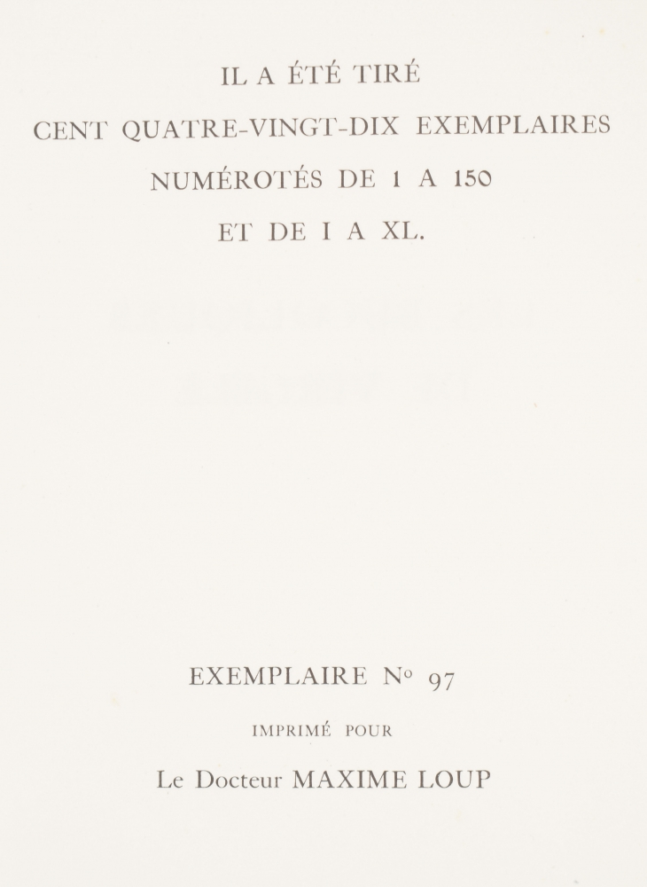 all printed in Paris by Fequet and Baudier (text) and Georges Leblanc (illustrations) for Les Pharmaciens Bibliohiles in 200 numbered copies (each no. 97 (one of 150) printed in name of Docteur Maxime Loup), 1952-1963, with original, etched/ engraved (1x colour woodcut) illustrations, all in loose quires as issued in original wrapper, in chemises and slipcases, 4to.