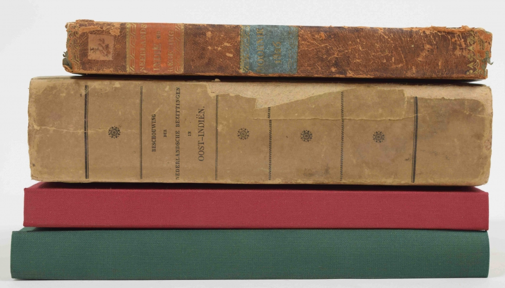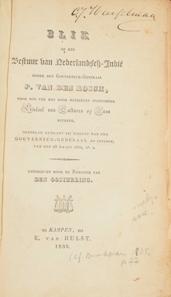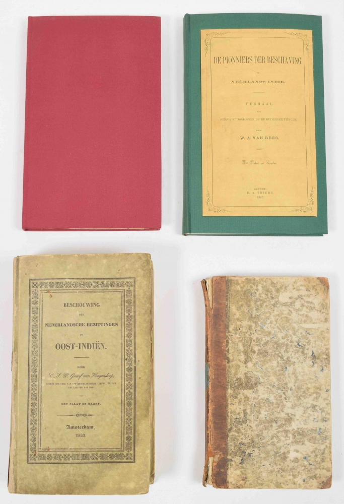 Van der Capellen. J.E. Doornik. Amsterdam, C.G. Sulpke, 1826. xvi,314 pp. Halfleather with title labels. Binding rubbed, leather on upper joint damaged, old name on title and stamp on reverse of title + Beschouwing der Nederlandsche bezittingen in Oost-Indiën. C. van Hogendorp & J. Olivier. Amsterdam, C.G. Sulpke, 1833. xxiv,630 p. Cased wrapper. With aquatint frontispiece and handcoloured folding map. Paper on spine dam. + Blik op het bestuur van Nederlandsch-Indië onder den Gouverneur-Generaal J. van den Bosch, voor zoo ver het door denzelven ingevoerde Stelsel van Cultures op Java betreft. Uitgegeven door de redactie van Den Oosterling. Kampen, K. van Hulst, 1835. 204 p. Modern cloth. Old name on title, Voorberigt with (crossed out) old inscription on both pp. - and 1 more.