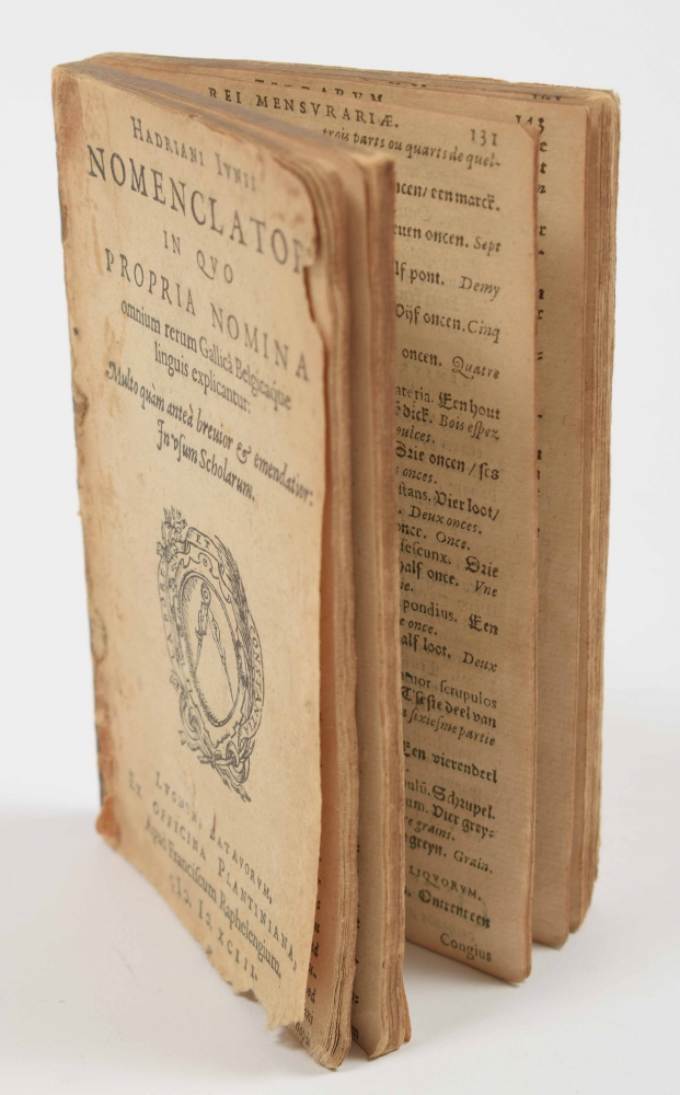omnium rerum Gallica Belgicaque linguis explicantur: Multo quam antea brevior & emendatior: In usum Scholarum. Leiden, Plantin printers, Franciscus Raphelengius, 1593.