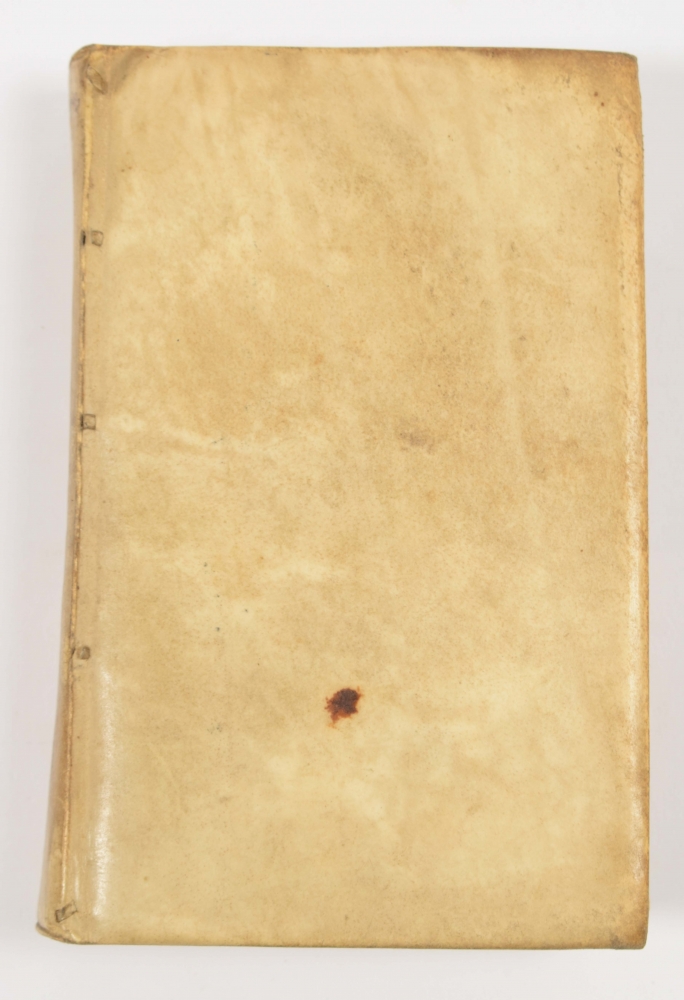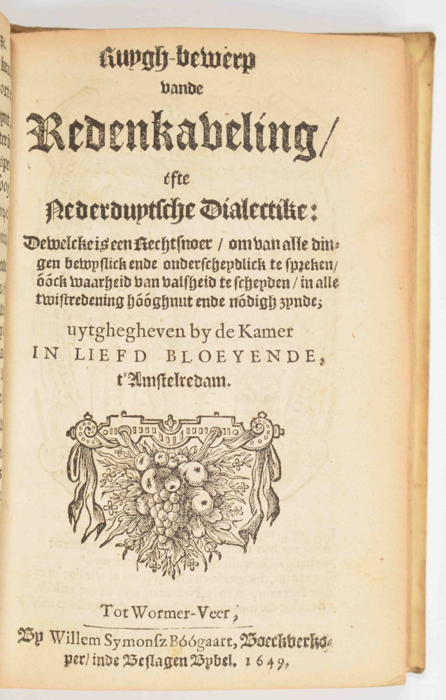 Small 8vo, limp vellum, 4x title with vignette, verso woodcut with caption, (14),112; 182; 23 and 30 pp.; Voorrede by D.D. Koornhert and the 4 parts: 1. Tweespraack vande Nederduitsche letterkunst; 2. Ruych Bewerp van de Redekaveling; 3. Kort begrip des Redenkavelings in slechten rym; 4. Rederyck-kunst in rym op het kortst vervat. Ms. title on spine, first title page trimmed short. Good copy.