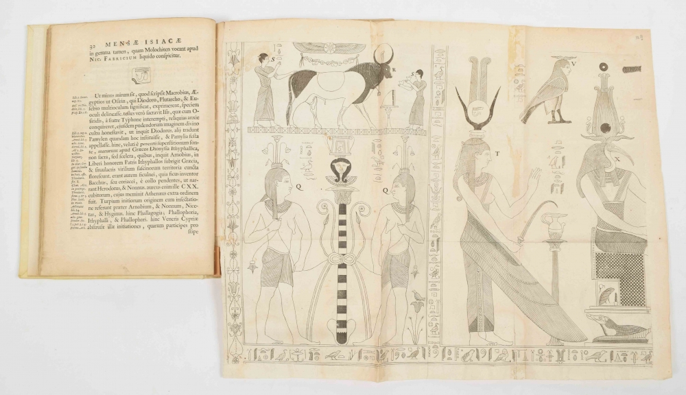 qua sacrorum apud Aegyptios ratio & simulacra subjectis tabulis aeneis simul exhibentur & explicantur. Accessit ejusdem authoris de MAGNA DEUM MATRE (...) ex Kirchero Chifletioque interpretatio. Nec non Jacobi Philippi Tomasini MANUS AENEA, & de vita rebusque Pignorii dissertatio. Amsterdam, Andreas Frisius, 1669. 3 parts in one vol., (8),96,(12);(6),96 pp., illlus. frontispiece with title by A. Blotelingh, complete with numerous engravings in the text of which 7 full-page, one engraving outside the text (at p. 67) and 11 folding copper engravings, each part with title page with vignette, parts 2 and 3 consecutively paged. Modern faux-vellum, small 4to.