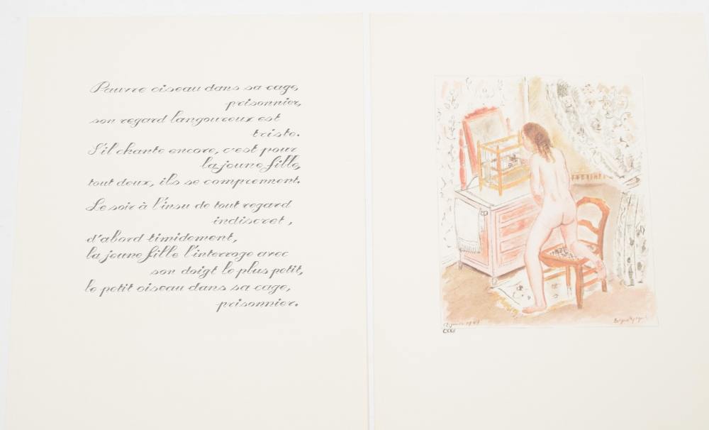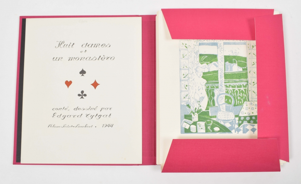 Huit dames et un monastère. Conté, dessiné par Edgard Tytgat. Woluwe Saint-Lambert. Brussels, Laconti, 1974. Loose-leafed as issued in cloth portfolio in slipcase. One of 450 copies (CDX) with colour woodcut signed with green stamp.