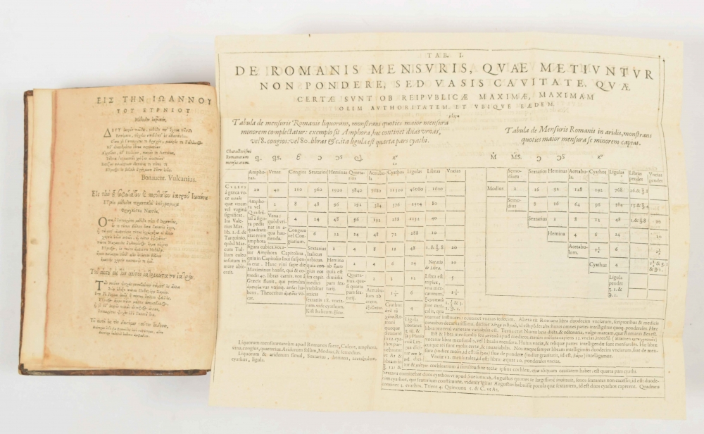 Johannes Heurnius. Leiden, Plantin, 1590-1608. (8),518,(22);(16),351,(8);(8),(66),(6);(4),127,(5);(8),62,(2) p. Leather with gilt stamping, 21 x 16 cm. Contains: (1) Paxis medicinae nova ratio: qua, libris tribus methodi ad praxin medicam, aditus facillimus aperitur ad omnes morbos curandos. Reconita & emendata ab auctore, & auctior ac melior reddita: ita ut iam extremâ manu ficta, & manumissa ab eo sit. 1590. 10 woodcuts in the text, 3 folding tables. (2) De morbis qui in singulis partibus humani capitis insidere consueverunt. 1594. (3) De morbis oculorum, aurium, nasi, dentium et oris, liber, editus post mortem auctoris, ab eius filio Othone Heurnio. 1608. (4) De morbis pectoris liber, editus post mortem auctoris, ab eius filio Othone Heurni. 1608. (5) De morbis ventriculi liber: Responsum ad nobiliss. & ampliss. praesidem, Ioannem Banchemium, & consiliarios Supremae Curiae Hollandiae, Zelandiae, & Westfrisiae, nullum esse aquae innatationem lamiarum indicium: Oratio de medicinae origine, Aesculapidum, ac Hippocratis stirpe & scriptis. Edidit post mortem auctoris eius filio Otho Heurnius Ultrajectinus. 1608.
