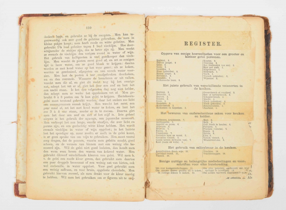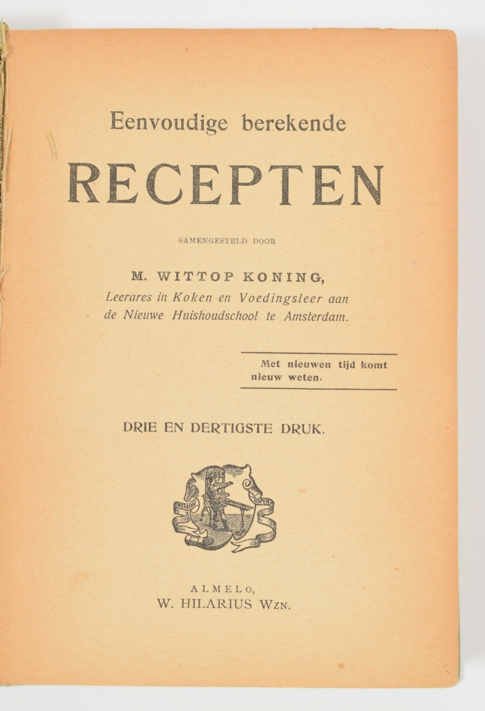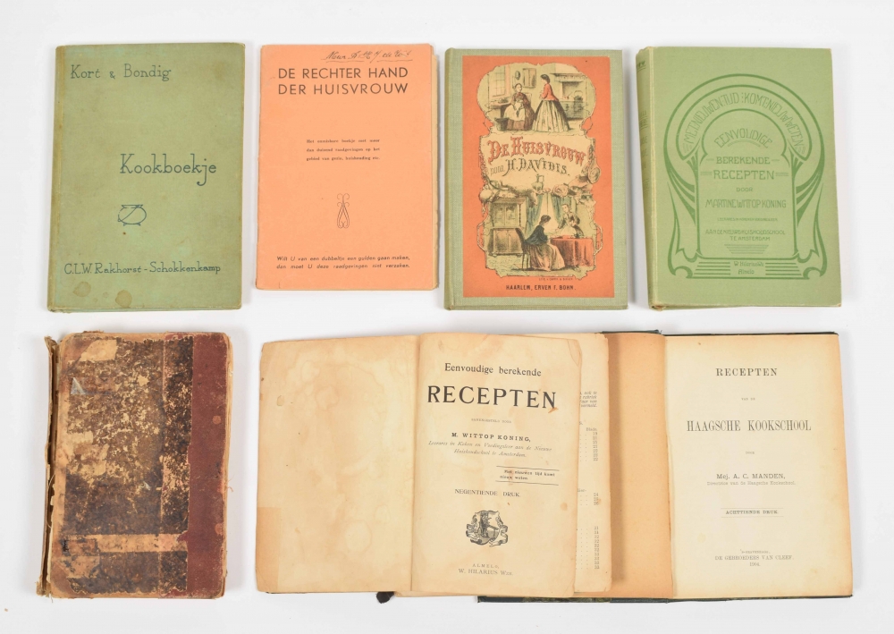 Mej. A.C. Manden. The Hague, Gebroeders Van Cleef, 1904. 354 p. Halfcloth, gilt title on spine + Eenvoudige berekende recepten. Martine Wittop Koning. Almelo, W. Hilarius. Cloth. 324 p. Binding tender from block, first 2 leaves loose in binding + De Huisvrouw. Henriette Davidis. Haarlem, Erven F. Bohn, 1882. Cloth. 200 p. - and 4 other recipe books.