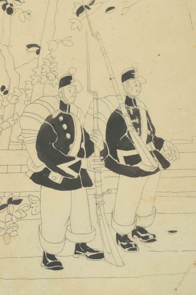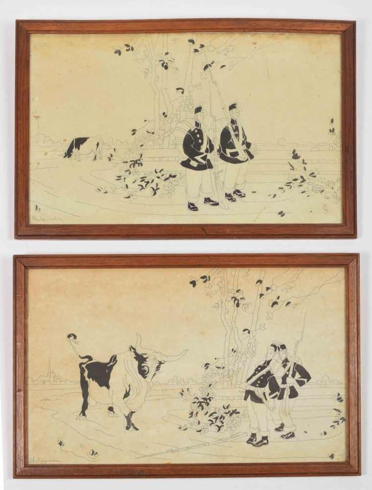 On the first drawing the two fully packed and armed male soldiers still stand proudly next to the open gate of the meadow in which the bull is grazing. On the second drawing the bull is coming towards them, which leads to a scared response of the soldiers. (total 2)