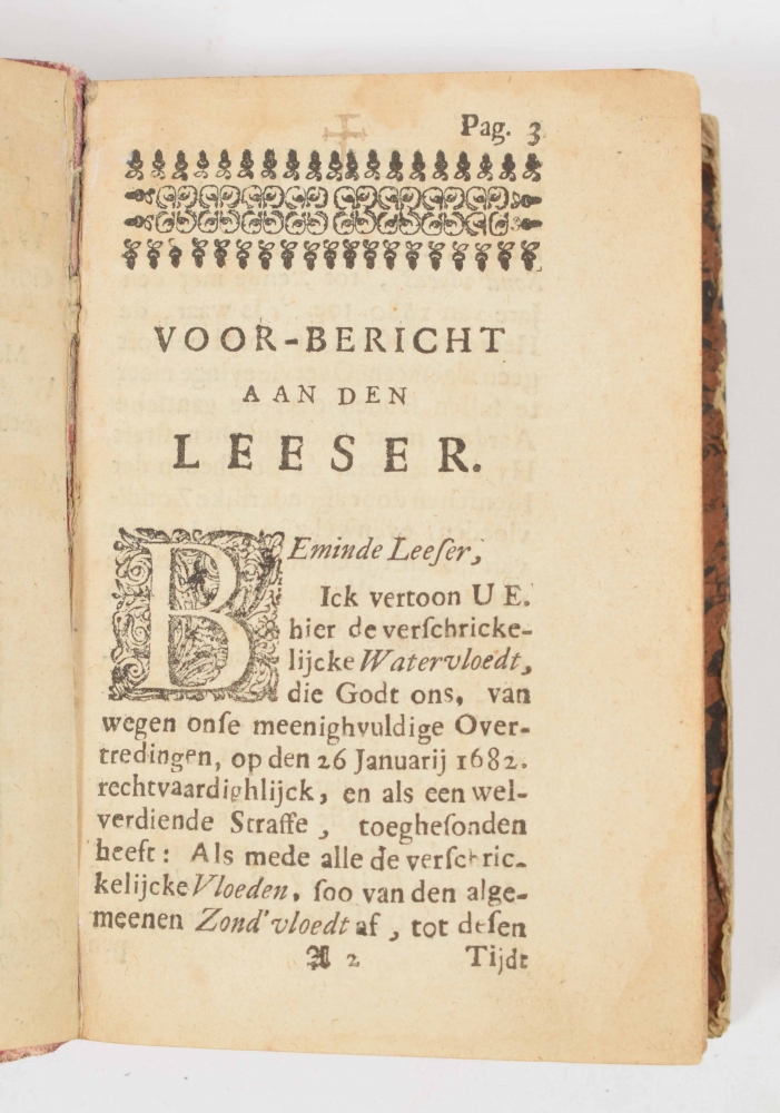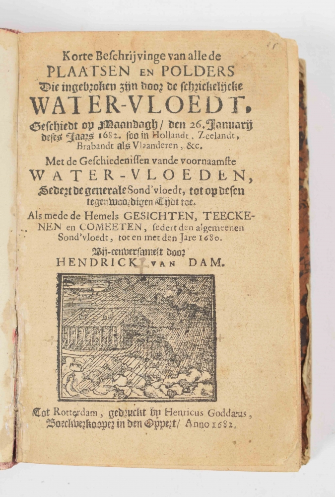 die ingebroken zijn door de schrickelijcke water-vloedt, geschiedt op maandagh, den 26. Januarij deses jaars 1682 (…). Met de geschiedenissen van de voornaamste water-vloeden, sedert de generale sond'vloedt, (…) Als mede de hemels gesichten, teeckenen en comeeten (…) Hendrick van Dam. Rotterdam, Henricus Goddaeus, 1682. 3 parts in one vol. 107,(1),180 p. With 2 identical woodcuts (Noah's Ark) on title p. and woodcut of a comet on the 3rd title p. Bound with: Ingebroken Alblasser-Waert, in Zuyd-Hollandt, Vervangende desselfs Situatie, Grootte, Dijckagien, oude ende Nieuwe Inbreuken, &c. Midtsgaders, het naerder Inbreken van den Souwen-dyk (...) een Byvoegzel Rakende de Overstroomingen van den Alblasser-Waert (...) Als mede acht authentyke stukken rakende de tegenwoordige overstrooming. Leiden, Jan van Oudenhoven, 1741. (12),86,(2),34,(2),30,20,96 p. 8vo. Halfleather with marbled boards. Binding sl. worn, several pp. sl. waterstained.