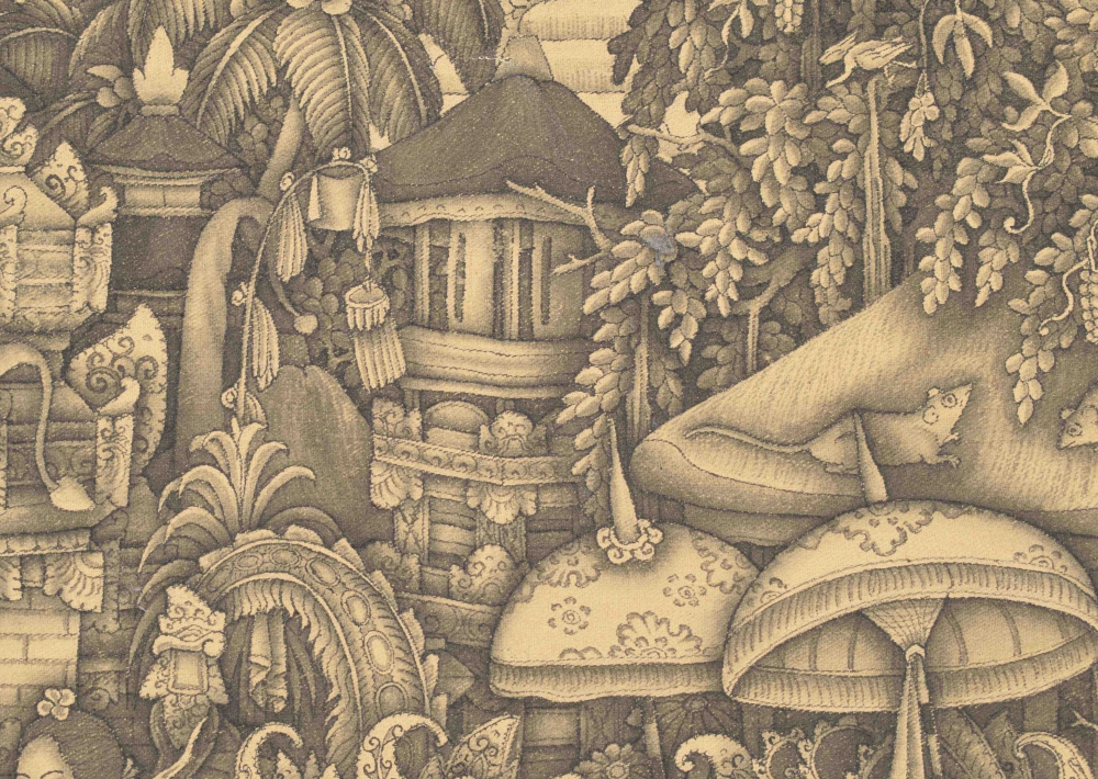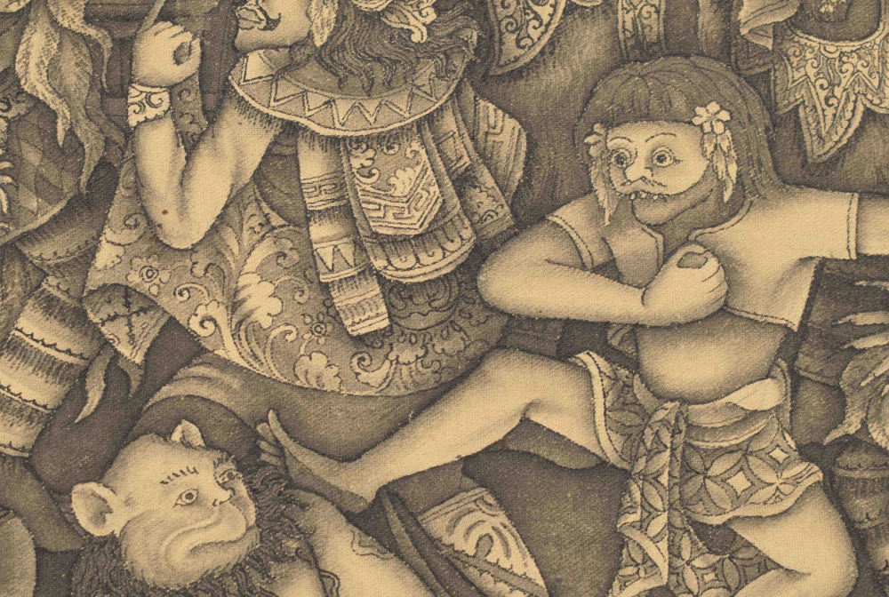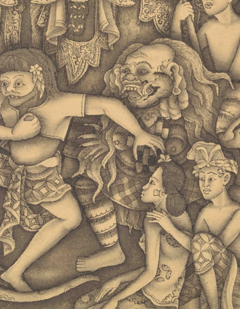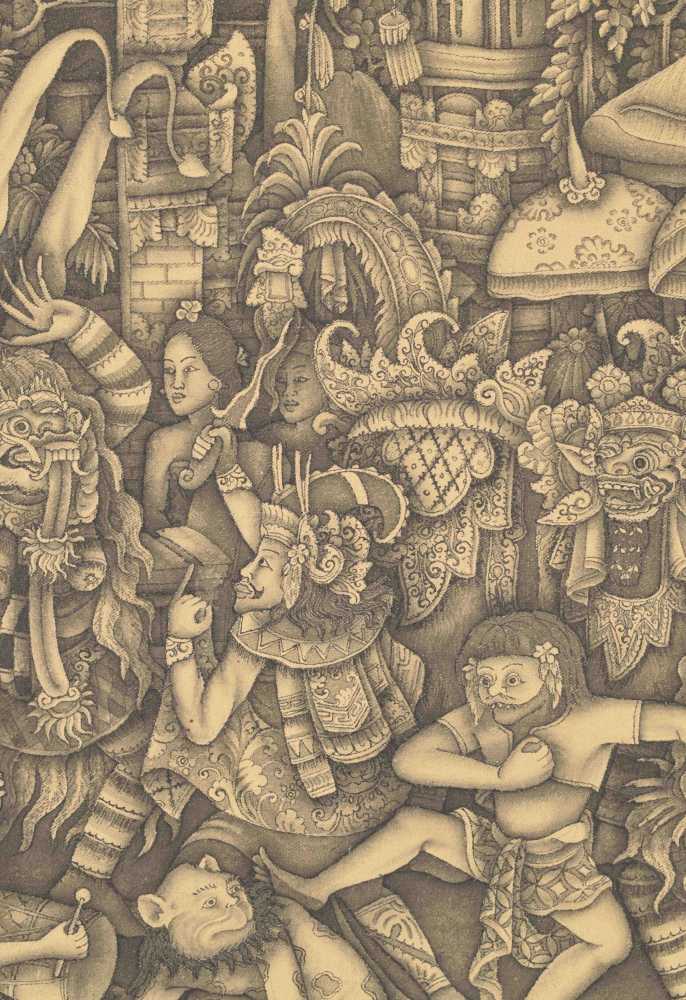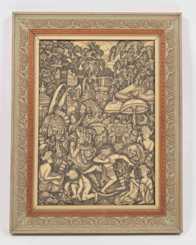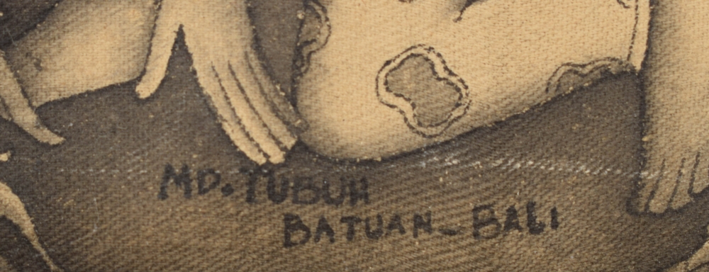 Batuan depiction of dancing figures. Watercolour on canvas. Signed MD Tubuh Batuan Bali. In original frame. 32 x 46 cm.