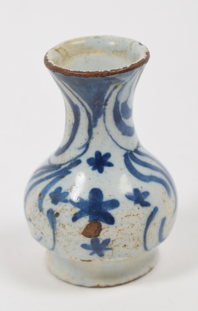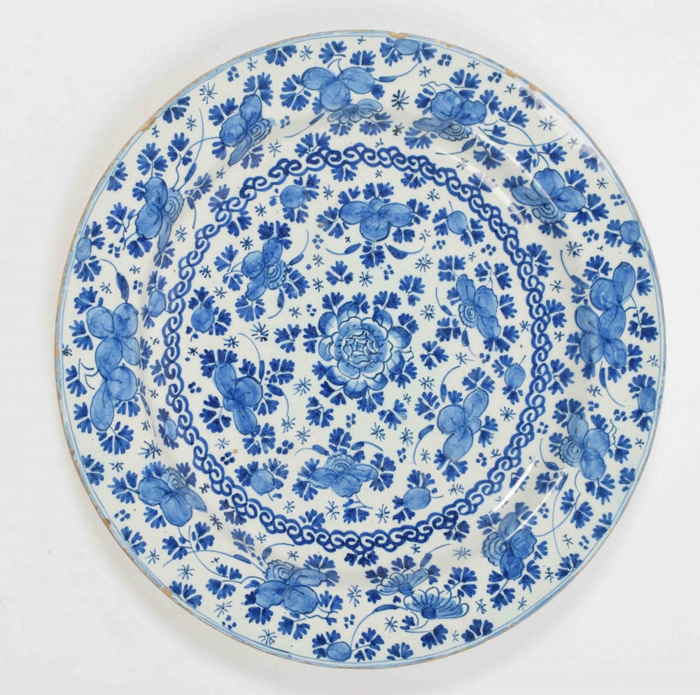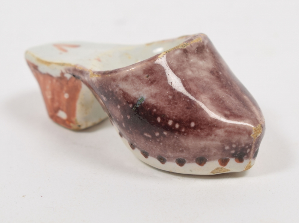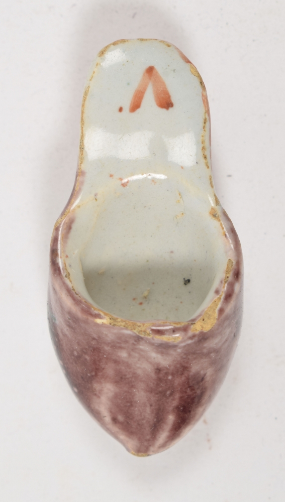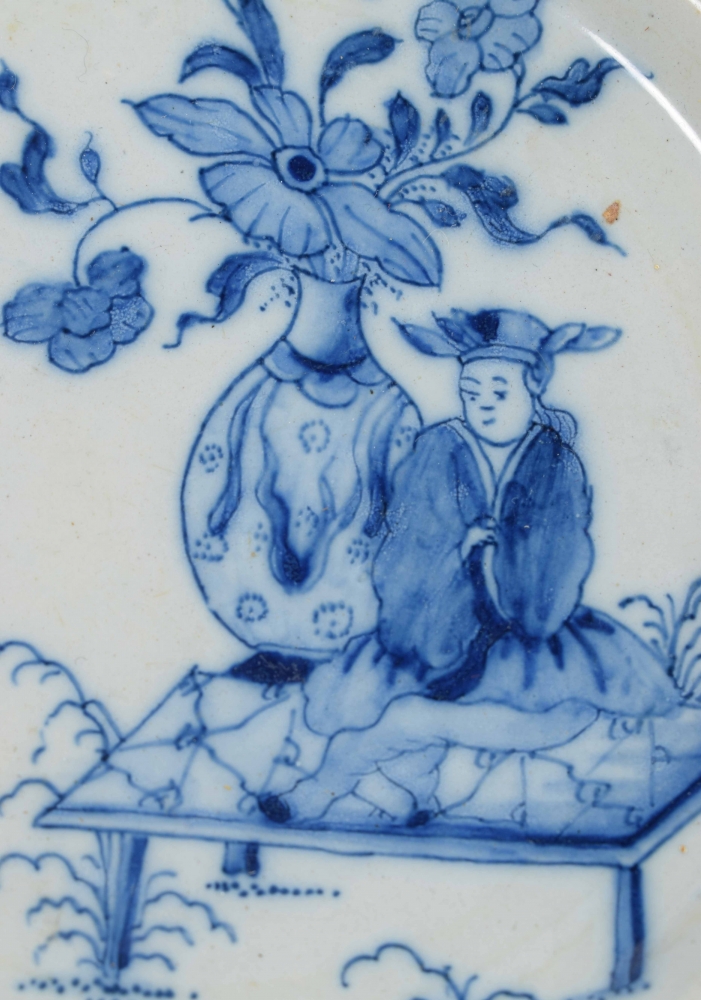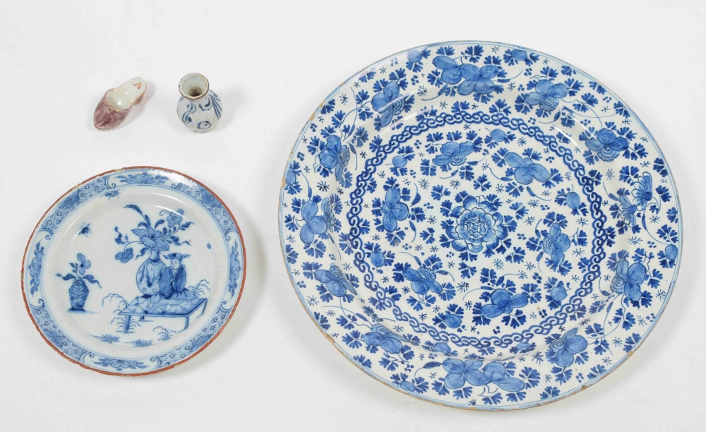 Plate with blue-white Chinoiserie decor. De Grieksche A (1765-68). Diameter 19 cm + Miniature shoe, manganese coloured. L 6.5 cm + Miniature vase. H 6 cm - and a large dish, no trademark.