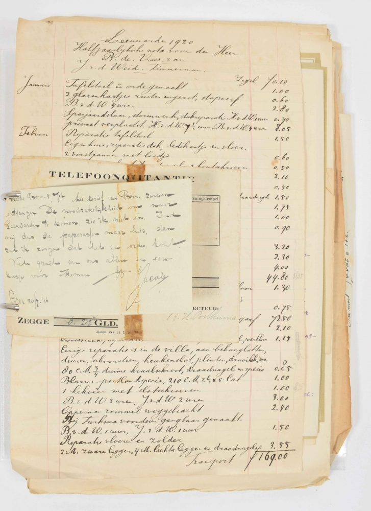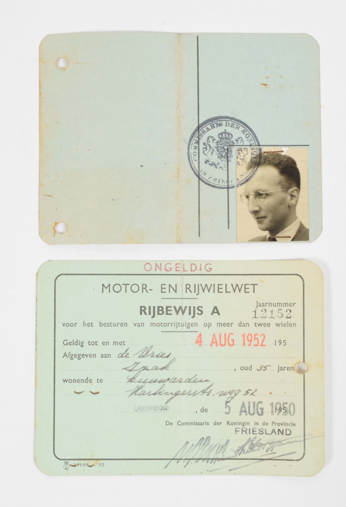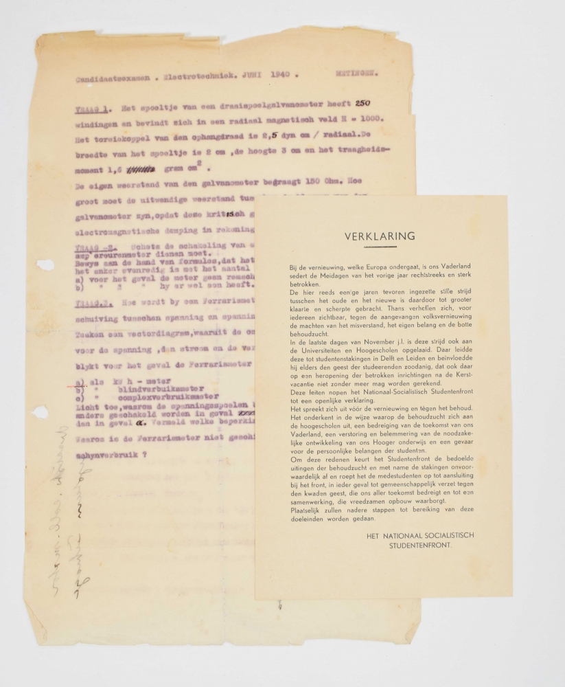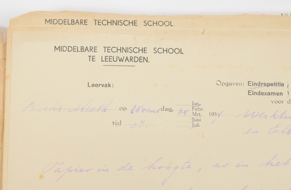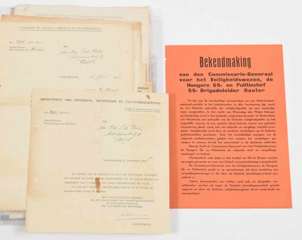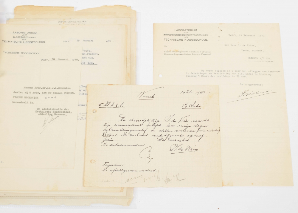 ± 65 paper documents, both printed and hand-written, incl. certificates, forms and tickets. Extensive archive of Izak de Vries (1915-2009), student and carrier for the Joodse Raad [Jewish Council]. Delft, Amsterdam, Leeuwarden, The Hague and more Dutch towns, 1940-46, most early 1940s. All but one in Dutch. Incl. ± 180 personal documents on paper, incl. De Vries' early years, his education at the Middelbare Technische School Leeuwarden, etc. Various sizes. Generally in good condition; punching holes, stains, creases, tears (marginal), partly folded.