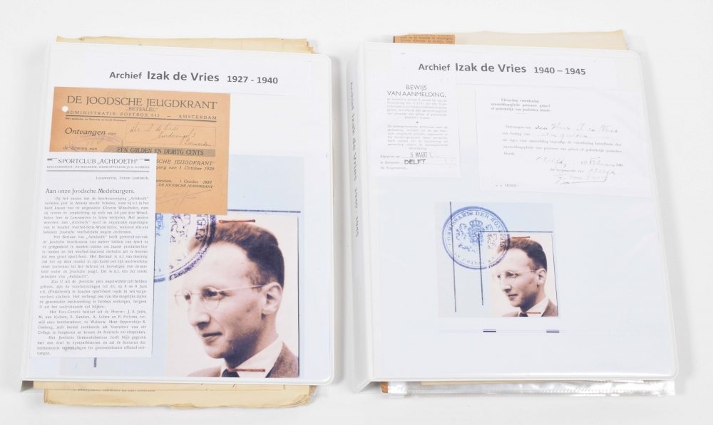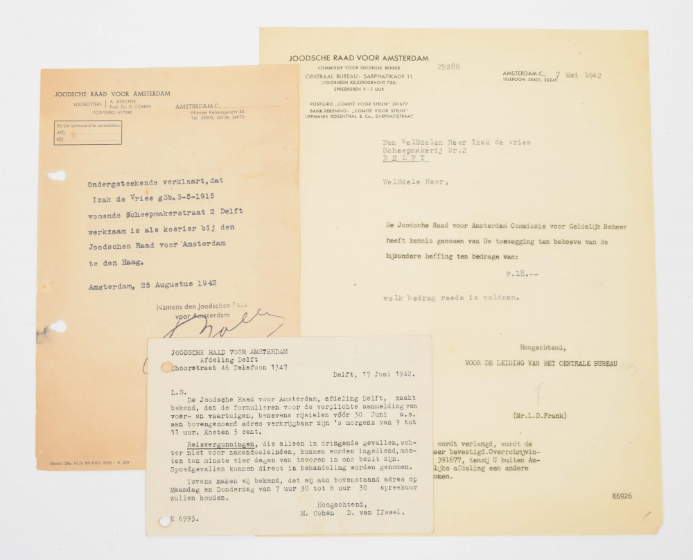 Collection incl.: (1) Aanmeldingsformulier Voor Een Persoon, Die Geheel Of Gedeeltelijk Joodschen Bloede Is. 1941, 2 copies. One form stamped "J" (Jew); (2) Sample for identification document for Jews. Printed on thick paper with space for a photo and twice stamped "J"; (3) Printed form concerning the obligation to register as a Jew as from 5 March 1941 onward; (4) Printed announcement in name of the mayor of Delft, Frederik Willem van Vloten, with an appeal to Jews to register, c. 1942; (5) Identification document of Izak de Vries as delegate of the Joodse Raad van Amsterdam. With his picture, signature and personal details. Stamped by Jewish Council. Issued on 5 August 1942; (6) Receipts for authorisation and transport on behalf of Joods Raad van Amsterdam with guide for Jews regarding sending letters, obtaining Swiss citizenship, registration as child of a "mixed marriage" etc. Printed 29 January 1943; (8) Flyer with instructions on obtaining a yellow star, printed by Joodse Raad; (9) Receipt for receiving 100 guilders in name of Lippmann, Rosenthal & Co, Sarphatistraat Bank, a cover of Nazis for confiscating Jewish property; (10) Printed lecture by Isaac Maarsen, Chief Rabbi of The Hague, for Hanukkah 1942. (11) Receipts, invoices and other documents of Joodse Raad, correspondence and notes.