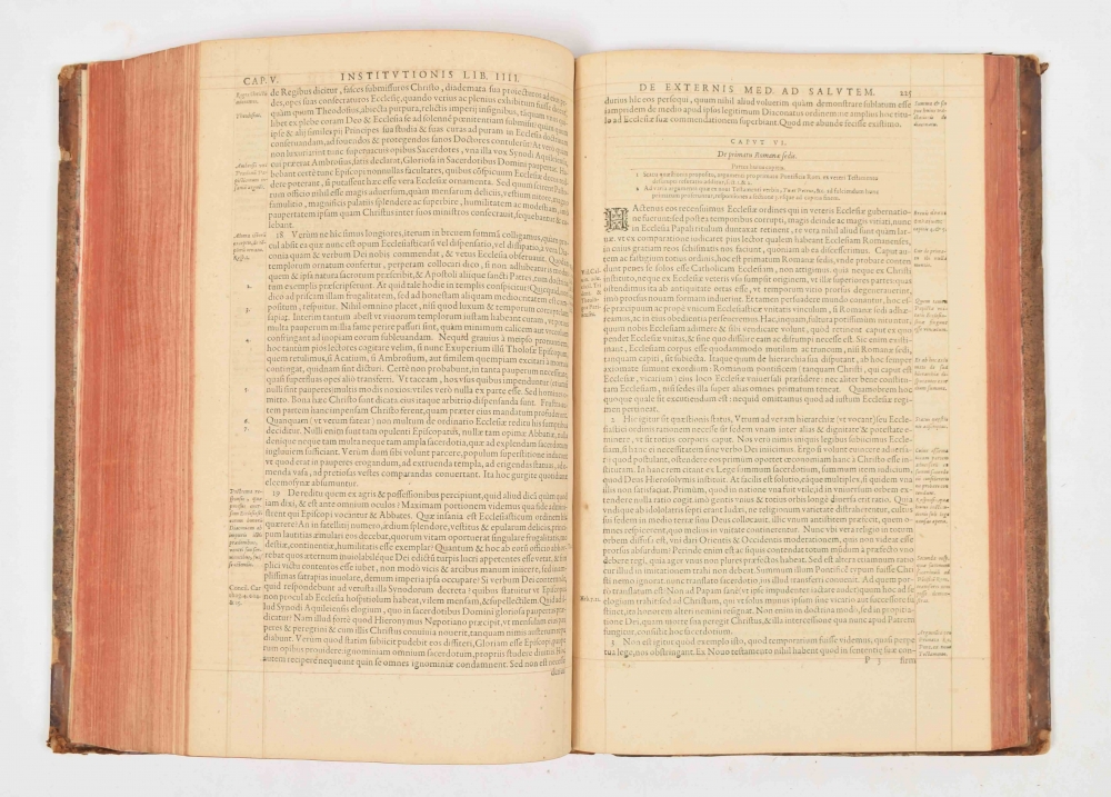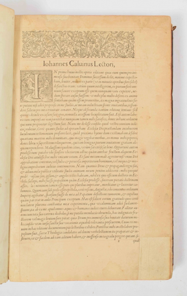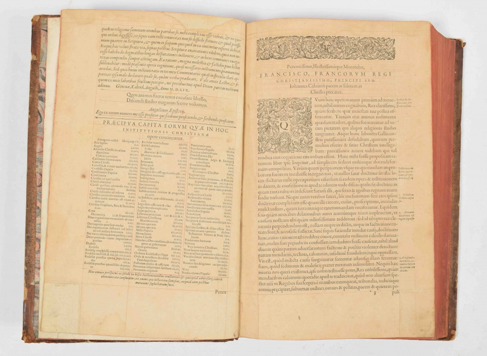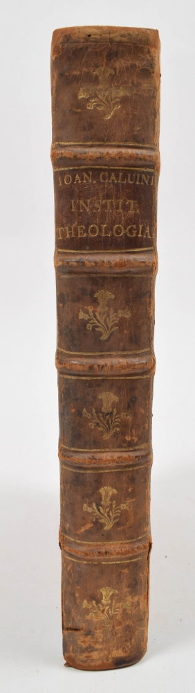 John Calvin. Book I, II, III and IV. Geneva, 5th ed., (1559). (105), 312 leaves. With woodcut initials and decorated border. 18th-century halfleather, gilt title ticket on spine.