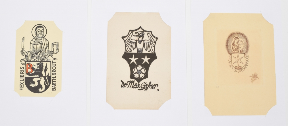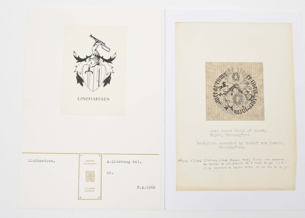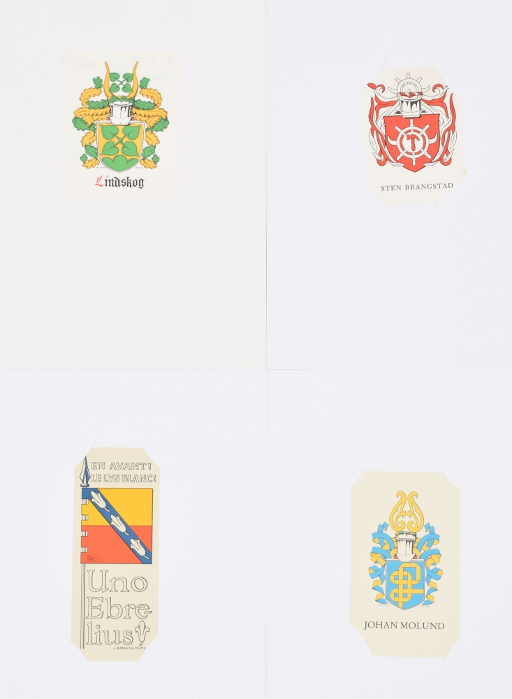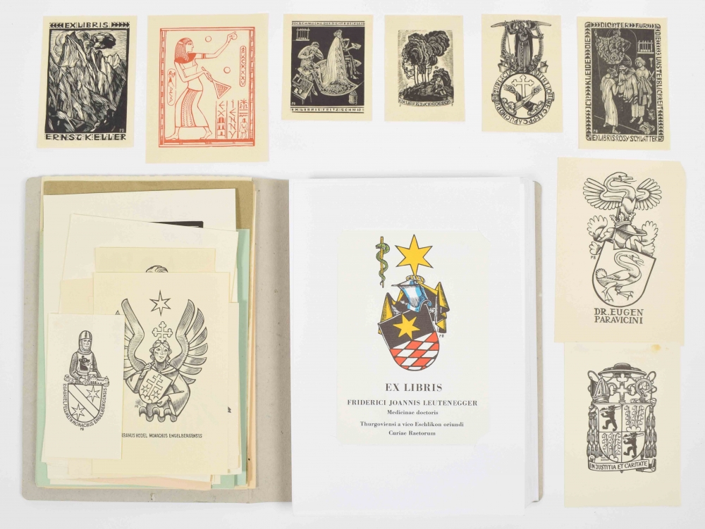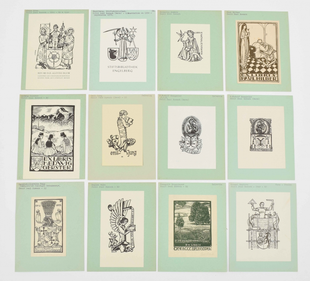 most 20th century, various media and sizes, partly Scandinavia. By C. Blaesbjerg, C. Sörensen, G. von Numers, P. Ferreira, A. Lima, L.E. de Navarra, and others, and for N. & A. Papadopoli (engraved by Stern, Paris, c. 1895) century) and M.Ch. Schefer (engraved by Provost-Blondel, Paris, late 19th century) + approx. 120 bookplates by Paul Boesch (1889-1969), mostly armorial.