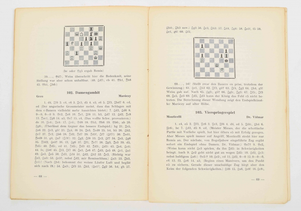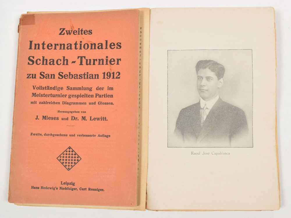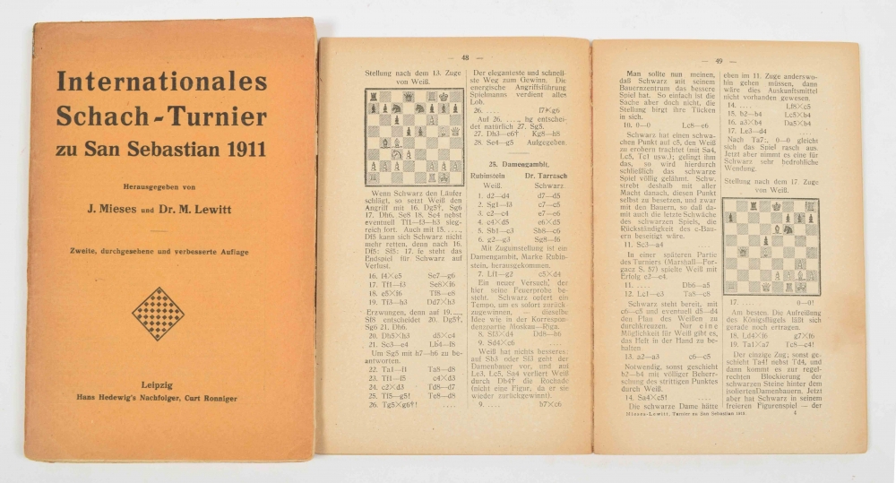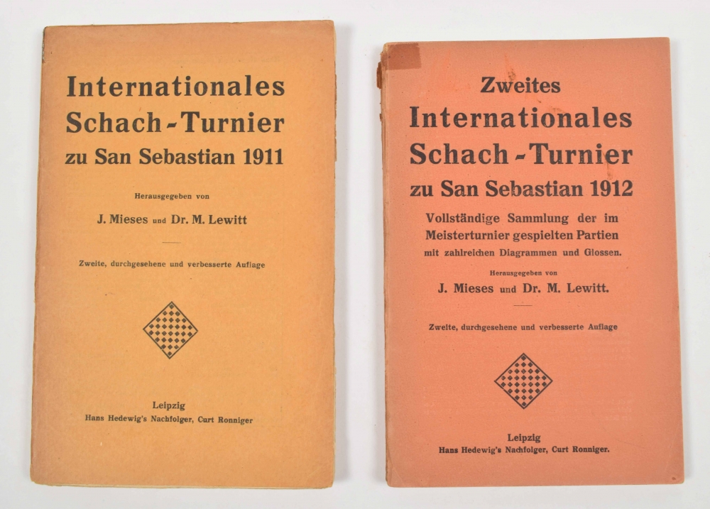 1. Internationales Schach-Turnier zu San Sebastian 1911. J. Mieses und Dr. M. Lewitt. Zweite durchgesehene und verbesserte Auflage. Leipzig. Hans Hedewig's Nachfolger. 1919. Original wrapper with title, 162,(2) pp. with overview photo, games, opening moves and diagrams. Capablanca won before Rubinstein. LN 5305. 2. Zweites Int. Schach-Turnier zu San Sebastian (...) J. Mieses und Dr. M. Lewitt. 2e Auflage. Idem. Idem. 1920. Original wrapper with title, 143,(5) pp. with all games, diagrams, opening moves and tables. LN 5313.