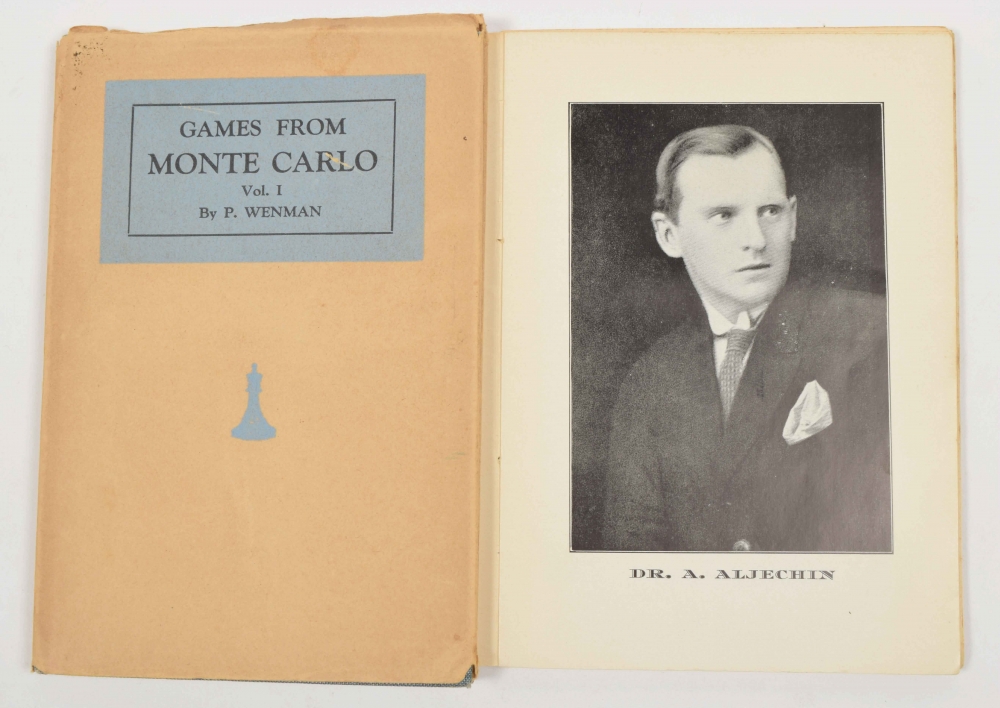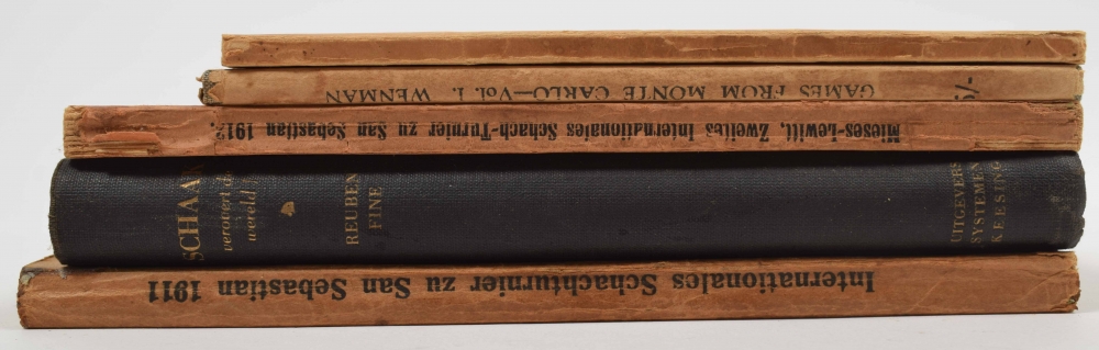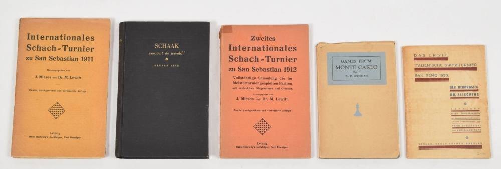3. Das Erste Italienische Grossturnier San Remo 1930. Der Rekordsieg Dr. Aljechins. Franz Chalupetzky und Ladislaus Toth. Verlag Adolf Kramer. Breslau [1931]. Sewn, original wrapper with title, 93,(1) pp., 2 photos, the games and several diagrams. Alekhine won before Nimzowitsch. Rare. LN 5441. 4. Games from Monte Carlo. Volume I (= all published). P. Wenman. Whitehead & Miller Ltd. Leeds. 1945. Cloth incl. wrapper. With games from tournaments in 1901, 1902, 1903 and 1904, 87 pp. LN 5258 - and 5. Schaak verovert de wereld! Ruben Fine. N.V. Int. Uitg. en Handels mij. Amsterdam, 1946. LN 5258. (total 5)