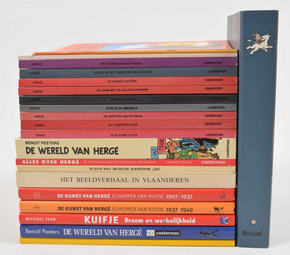 Benoit Peeters, De wereld van Hergé, Casterman, hc, 1983, 318 pp. + the revised version 1990 + Het imaginair museum van Kuifje, Vereniging voor tentoonstellingen van het Paleis voor de Schone Kunsten te Brussel, hc, 1979, 45 pp. - and 18 more. With: a folder with various items from 1980s onward.