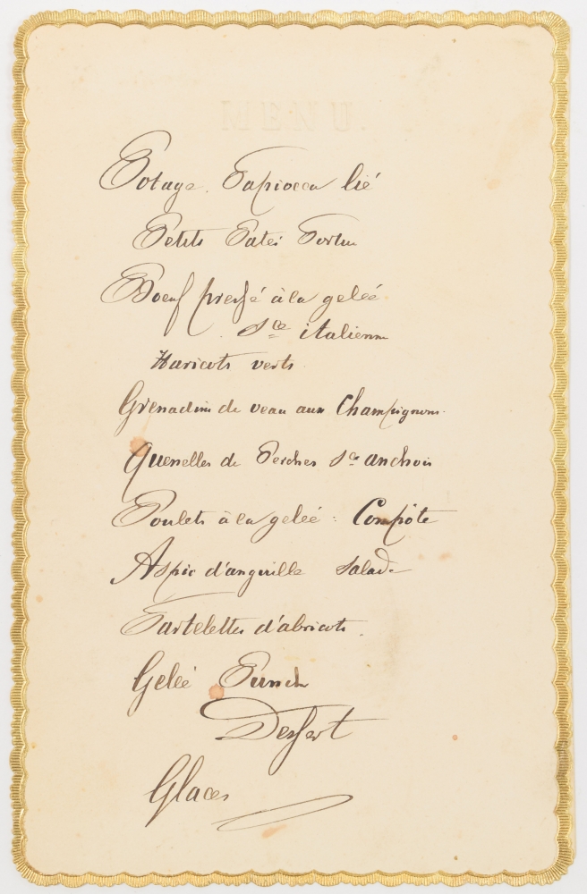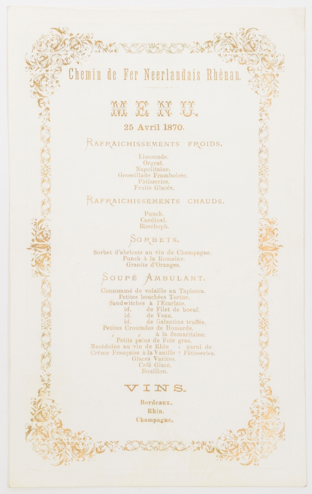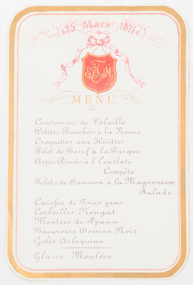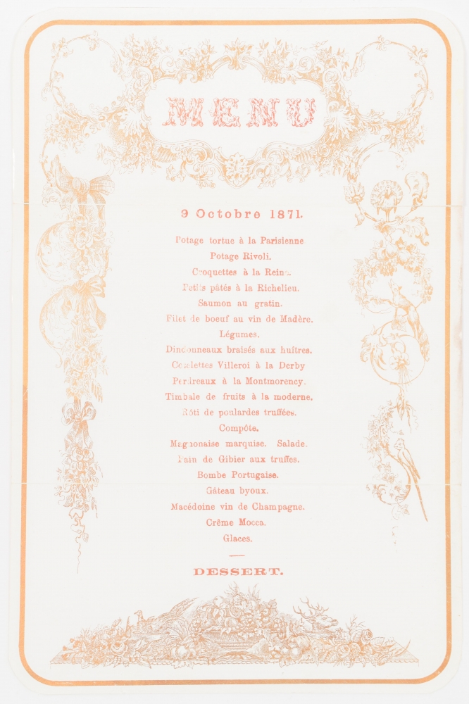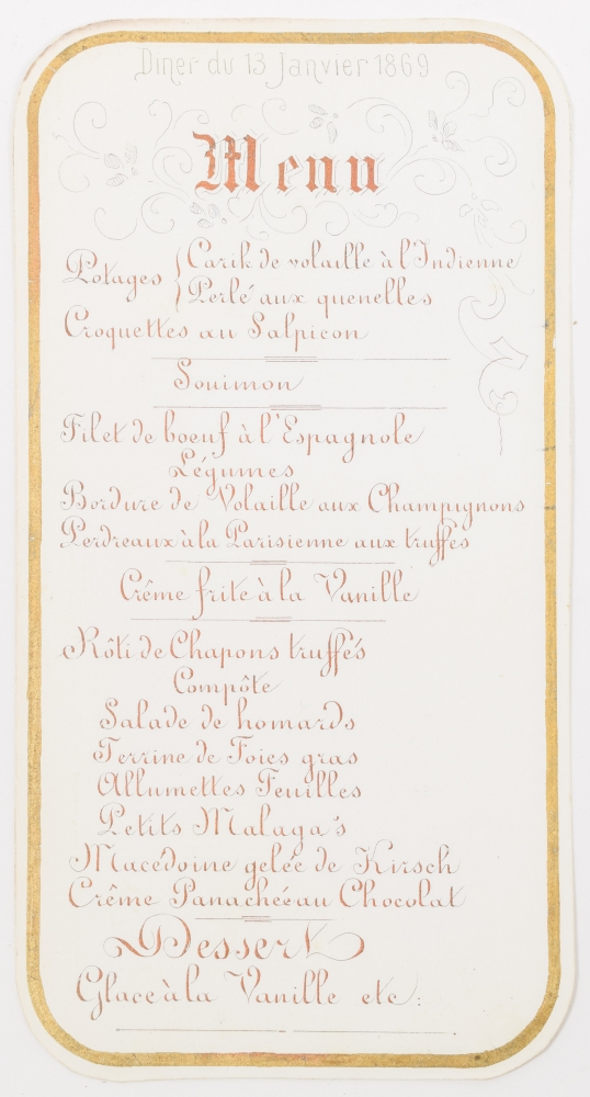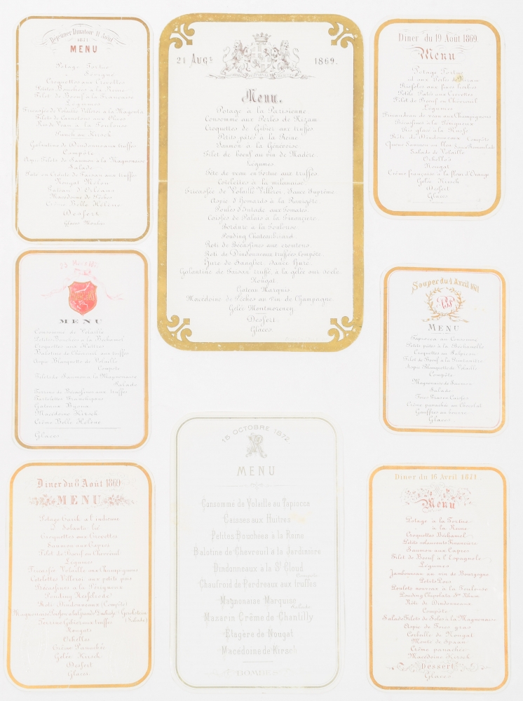 Part of the menus (from c. 1875) mention the name of the house, as Maison G.H.A. van der Velden, first in Amsterdam but later in Rotterdam (Eendrachtsweg 29C and 35).