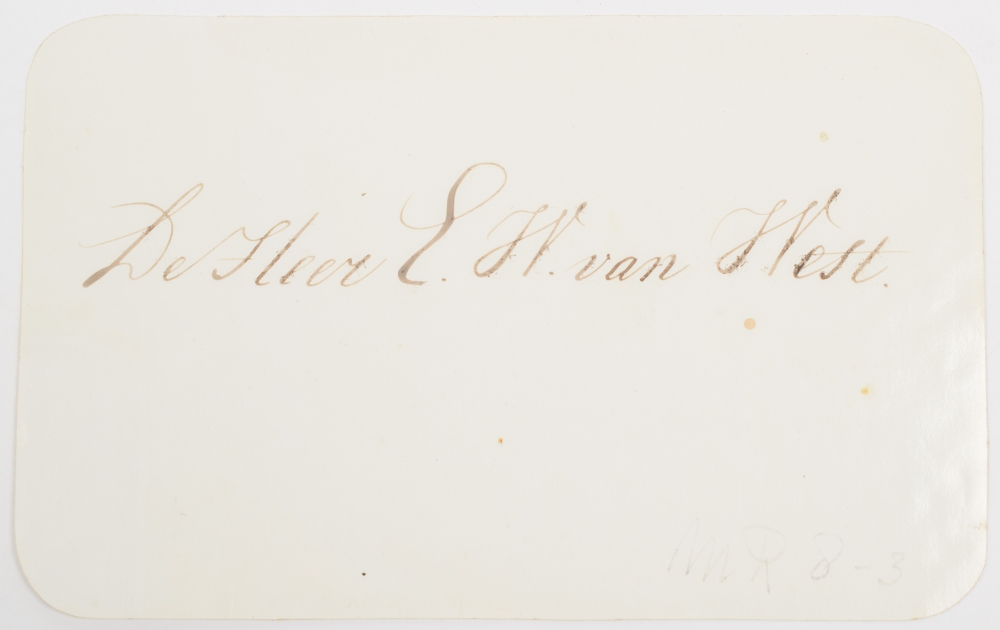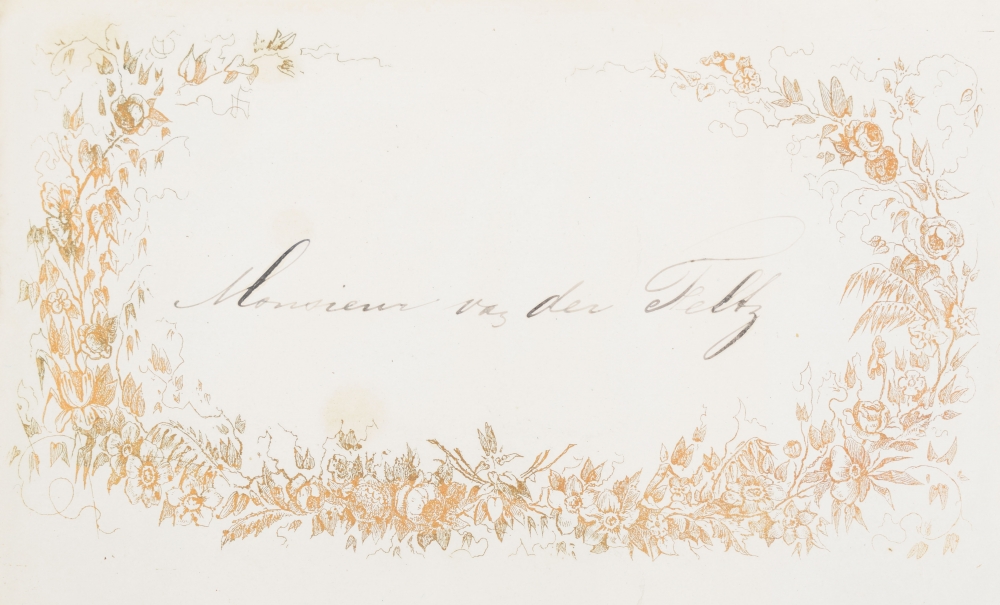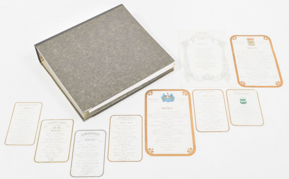 1867-1887, mostly in French, printed in gold on smooth paper (porcelain cards), and ± 15 x 10 cm, also incl. chromolithographic menus, menus in special shapes and different sizes, organised in a folder with mauscript list of the menus with the type of meny, date, house (nearly all "Van der Velden"), and host/ initials, various and some additional documentation.