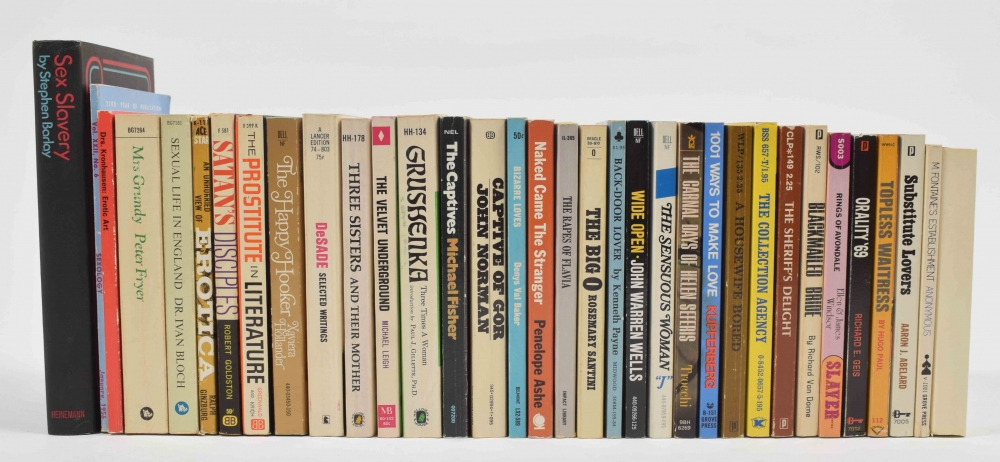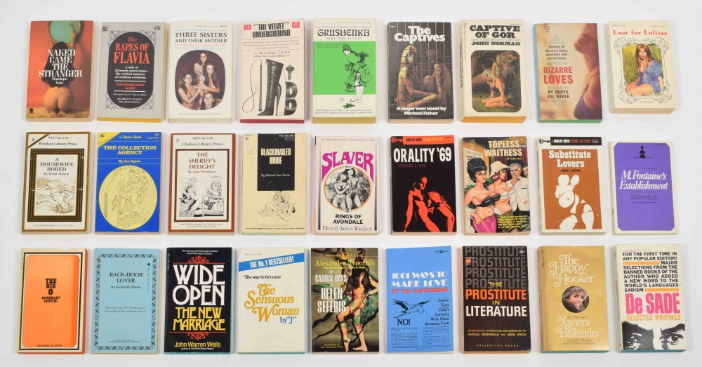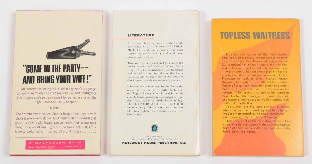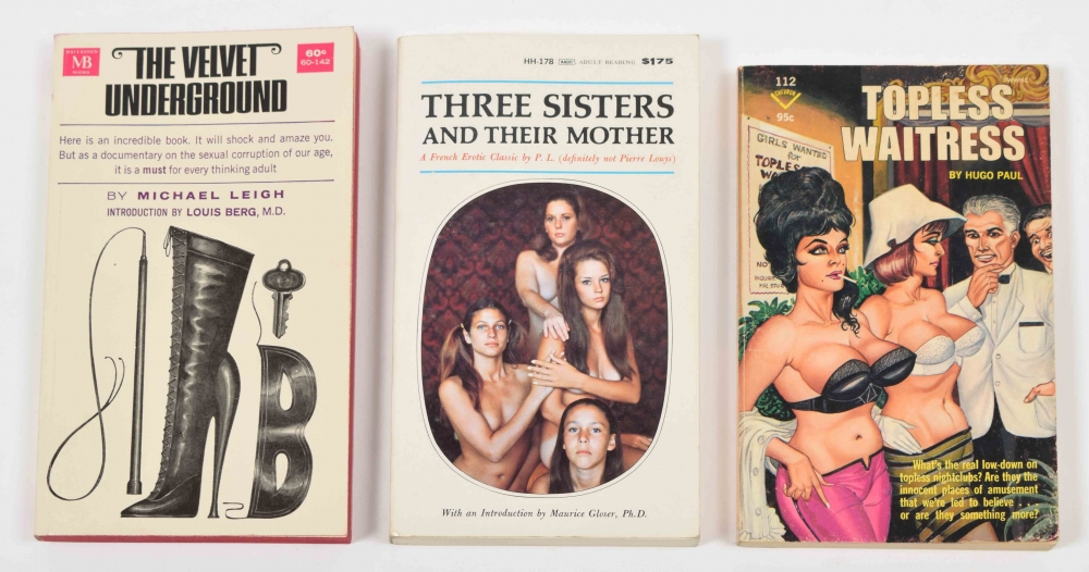 A French Erotic Classic by P. L. Los Angeles, Holloway House Publishing, 1969. Sewn + Topless Waitress. Hugo Paul. Cleveland, Chevron, 1967 + The Velvet Underground. Michael Leigh. New York, MacFadden, 1963 - and 31 more titles such as Wide Open and The Rapes of Flavia, by publishers such as Ballantine and Chelsea Library Press.