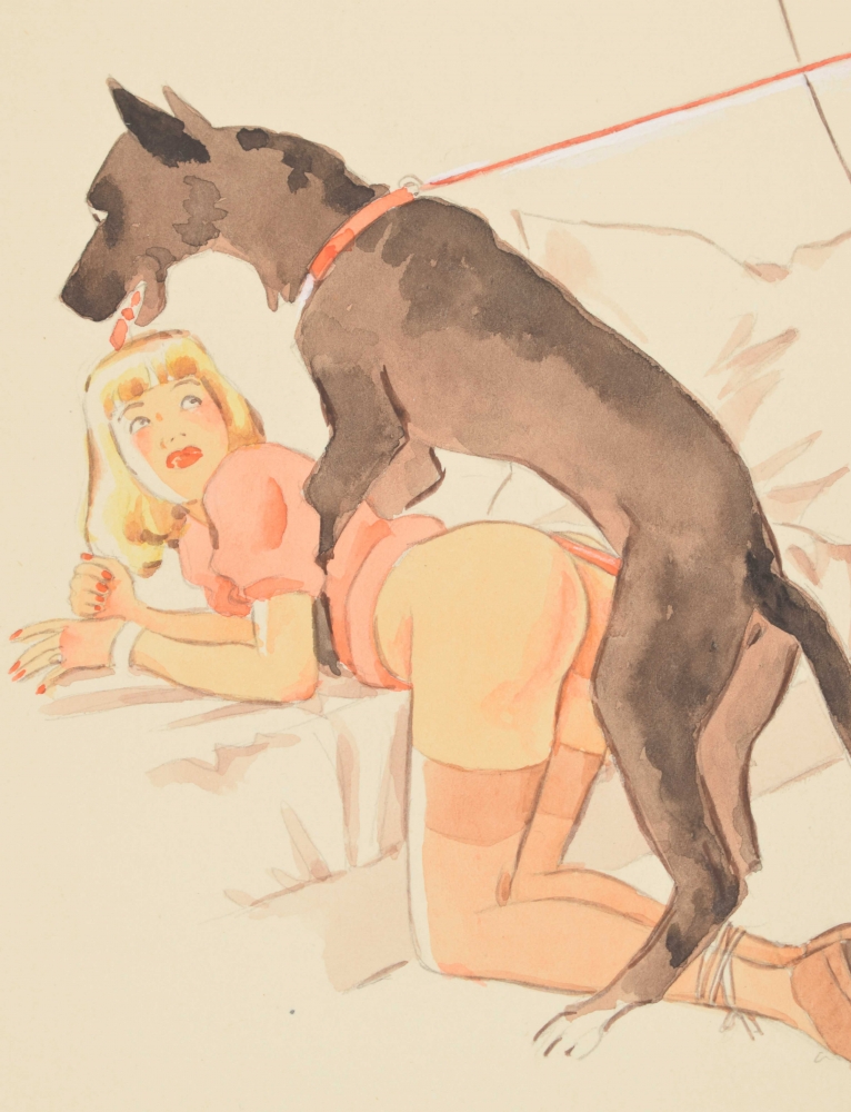 Scene with 2 women and a german shepherd. Germany, c. 1938. Watercolour. 25 x 36 cm.