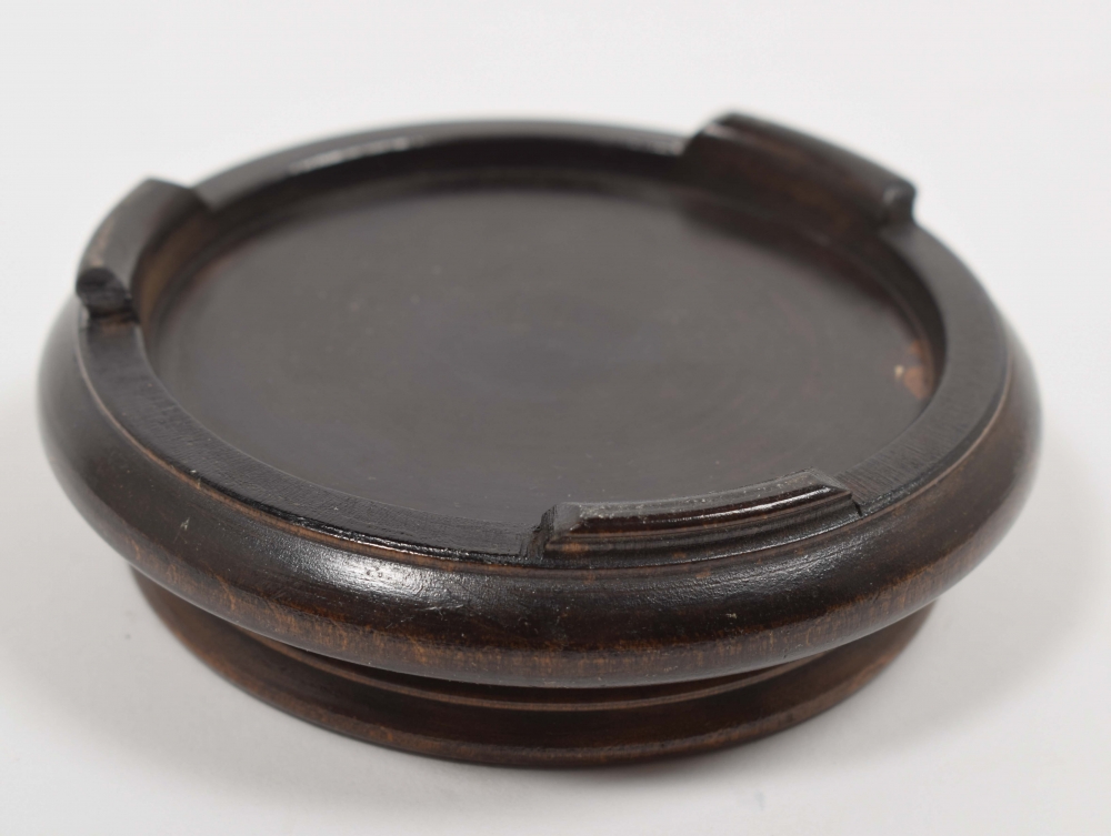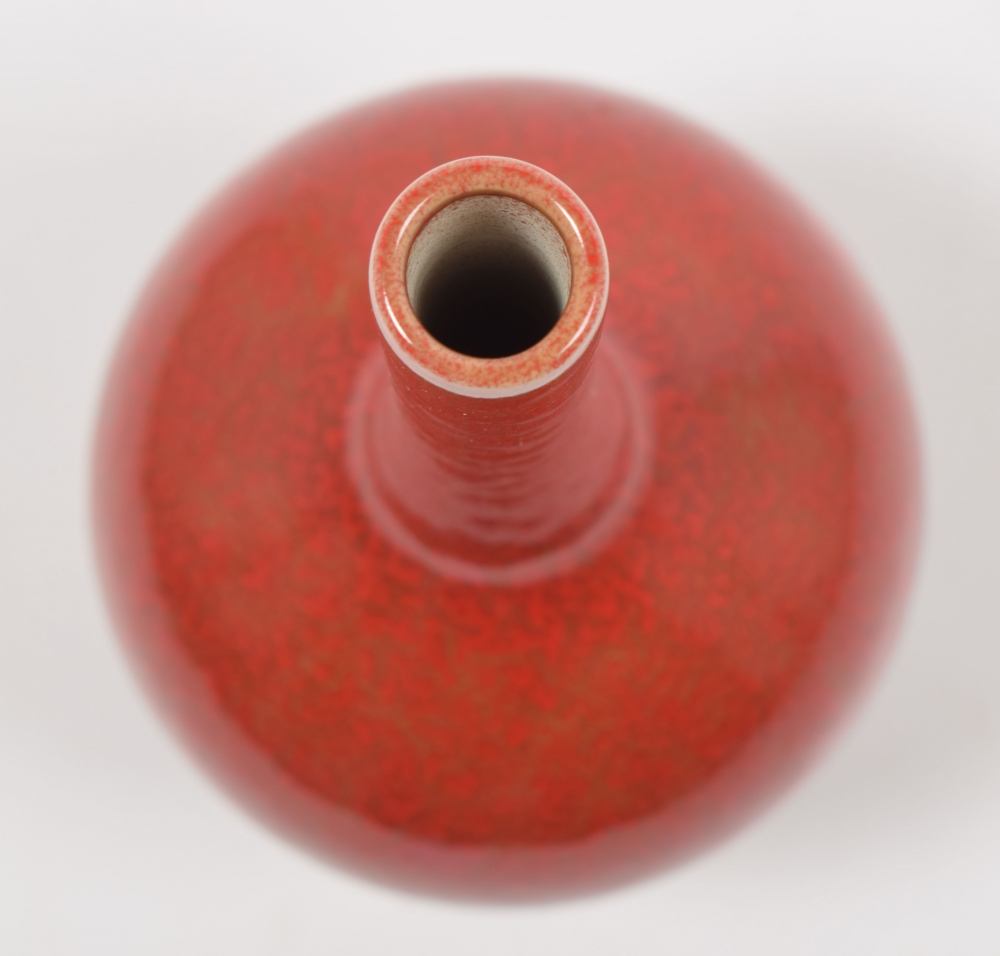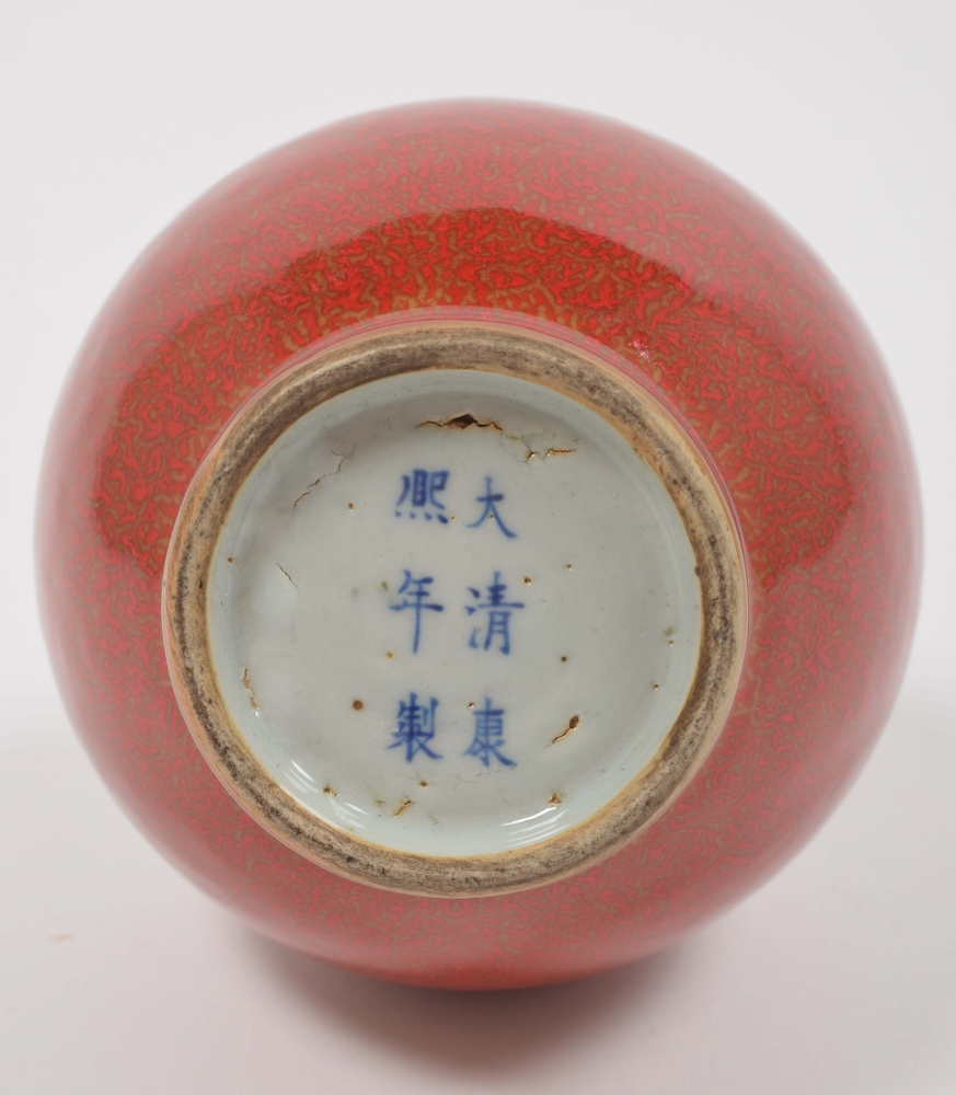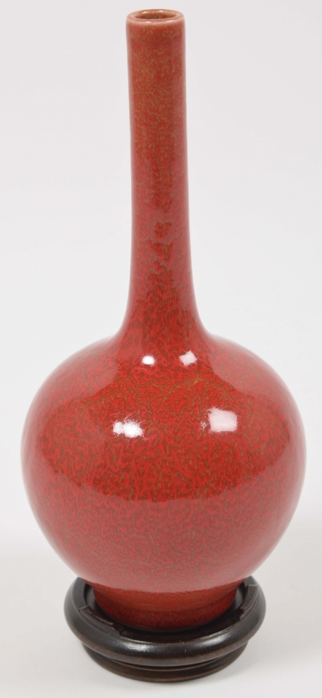Porcelain rosewater sprinkler with red flame glazing. On accompanying wooden base. Bottom marked with 6 characters. 20th century. H 28 cm.