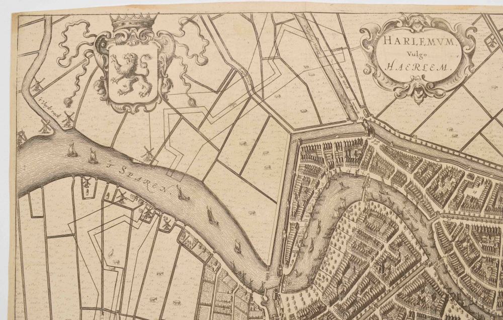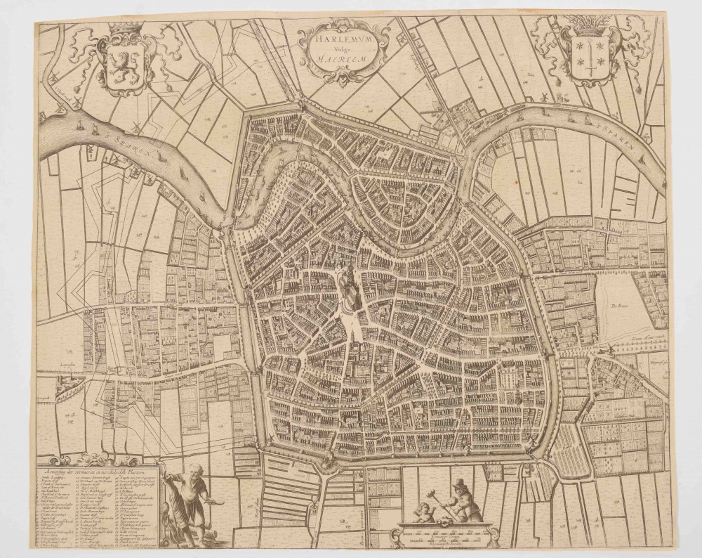 Leaf 46 x 55 cm. Map 45.5 x 54 cm. 5 small cartouches with arms of Holland, title and arms of Haarlem at the top; legend and scale below. Verso blank. Narrow margin, with folds as always. Strong impression.