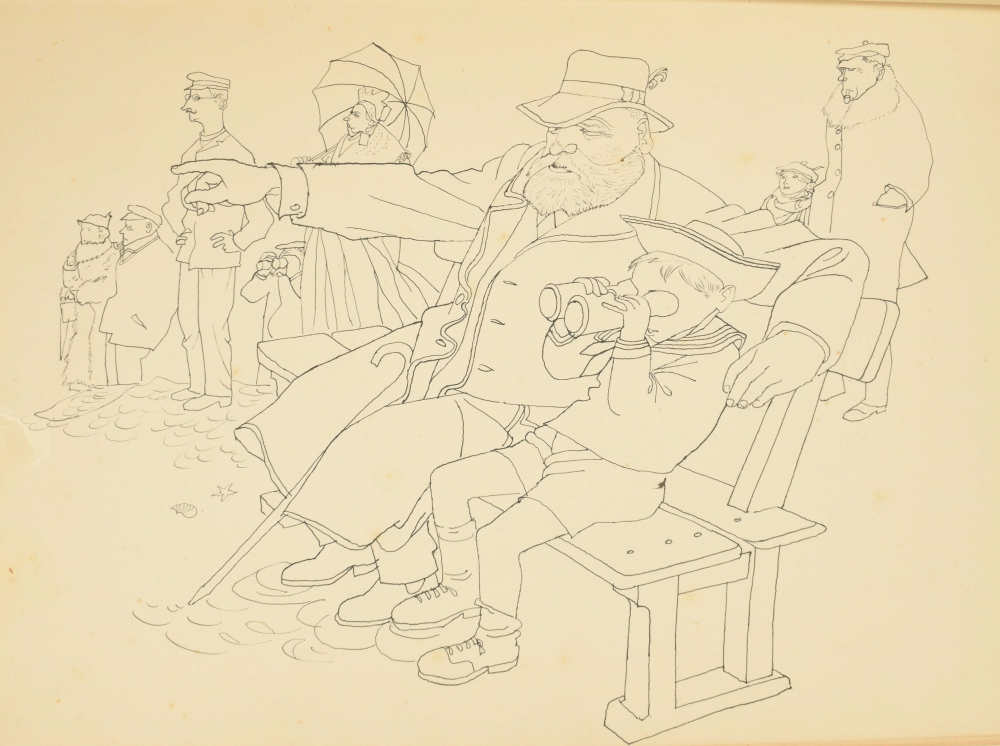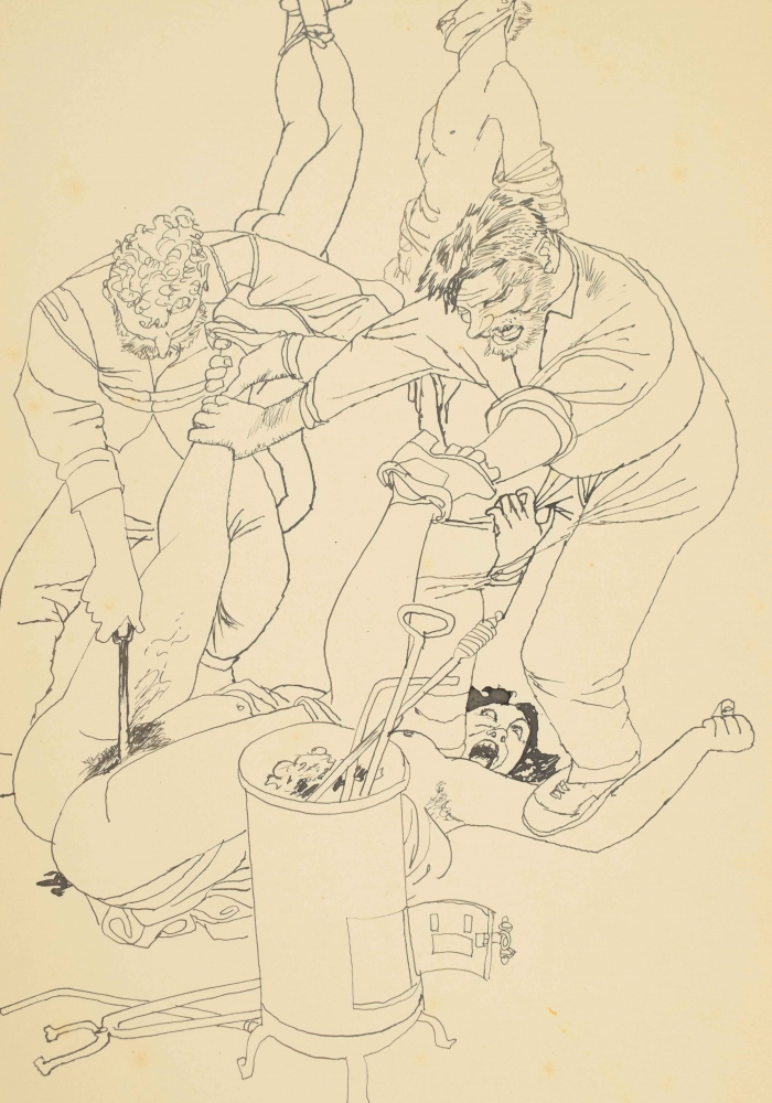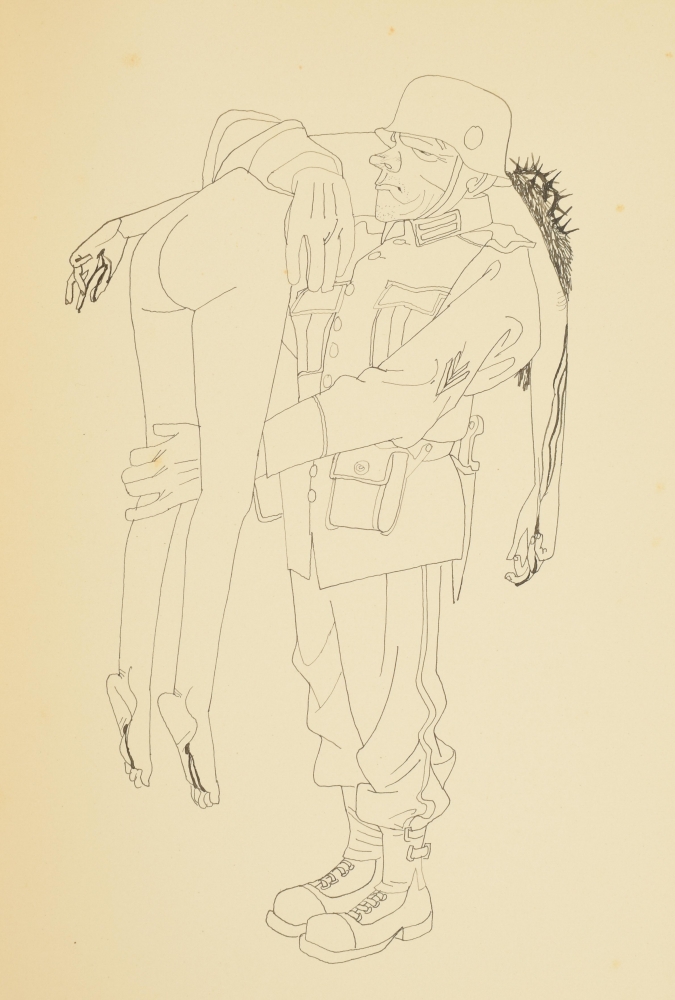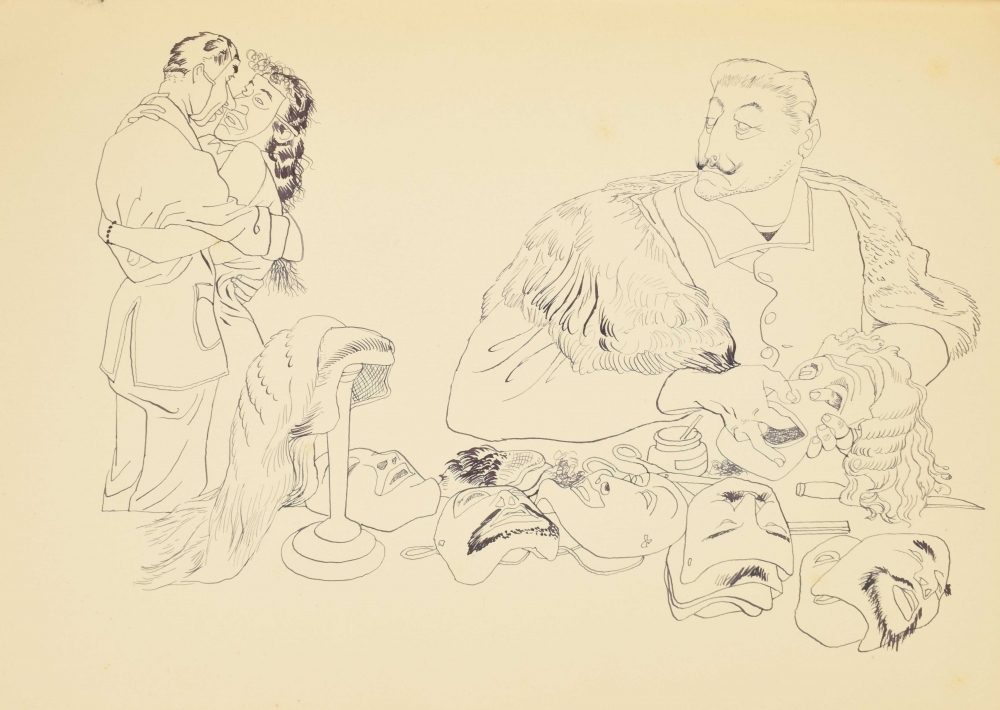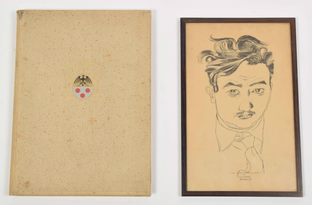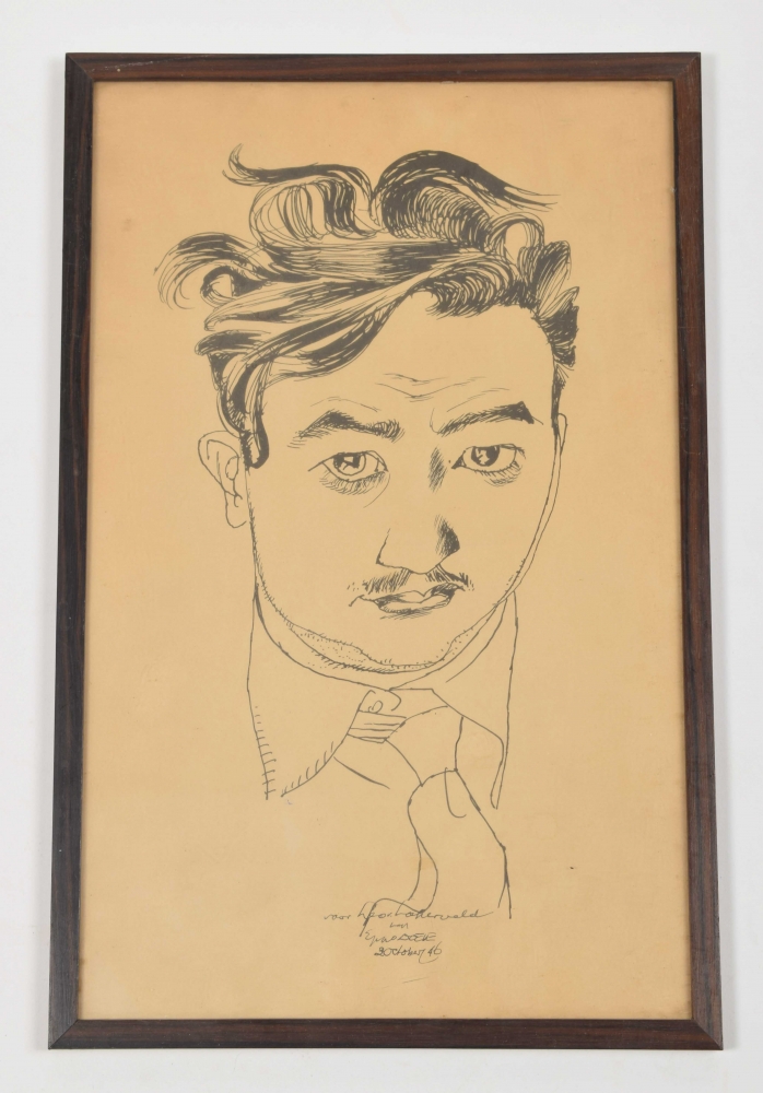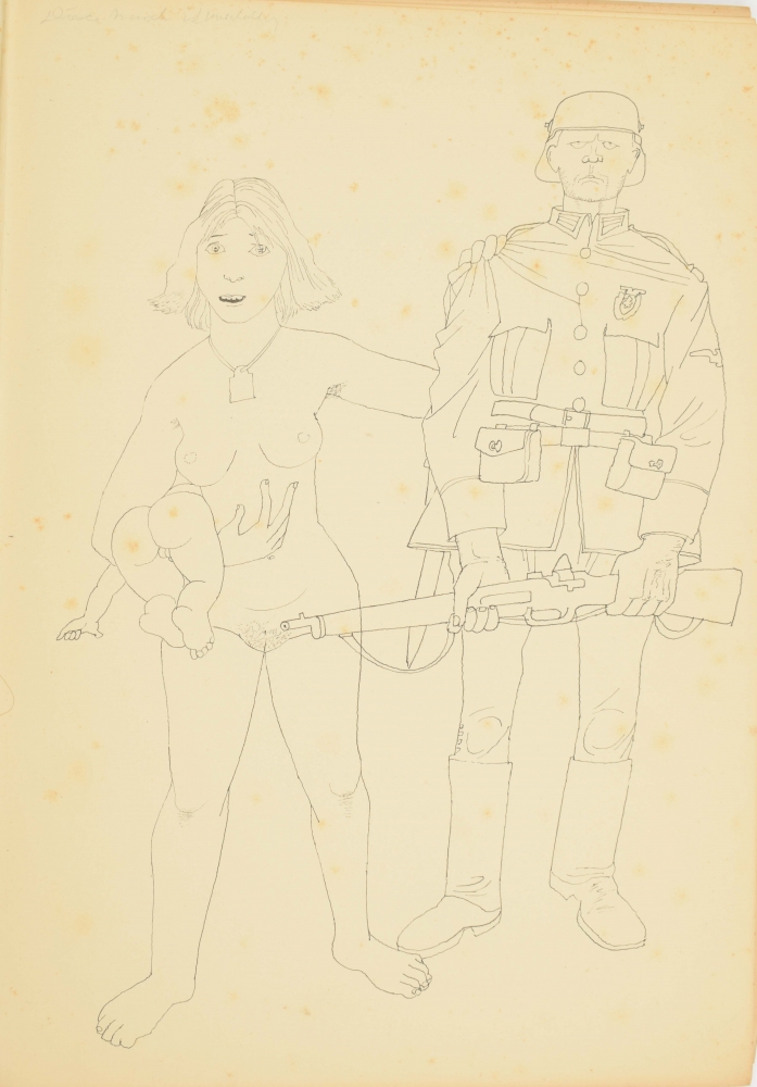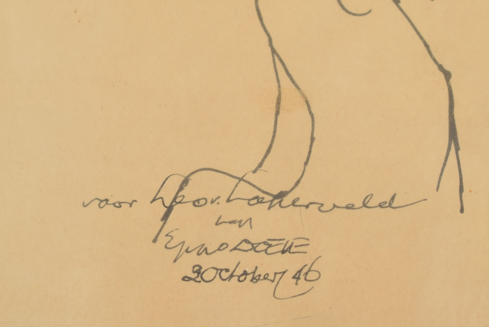 Drawing book 1939 with 31 drawings in India ink. Each ± 34 x 24 cm, few depicting militaries, atrocities, and free work. Written in front "Gekregen van Eppo Doeve", Leo (van Lakerveld), 1939. In cloth cover. Few pages torn out. Added: self-portrait Eppo Doeve, 1946 India ink with subscript: "Voor Leo van Lakerveld van Eppo Doeve 20 october 46".