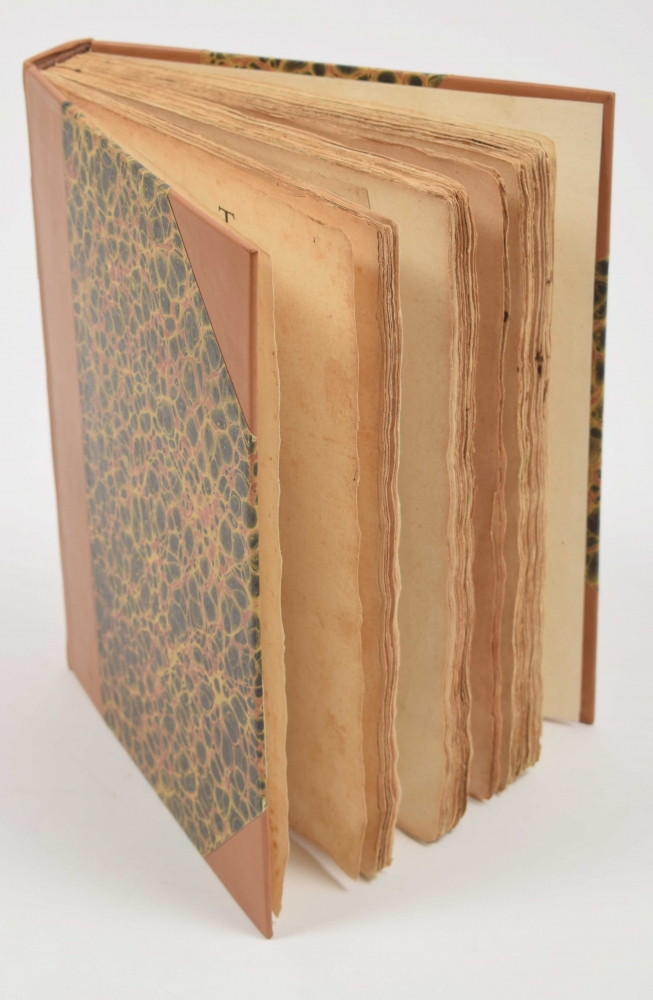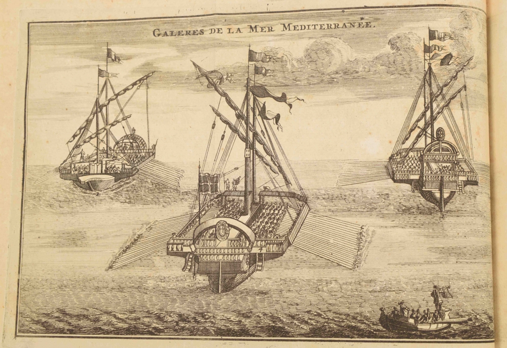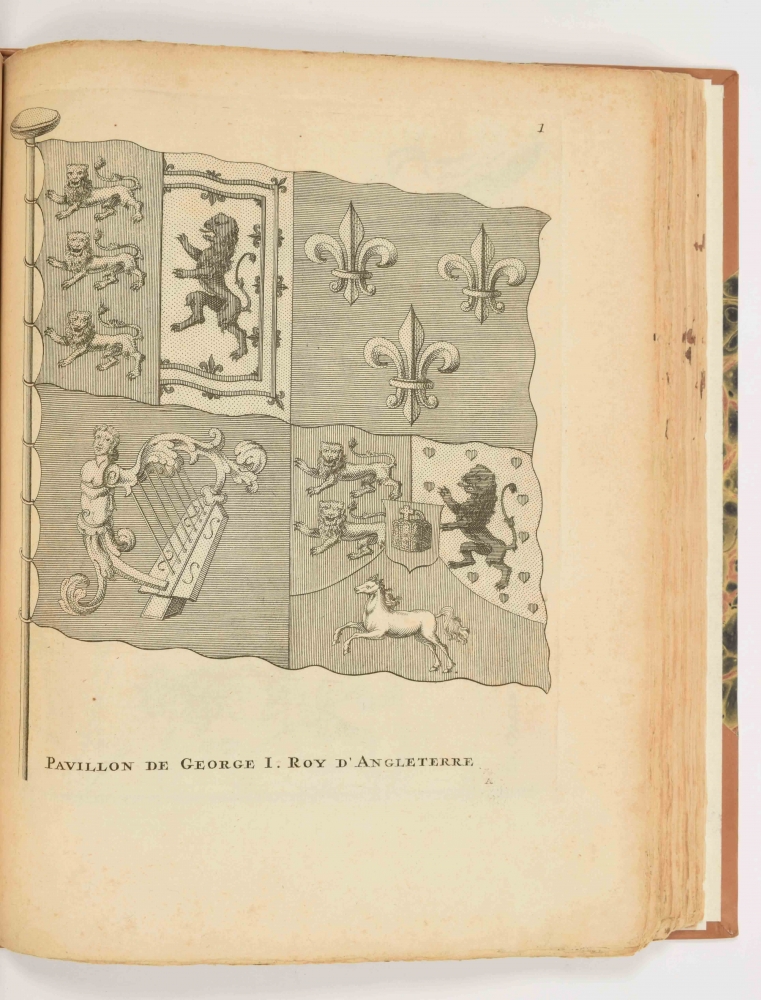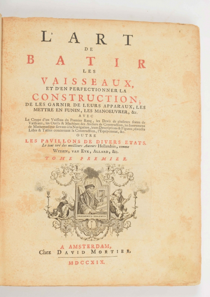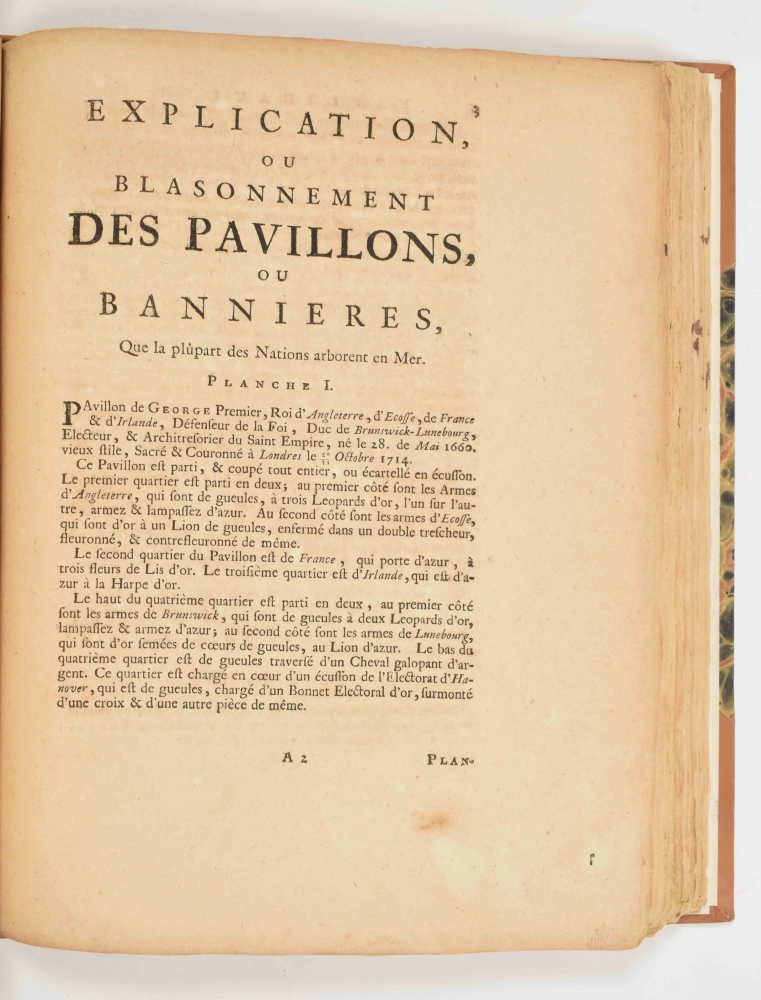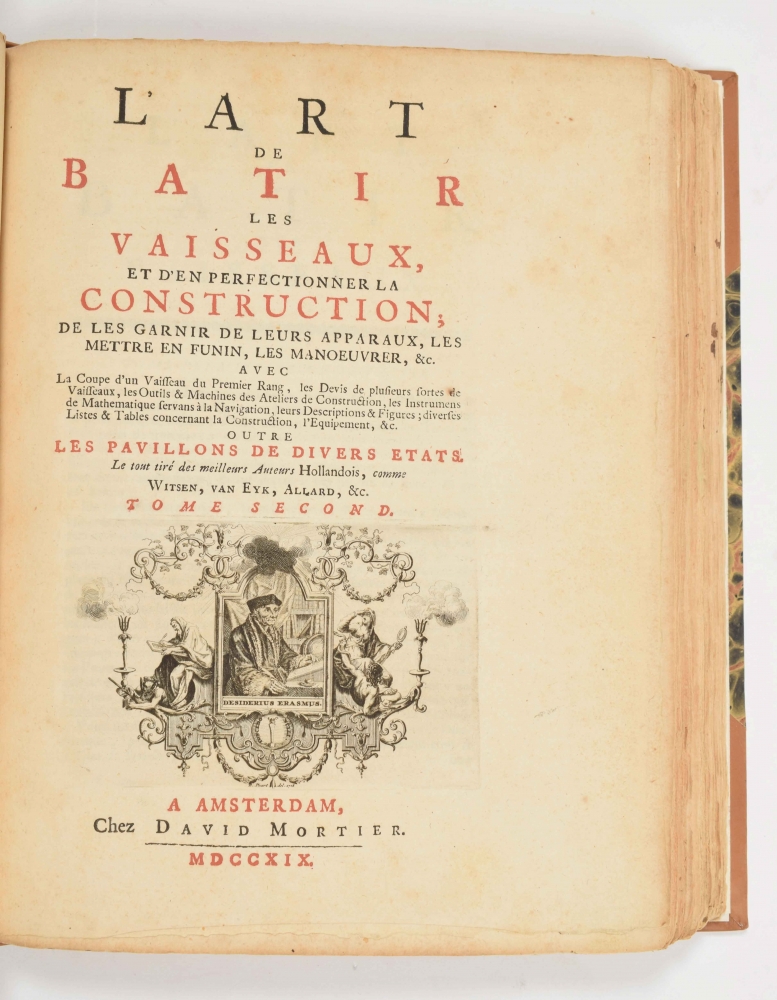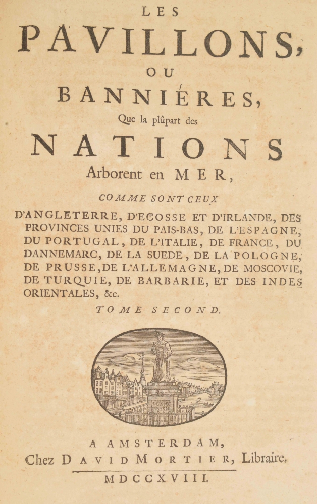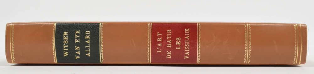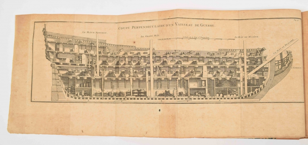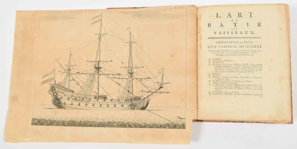De les garnir de leurs apparaux, les mettre en funin, les manoeuvrer, etc. Avec la coupe d'un vaisseau du premier rang, les devis de plusieurs fortes de vaisseaux (...) etc. Outre les Pavillons de divers Etats. Le tout tiré des meilleurs auteurs Hollandois, comme Witsen, Van Eyk, Allard, etc. Amsterdam, David Mortier, 1719. 2 parts in one vol. Bound with: Les Pavillons ou Bannieres que la plupart des Nations arborent en Mer (belonging with part 2).