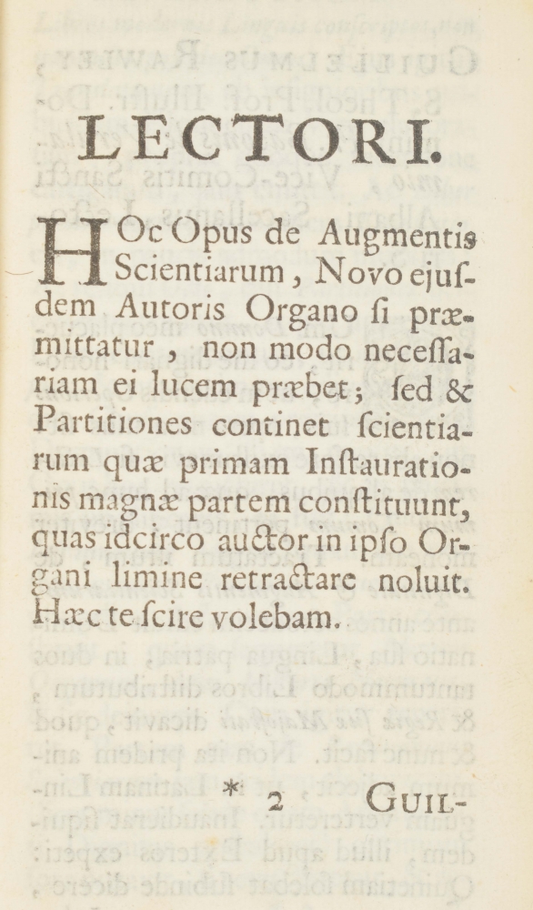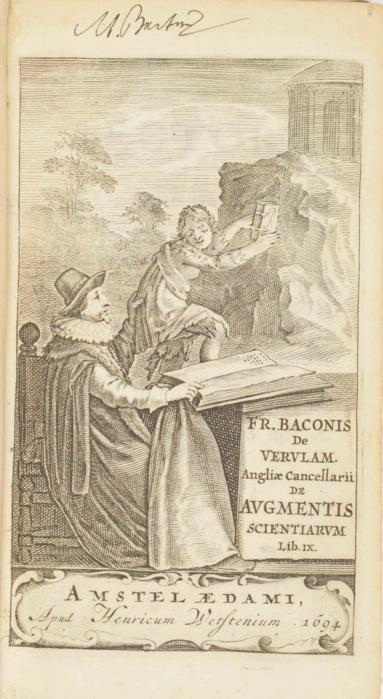 Angliae Cancellarii De Avgmentis Scientiarvm Lib. IX. Amsterdam, Henricum Westenium, 1694. (12), 562, (61) p. Vellum, title on spine. 12mo.