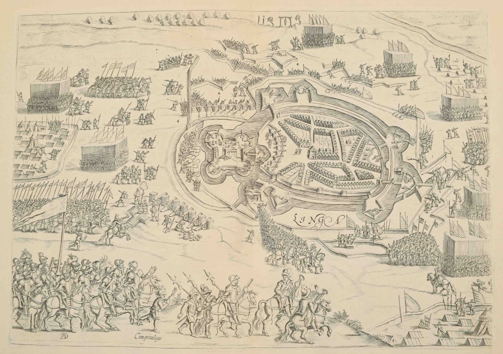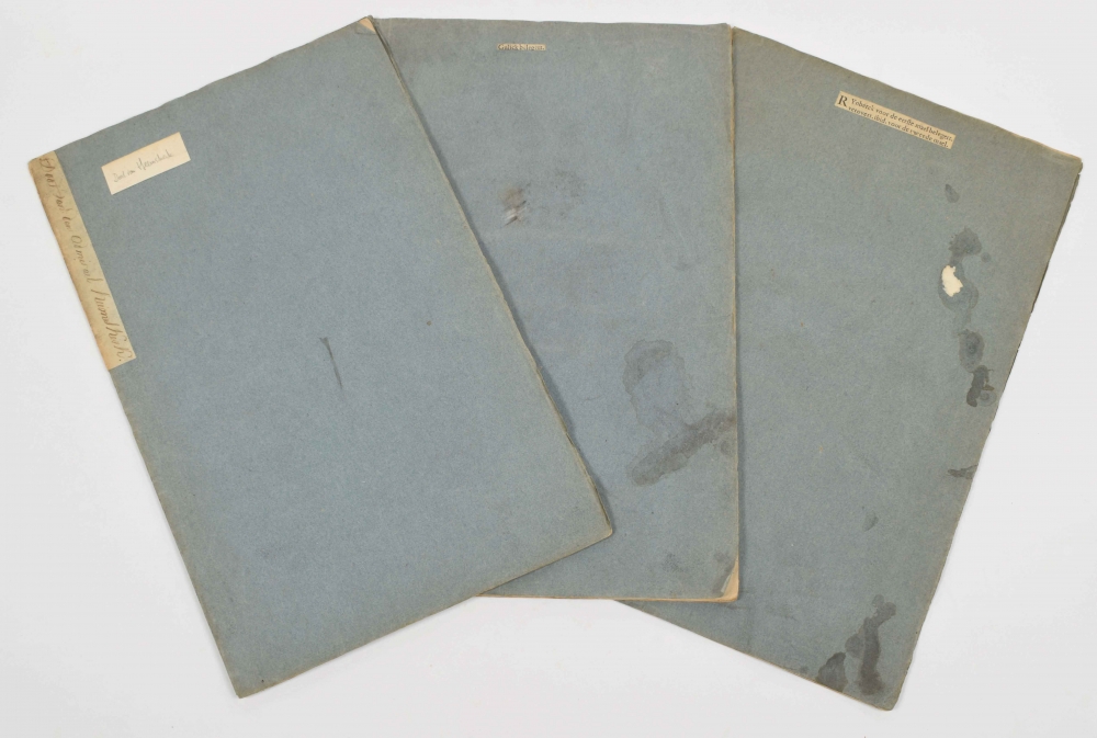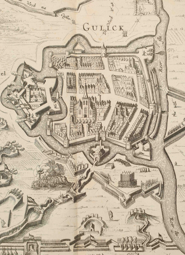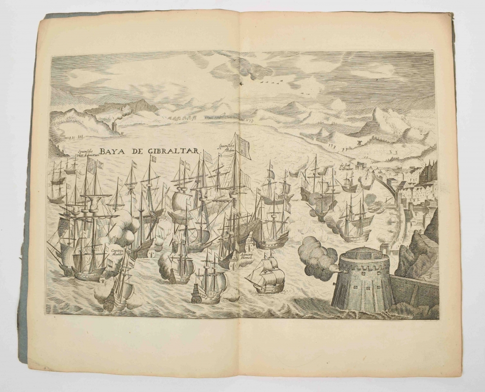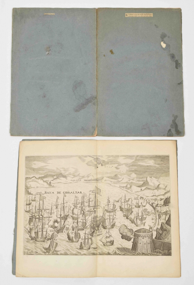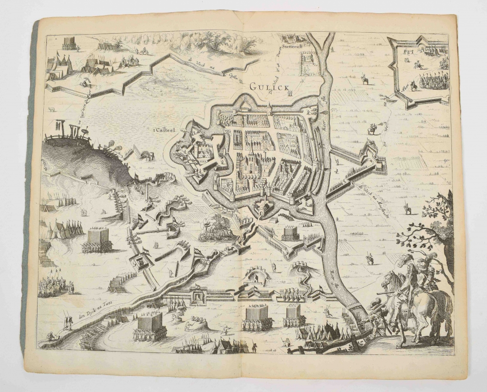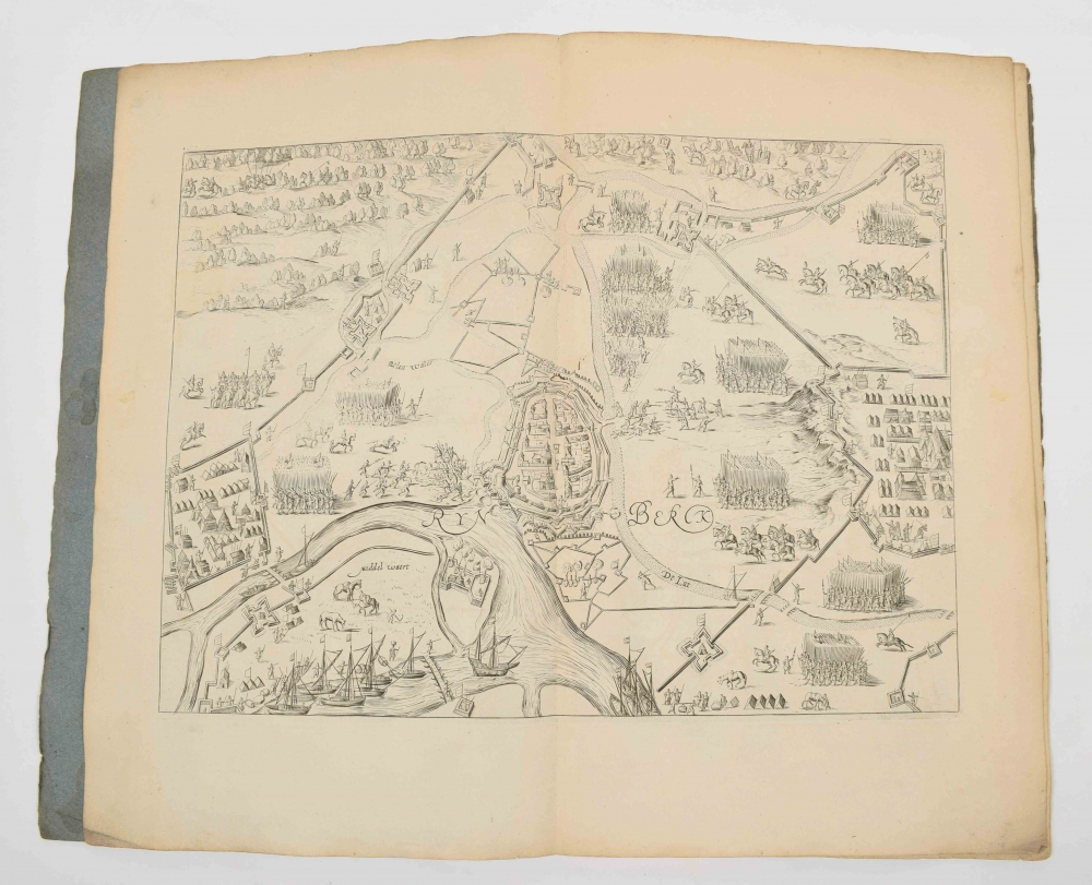 [Isaac Commelin. Leiden, Jan Jansz. Orlers, 1651]. Blue paper wrappers. (1) Het eerste belegh ende overwinninge der stadt Rhyn-Berck, 4 pp., 2 double-page copper engravings: Rhijnberg and Lingen. (2) Sommier verhael van de merckelickste geschiedenissen die in de Landen van Gulich, Cleve ende Bergh gevallen zijn (...). 25 pp. and a double-page copper-engraved plan of Gulick with the siege. (3) Extract on the death of Admiral Heemskerck with a print of the naval Battle of Gibraltar, 14 pp. and a double-page copper engraving.