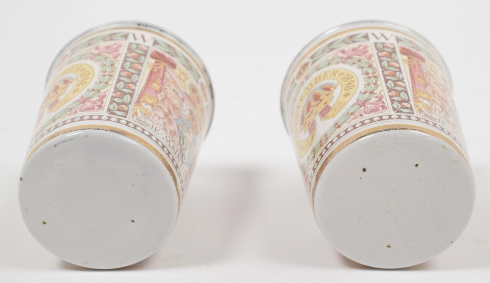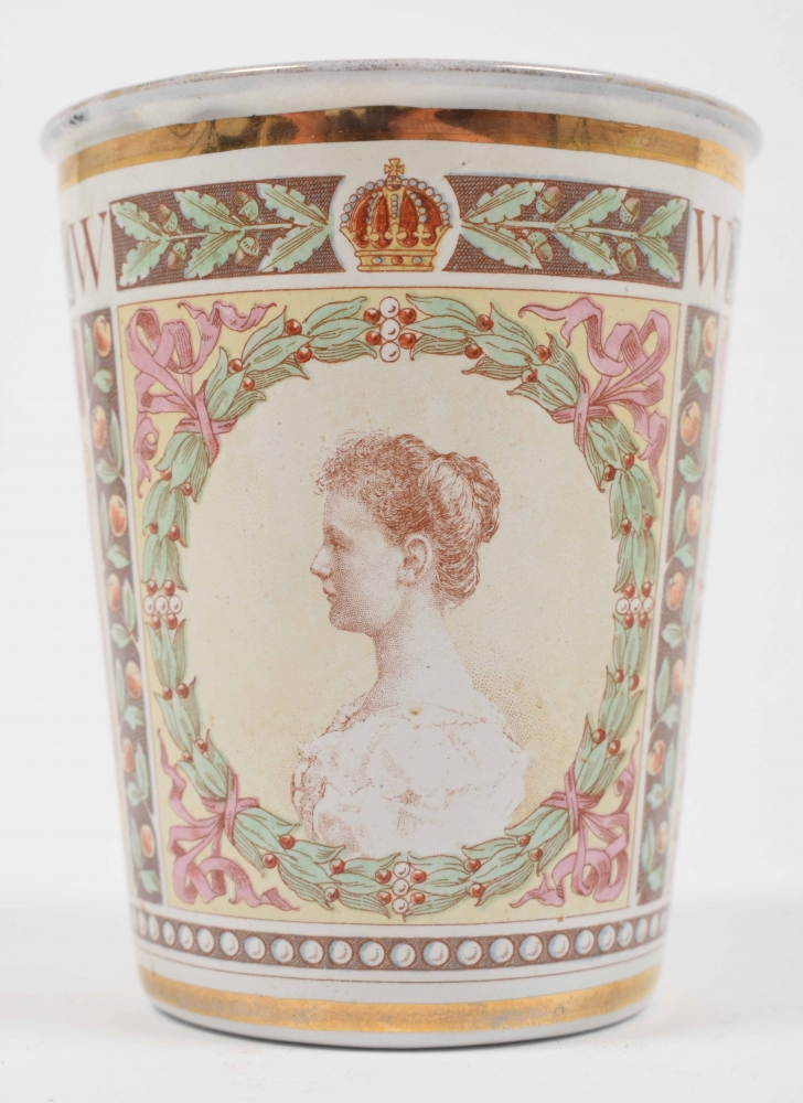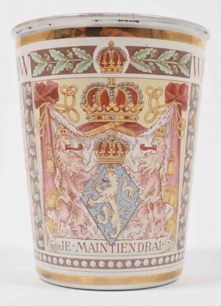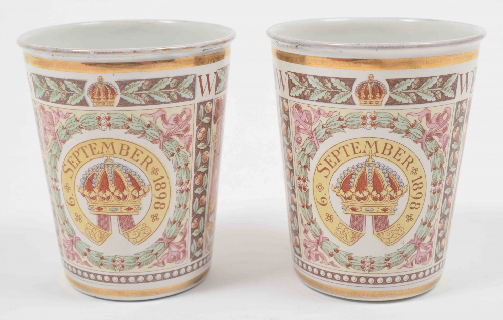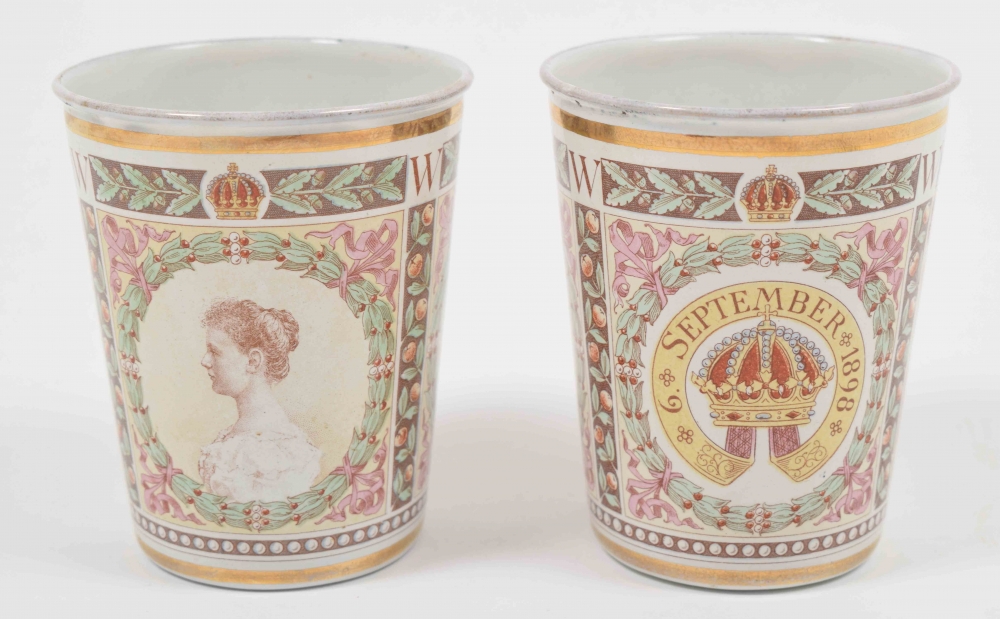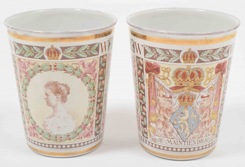 2 memorial cups, commemorating Queen Wilhelmina's coronation on 6 Sept. 1898. Height 9 cm. Both in good condition.
