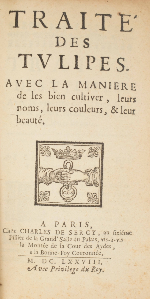 Avec la maniere de les bien cultivars leurs noms, leurs couleurs en leur beauté. [C. de la Chesnee Monstereul]. Paris, C. d. Sercy, 1678. 8vo. With title vignette. 117 pp. Vellum.
