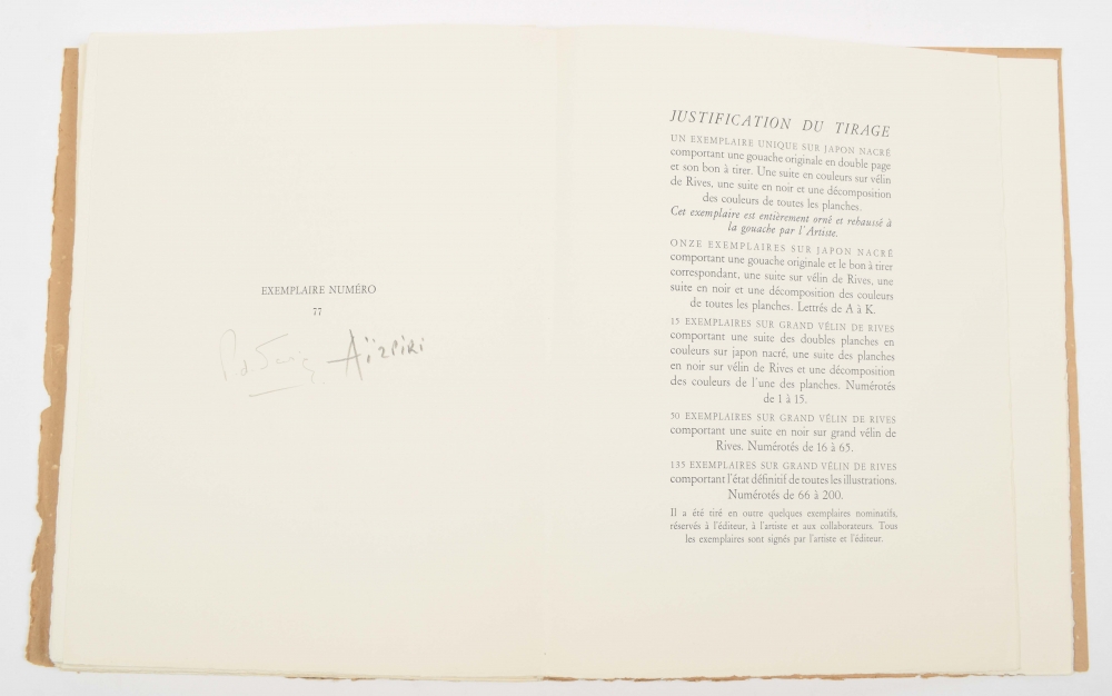 Présentée par Ferdinand Renaud et enrichie de lithographies en couleurs par Paul Aïszpiri. Paris, P. de Tartas, 1960, printed in 211 numbered or lettered copies and several copies by name (this is no. 77, one of 135 copies on grand vélin de Rives, signed by author and artist), unpaginated, with 12 colourlithographic ills. of which 8 double-page and 4 full-page, in loose quires as issued in original lithographed wrapper, folio, in cloth dropback box.