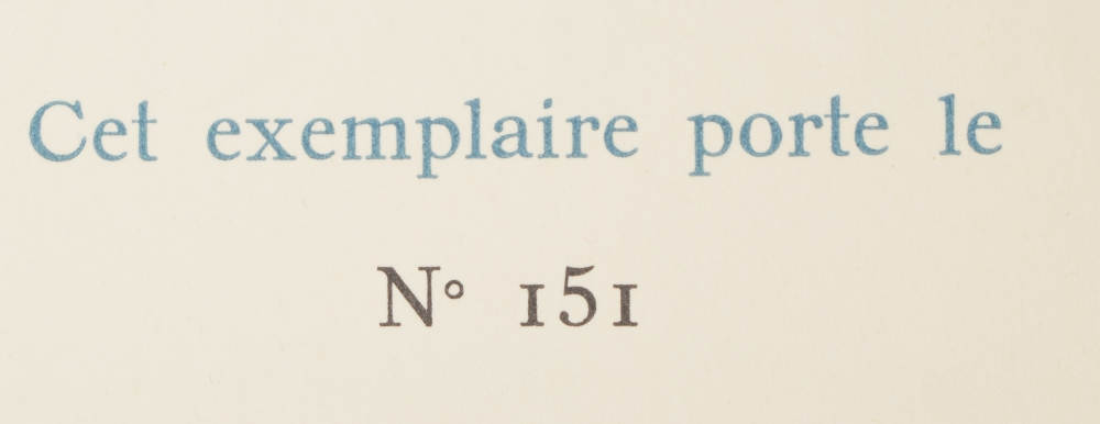 Wrapper sl. sunned due to chemise. Leather spine ends of slipcase sl. dam. Reissue of the Gallimard, 1929 edition.