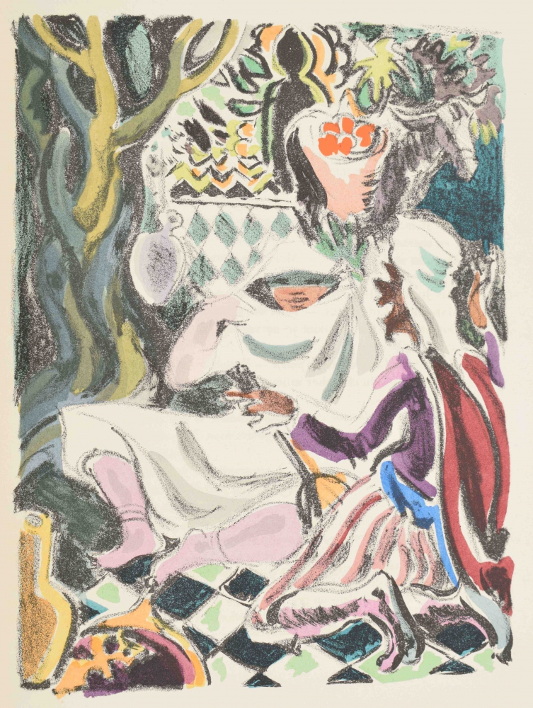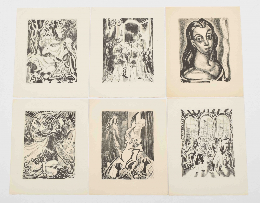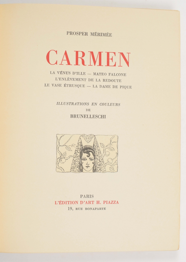 La Vénus d'Ille. Matteo Falcone. L'Enlèvement de la redoute. Le vase étrusque. La dame de pique. Illustrations en couleurs de Brunelleschi. Paris, l'Édition d'Art H. Piazza, 1948, printed in 300 numbered copies (this is no. 131, one of 230 copies on vélin Renage with additional suite of the 17 illustrations in black), 245,(4) p., with 17 coloured ills., original pictorial wrapper, 4to, together with the suite in cardboard slipcase (small bookplate "FLG" to inside of the sl. tanned wrapper).
