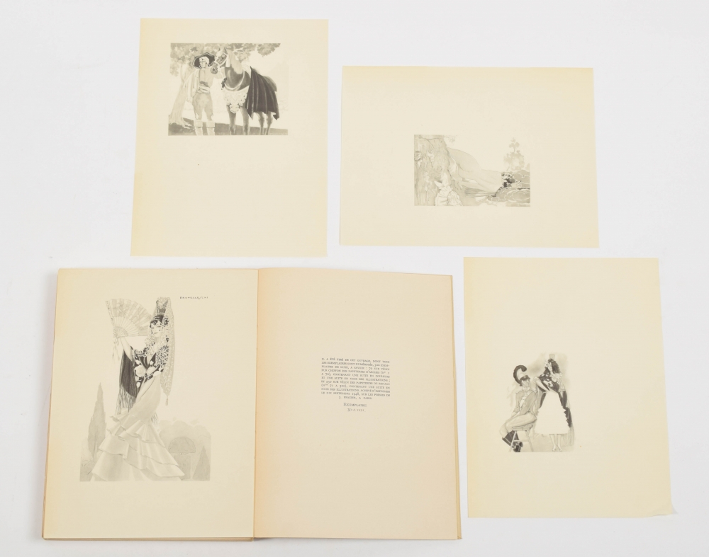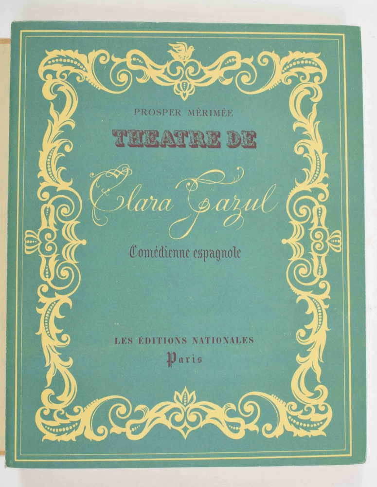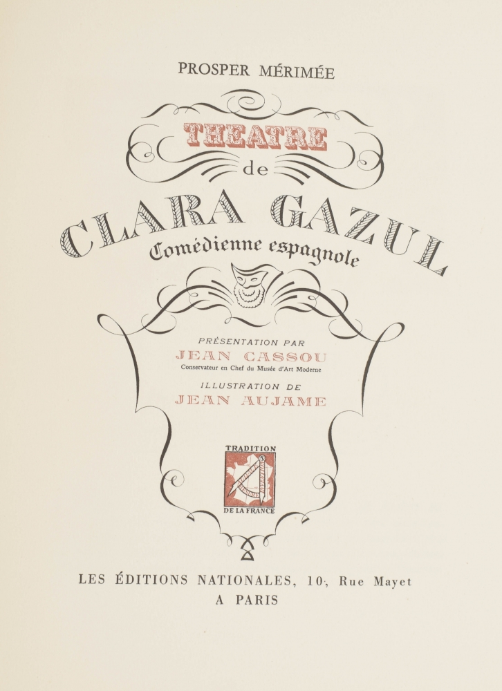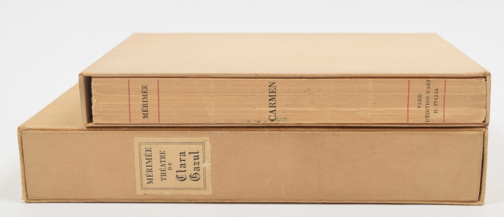 (2) Prosper Mérimée. Theatre de Clara Gazul, Comédienne espagnole. Présentation par Jean Cassou. Illustration de Jean Aujame. Paris, printed by Coulouma for Les Éditions Nationales, 1946, printed in 650 numbered, lettered or H.C. copies (this is no. 271, one of 500 copies on Johannot), with 12 pochoir coloured, lithographed plates and 18 monochrome, woodcut headpieces, original wrapper, 4to, together with a suite of the 12 plates in black (not mentioned in the colophon) in halfcloth chemise and slipcase (very good copy with minimal defects to chemise/ slipcase). (total 2)