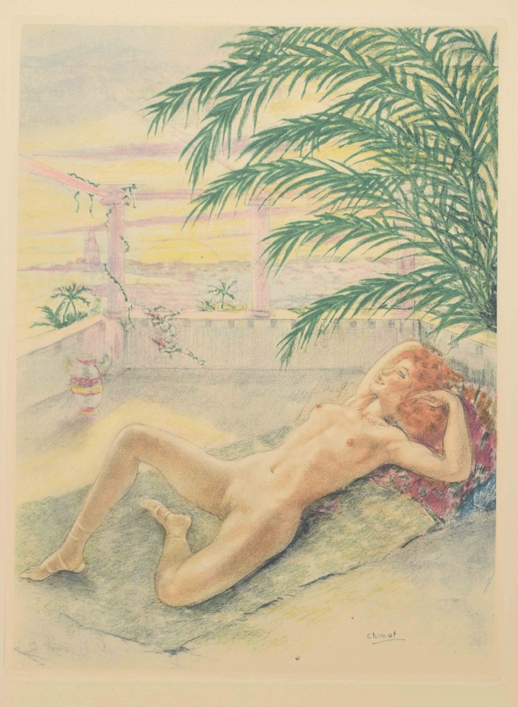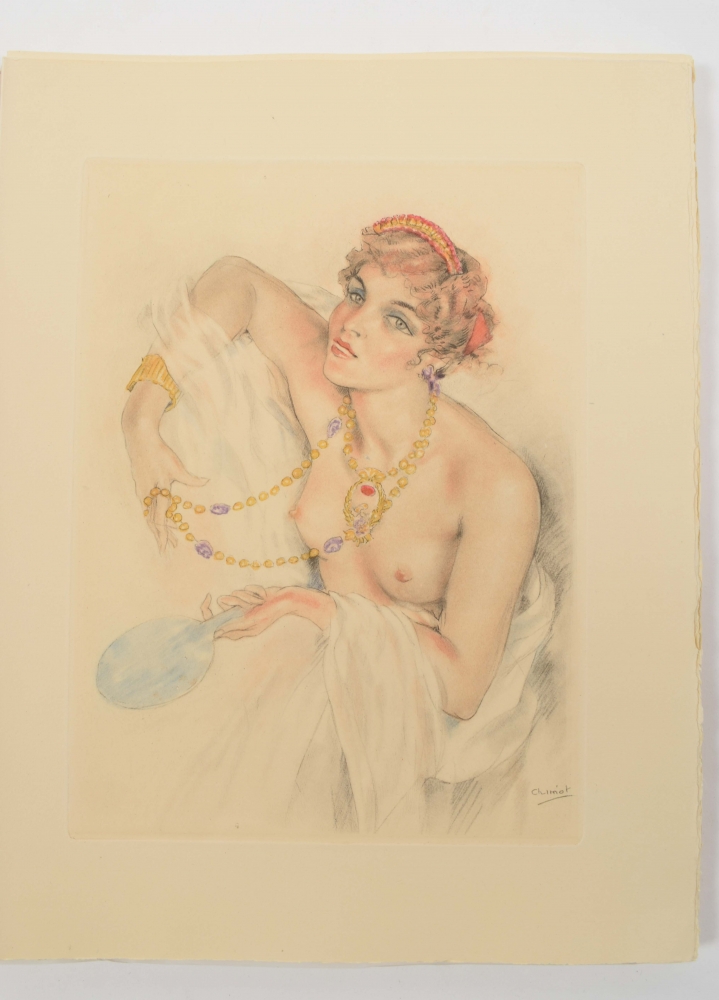Illustrés de quinze gravures en couleurs d'Édouard Chimot. Paris, G. Guillot, 1949, printed in 325 numbered copies (this is no. 148, one of 190 copies on vélin de Rives crème with the ills. in their definitive, coloured form), (10,89,(5) p., with 15 full-page erotic, coloured engravings, in loose quires as issued in original wrapper, folio, in cardboard chemise and slipcase (wrapper trifle sunned).