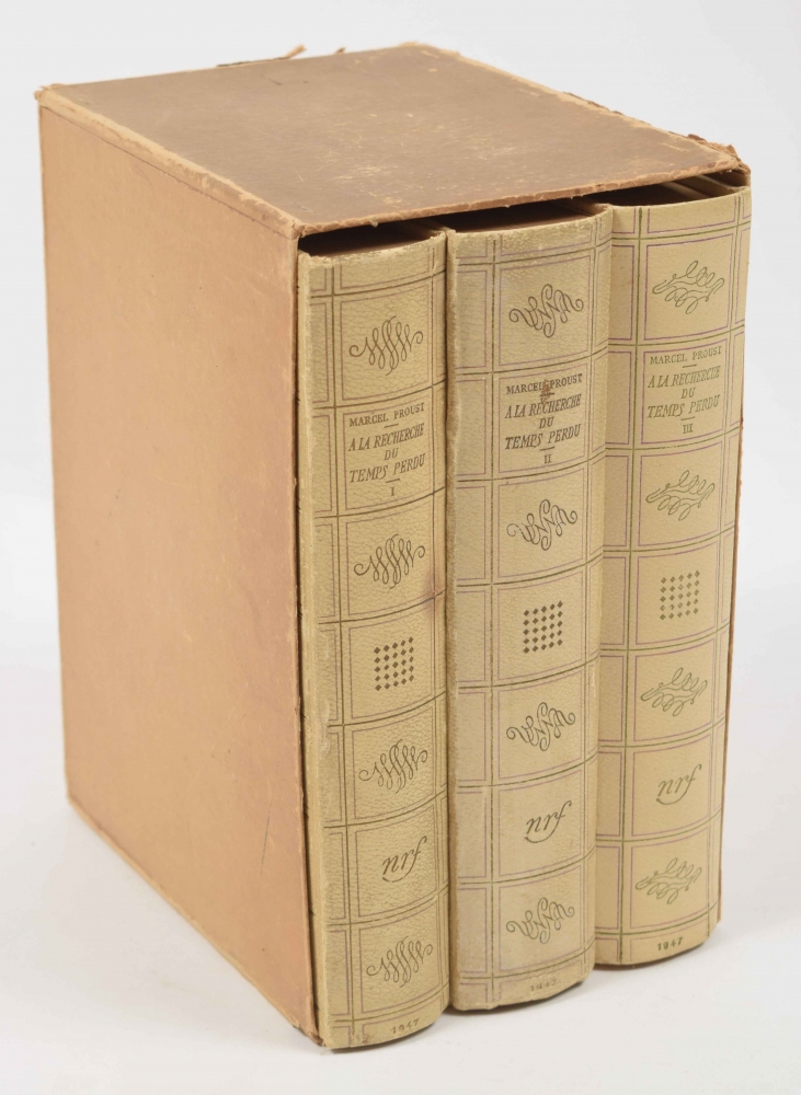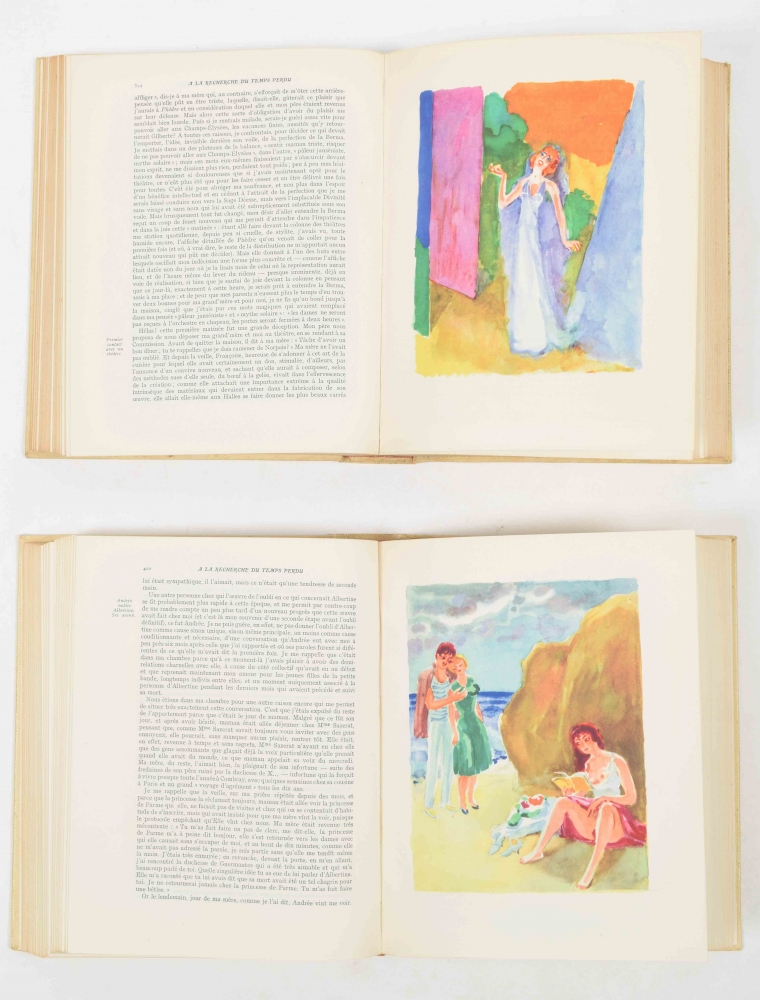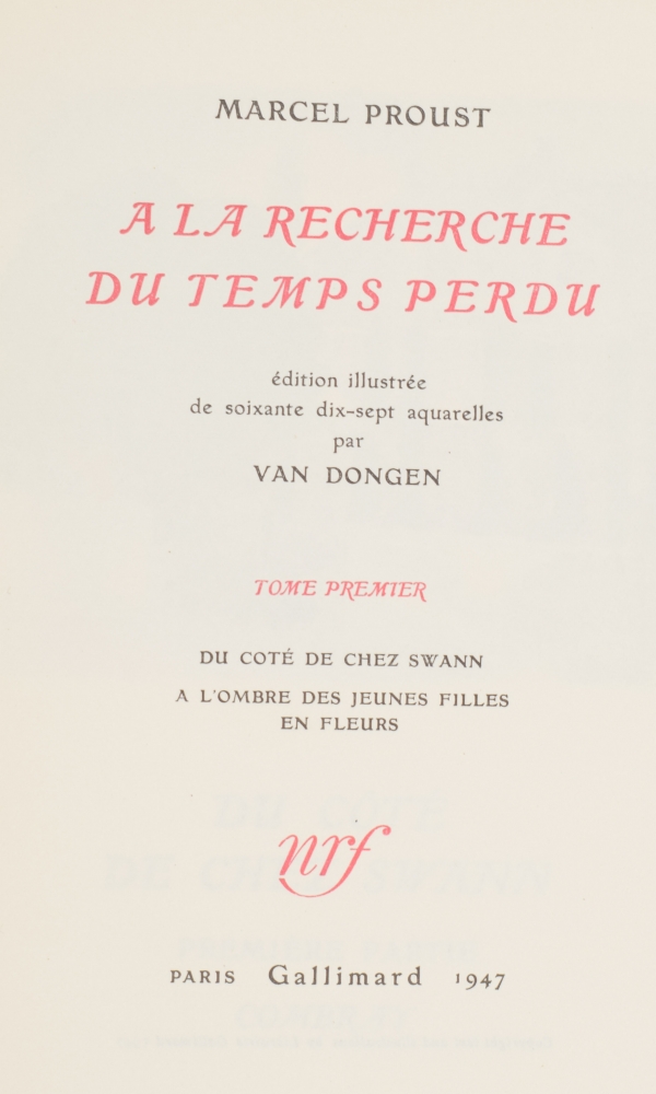 Édition illustrée de soixante dix-sept aquarelles par Van Dongen. Paris, Gallimard, 1947, printed in 8750 numbered copies, 3 vols., 655,(4); 764,(3); 724,(1) p., illustrated as indicated (77 illustrations), original uniform boards after a design by Paul Bonnet, 3 vols. together in slipcase.