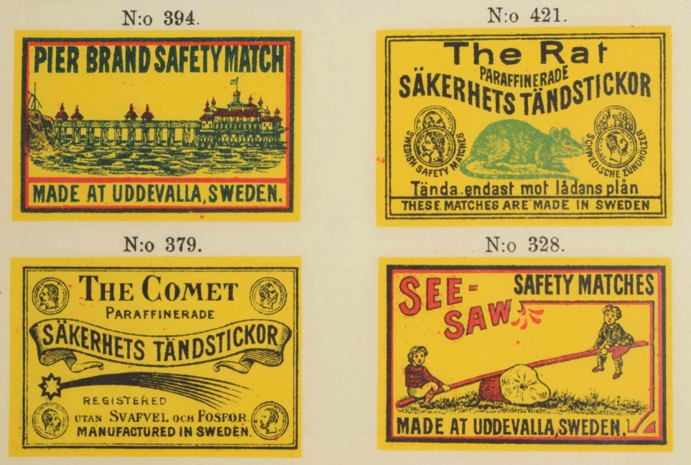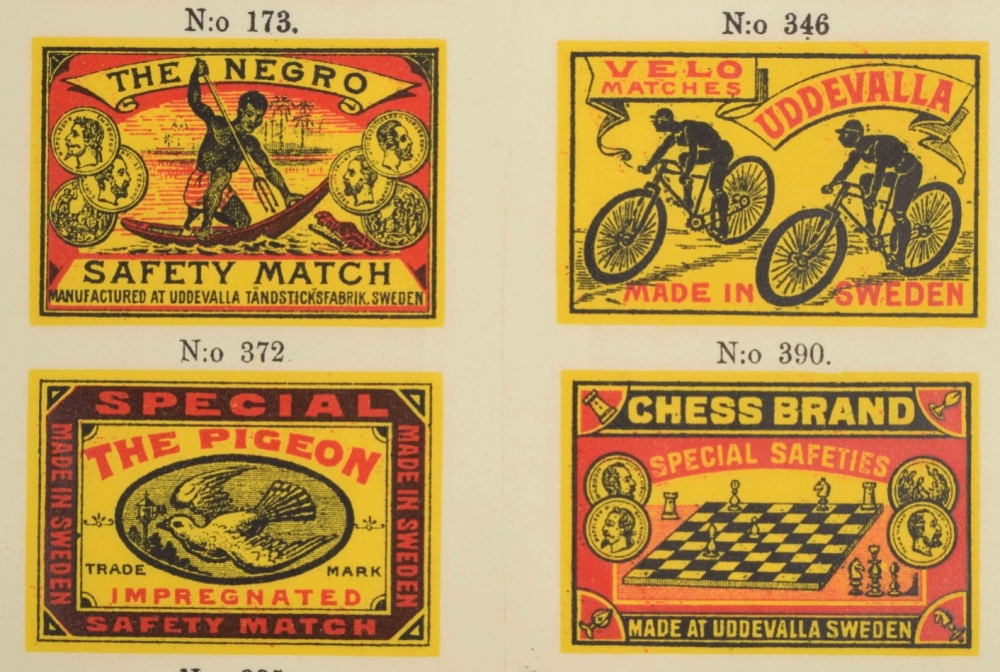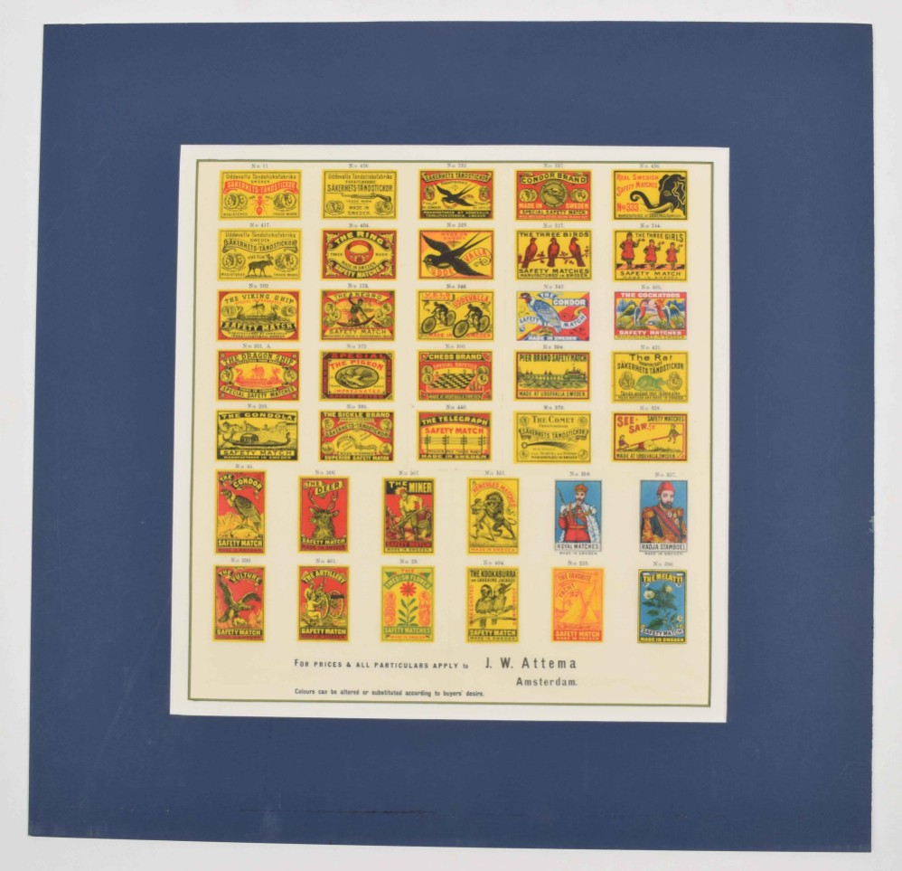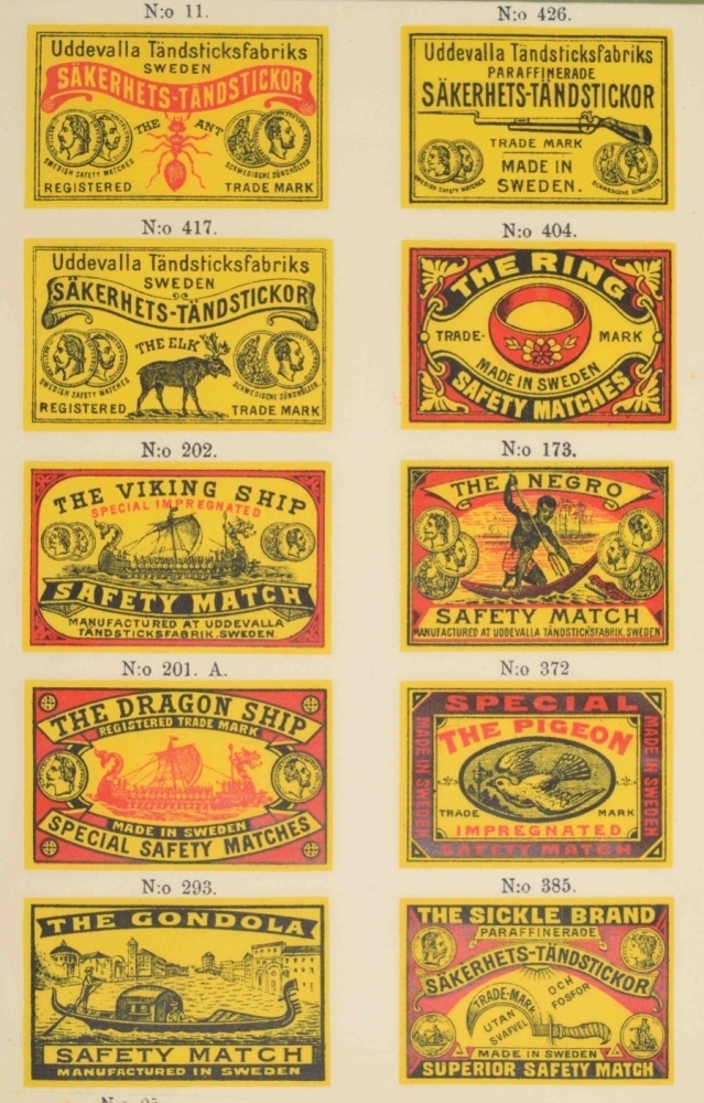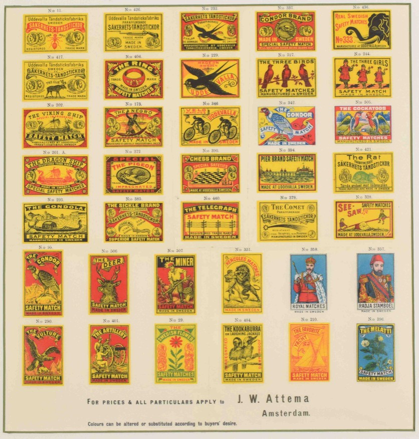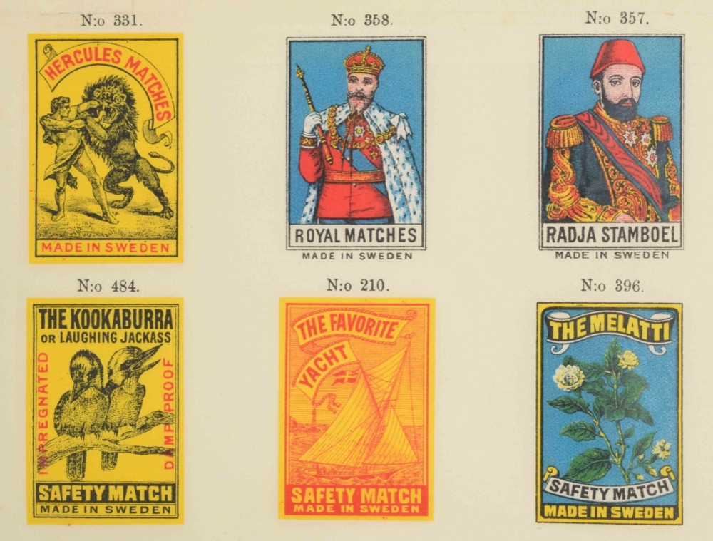 Promo sheet for Swedish matchbox cover designs, c. 1925. Chromolithography, 38.5 x 40 cm.