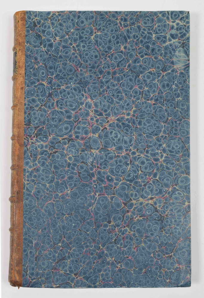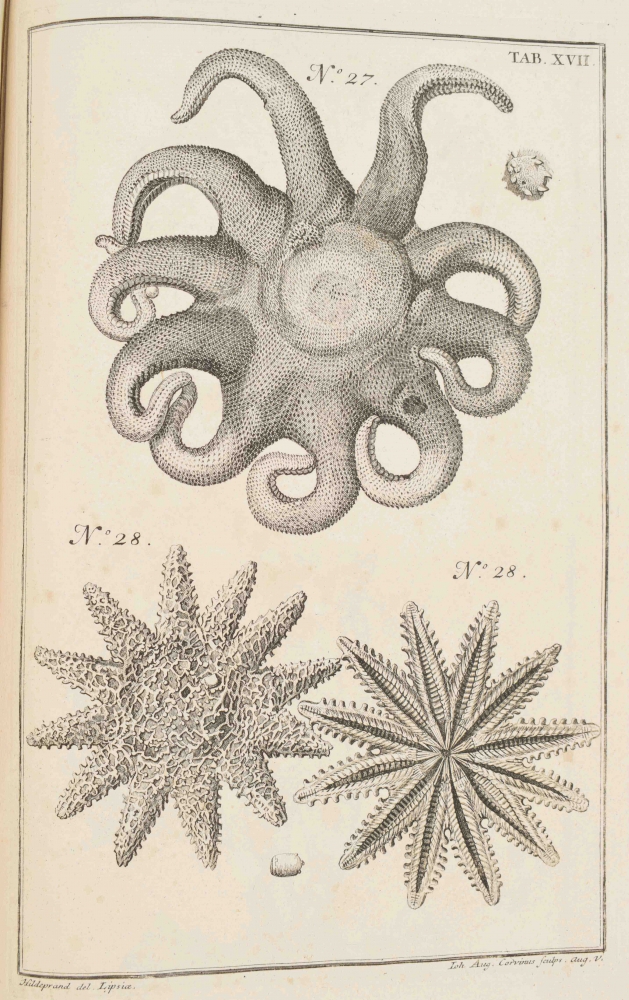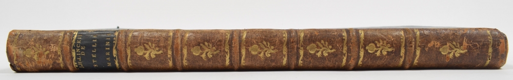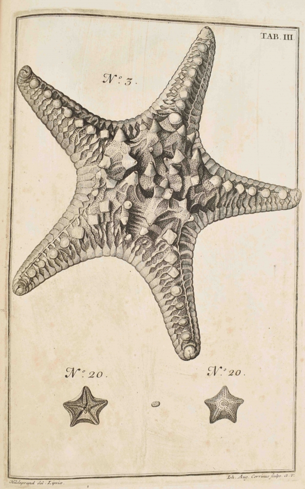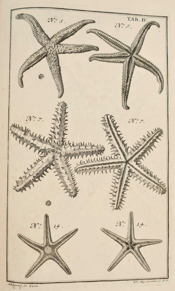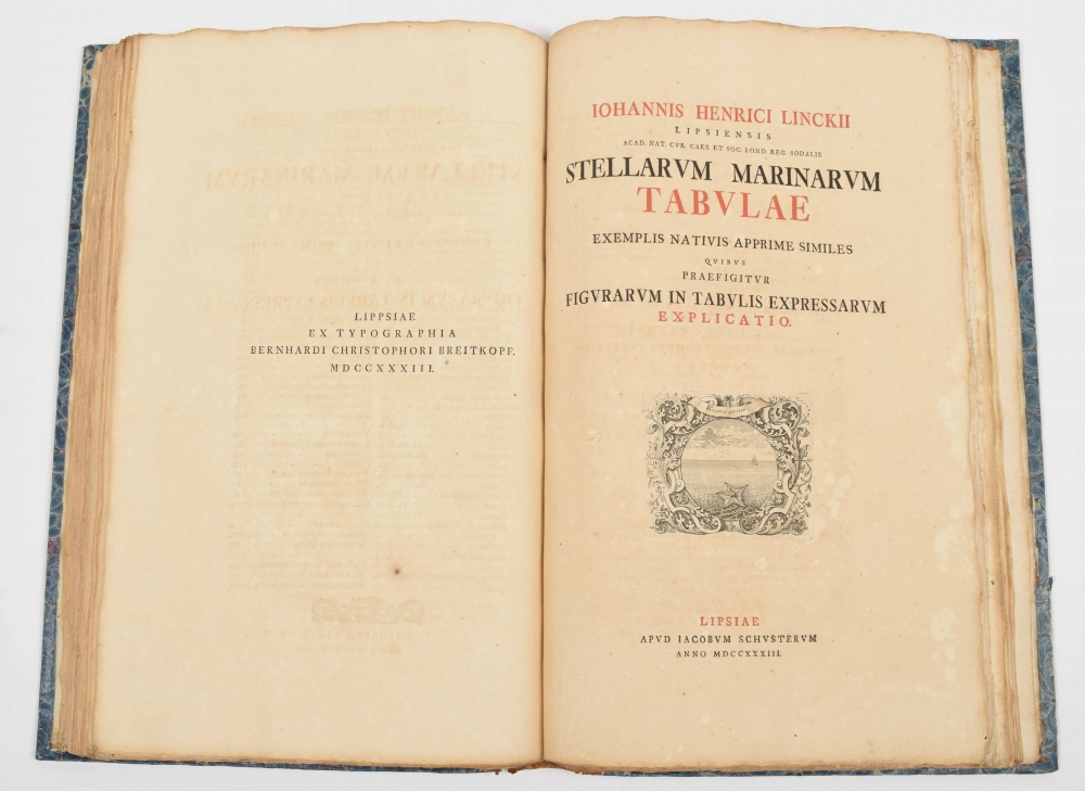 Folio, halfleather, title on spine in black and gilt stamping, blue marbled boards, half title, title in red and black with copper-engraved vignette. (22),107,(1) pp. with 3 large headpieces and several ills. in the text, all in copper engraving; the plates with title in red and black with copper-engraved vignette, (4) pp. and 42 leaves with copper-engraved ills. of starfish. The engravings by J.A. Corvinus after Hildeprand. The text occ. (sl.) tanned. Plates in good condition. Important scientific work on starfish.