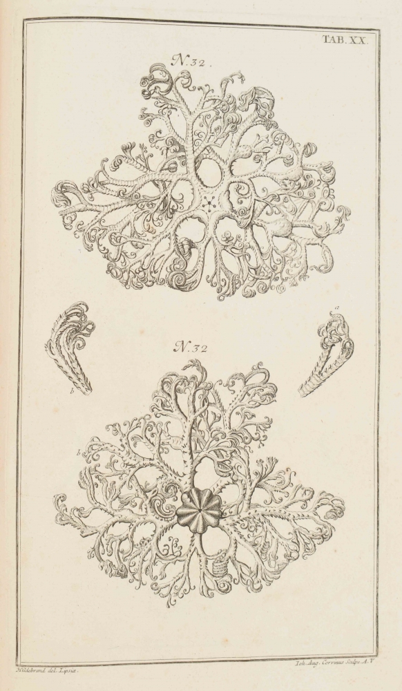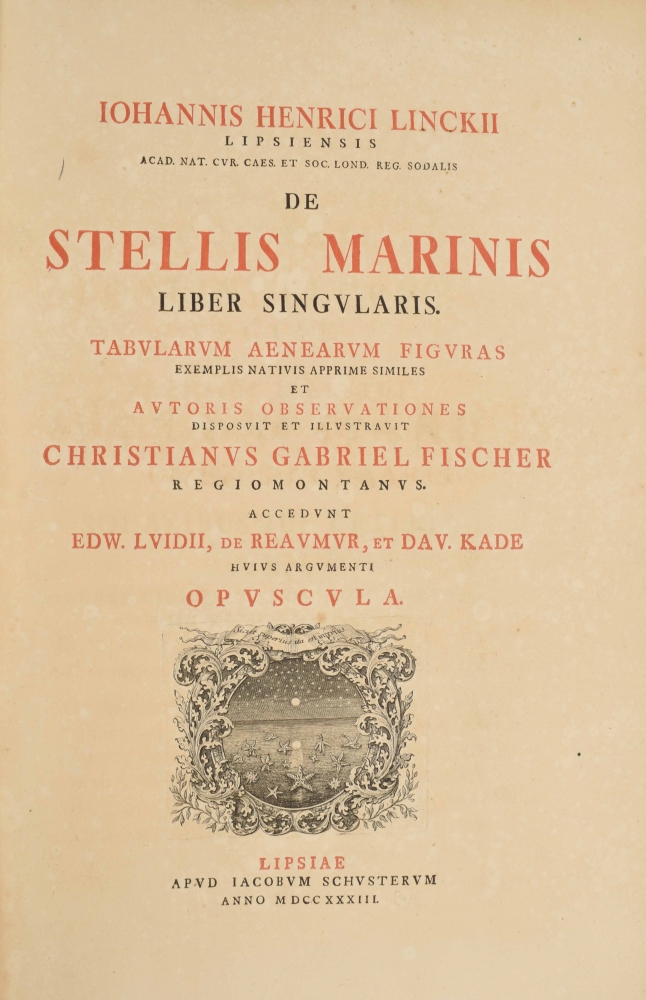 Johannus Henricus Linck. Tabularum Aenearum figuras exemplis nativis apprime similis et autoris observationes (...) Ill. Christianus Gabriel Fischer (...) Acc. Edw. Luidii, de Reamur et Dav. Kade huius argumenti Opuscula. Leipzig, Jacob. Schuster, 1733. First and only edition.