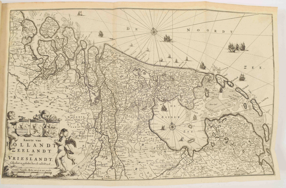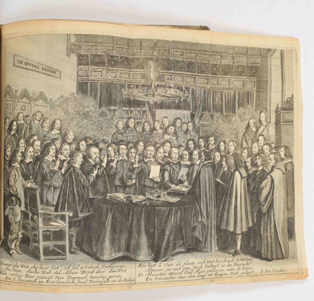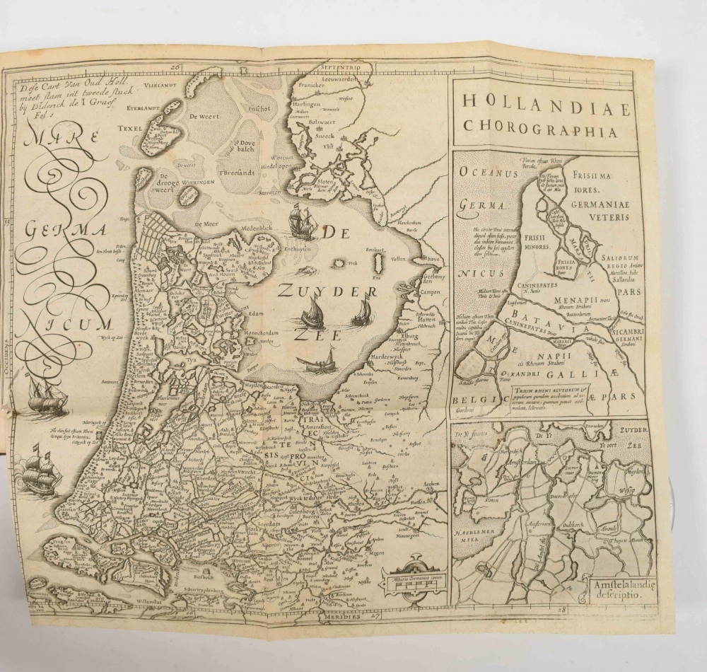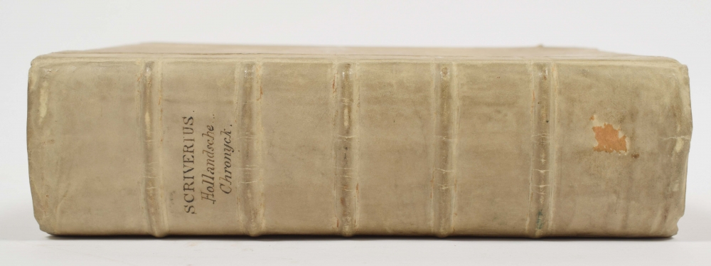 2 parts in one vol. 4to. Vellum with blindstamping, title on spine in ms., title in red and black with vignette, (16),120 and 833 pp. with tailpiece + register. An armorial plate, 2 folding plates, a title plate with "Alle de Graven van Hollant en WestVrieslant" by Pieter Brugman and a folding plate with the peace of Münster by I. de Decker. The title page with minor restoration outside the type area, endpapers renewed, ticket with auction description to endpaper, else a very good copy. Firm in binding.