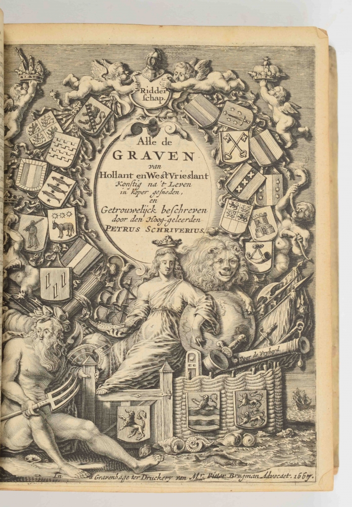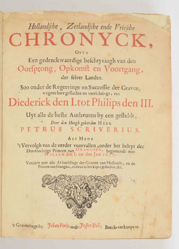 Ofte een gedenckwaerdige beschryvingh van den Oorsprong, Opkomst en Voortgang, der selver landen (...) van Diederick den I. tot Philips den III. (...) Petrus Scriverius. Als mede 't vervolgh van de verder voorvallen, onder het beleyt der Doorluchtige Princen van Orangien, beginnende met Willem den I. tot den jare 1677. The Hague, Johan Veely ende Jasper Doll, [1678].