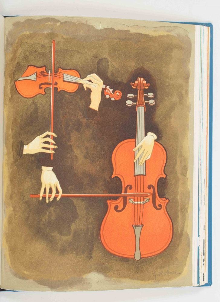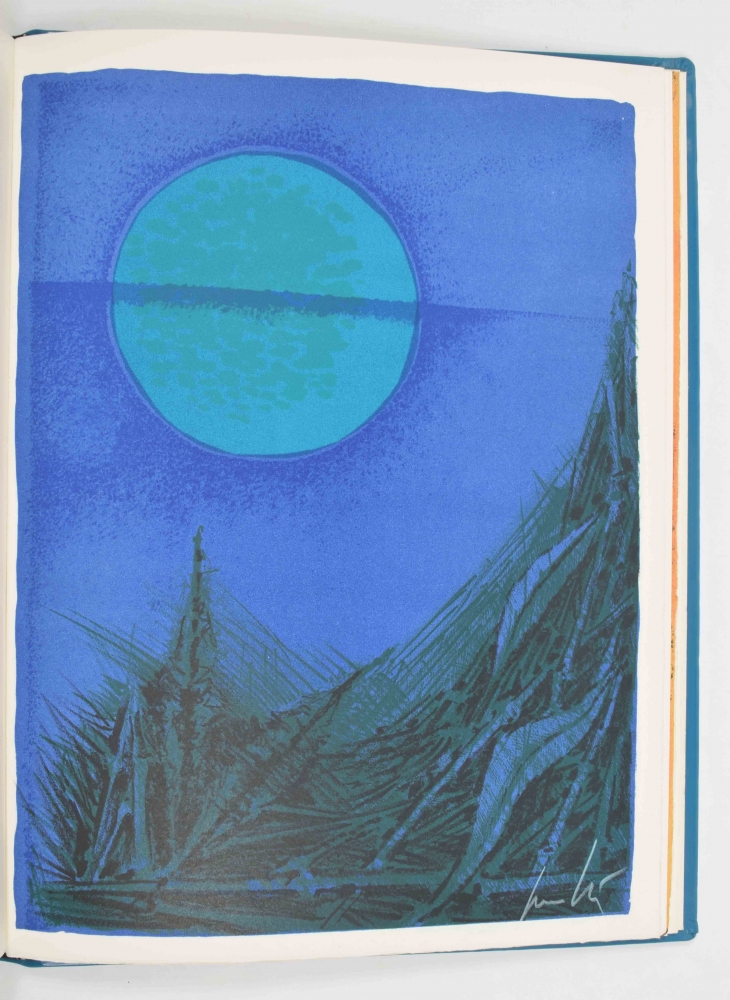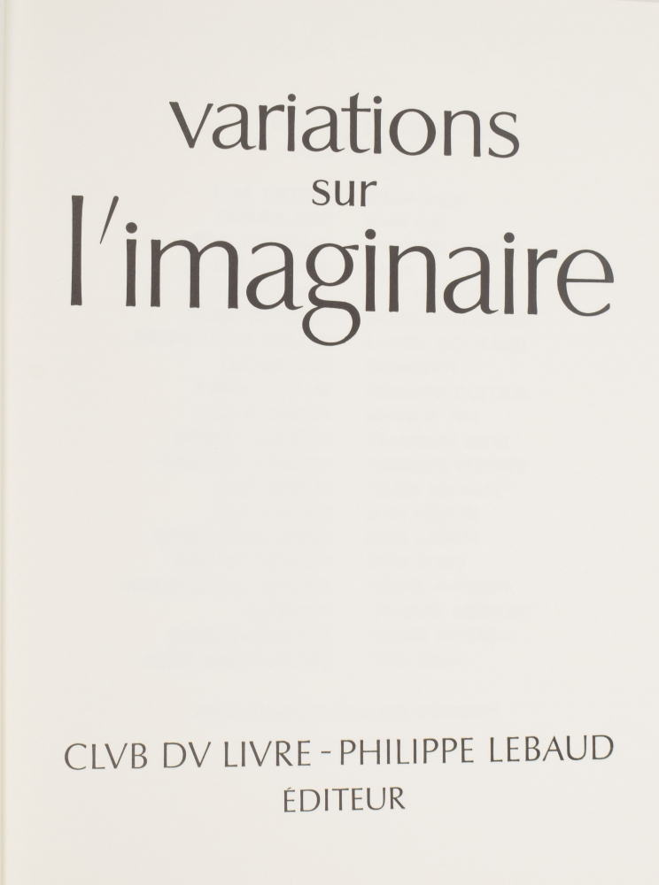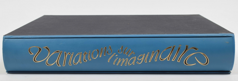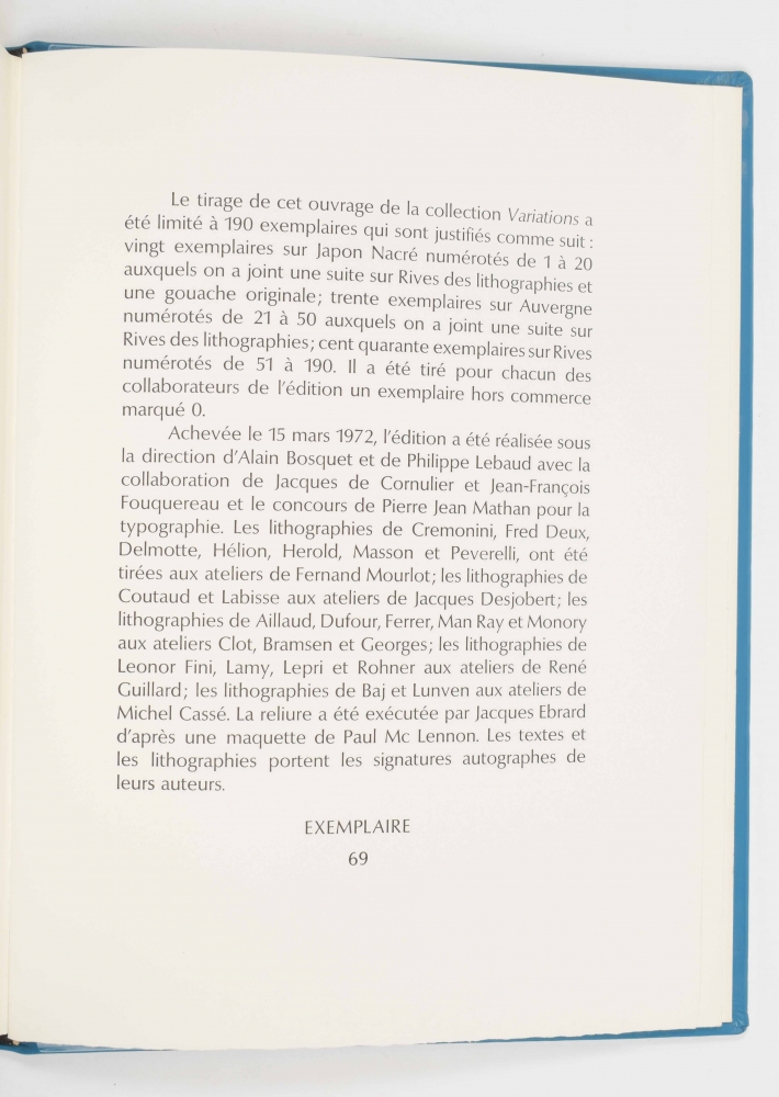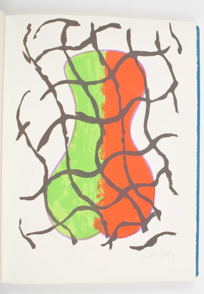 Club du livre, Philippe Lebaud éd., 1972. With 20 signed texts and lithographs. Texts by E.M. Cioran, Guillevec, Alain Bosquet, Michel Deguy, Luc Estang, Yves Berger, Jean Follain, Miguel Angel Asturias, Pierre Emmanuel and others; colour lithographs by Man Ray, Enrico Baj, Cremonini, Leonor Fini, Félix Labisse, Andre Masson and others. Folio in faux-leather with black/ gilt decoration. In case. Edition of 190 copies.