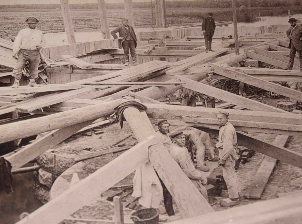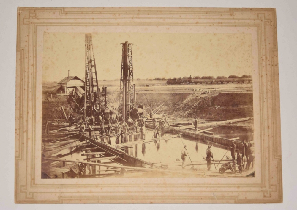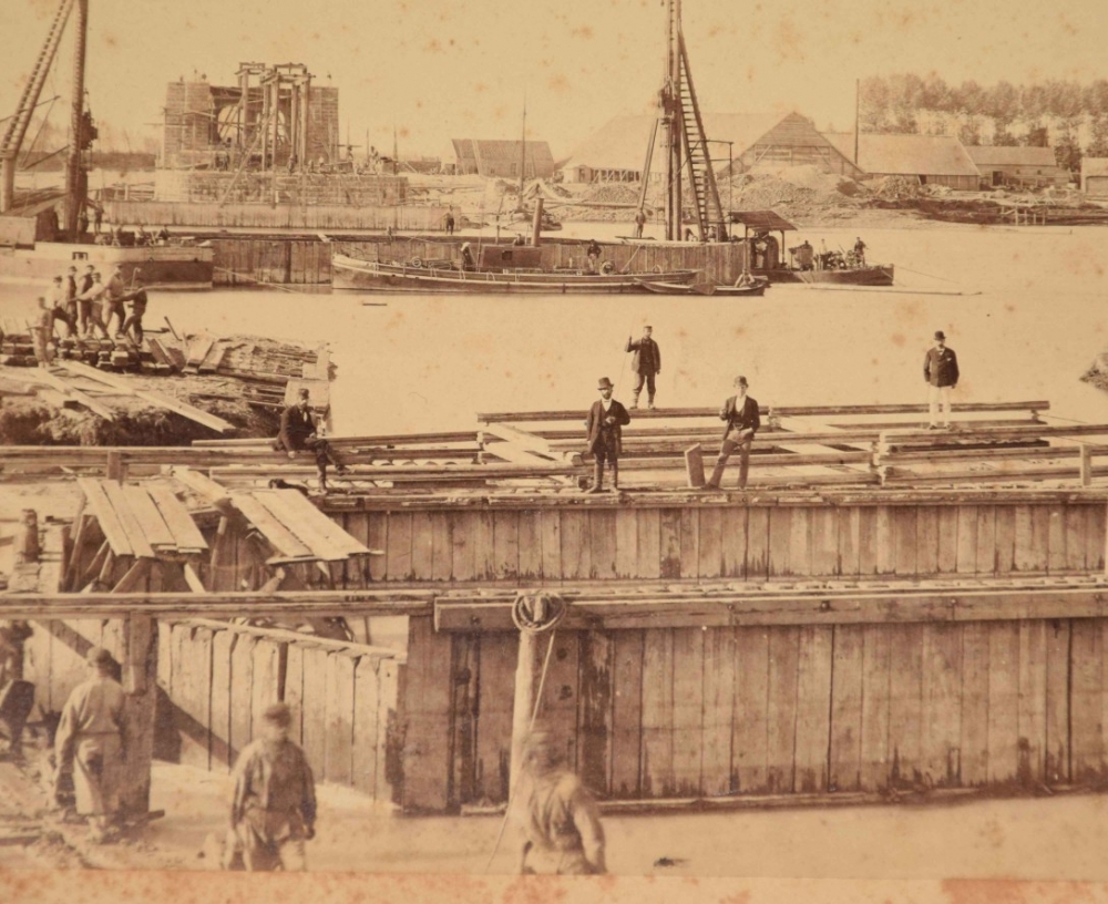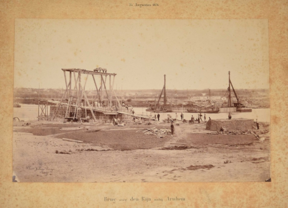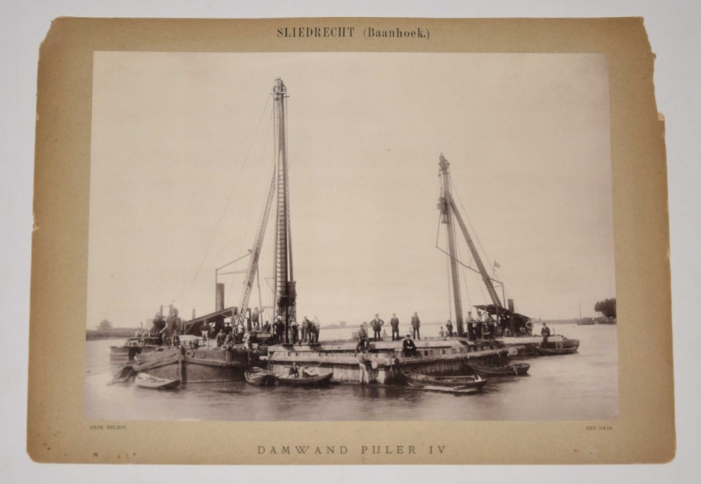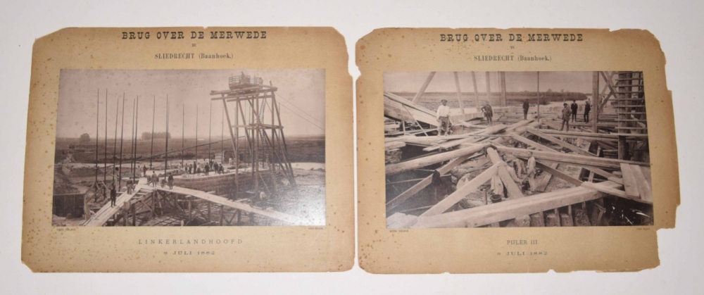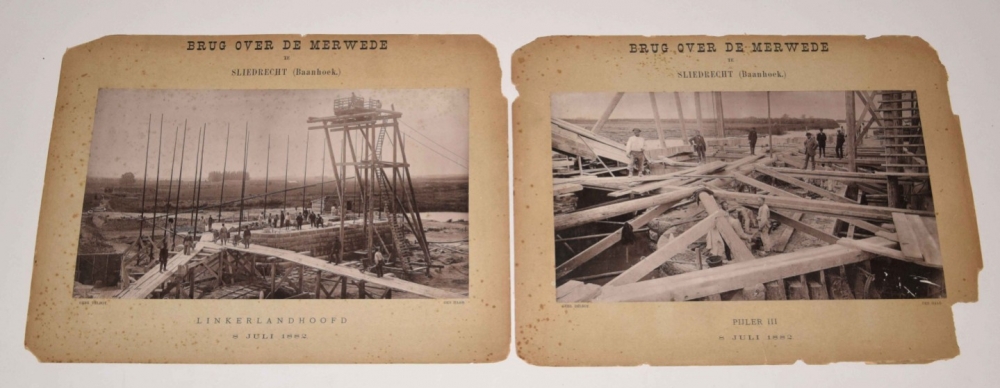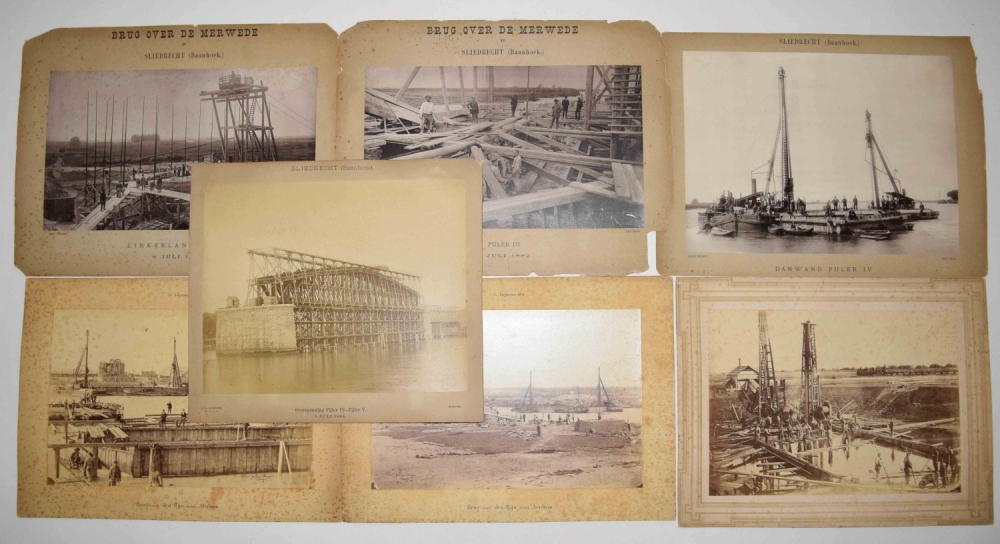 Series of 7 albumen photos mounted on thin board, 1882-1886: Sliedrecht (Baanhoek) Damwand Pijler III. The Hague, Gebr. Delboy, c. 1882. 21.5 x 36.5 cm. Mounted on thin board. Board with printed text damaged at edges. Photo with some smaller scratches to lower right + [same] Pijler IV. 27 x 36 cm. In good condition + [same] Linkerlandhoofd. 8 July 1882 + J.G. Hameter, Dordrecht. Overspanning Pijler IV-Pijler V. 5 July 1884. 27.5 x 34 cm + Brug over den Rijn nabij Arnhem. Photo Julius Perger 's Hage. 25 August 1876. 22.5 x 34.5 cm. Foxing + [same] Brug over den Rijn nabij Arnhem. Foxing + [untitled] from the same series. 23.5 x 33 cm. Foxing.