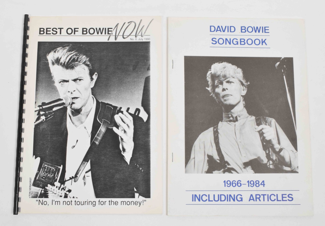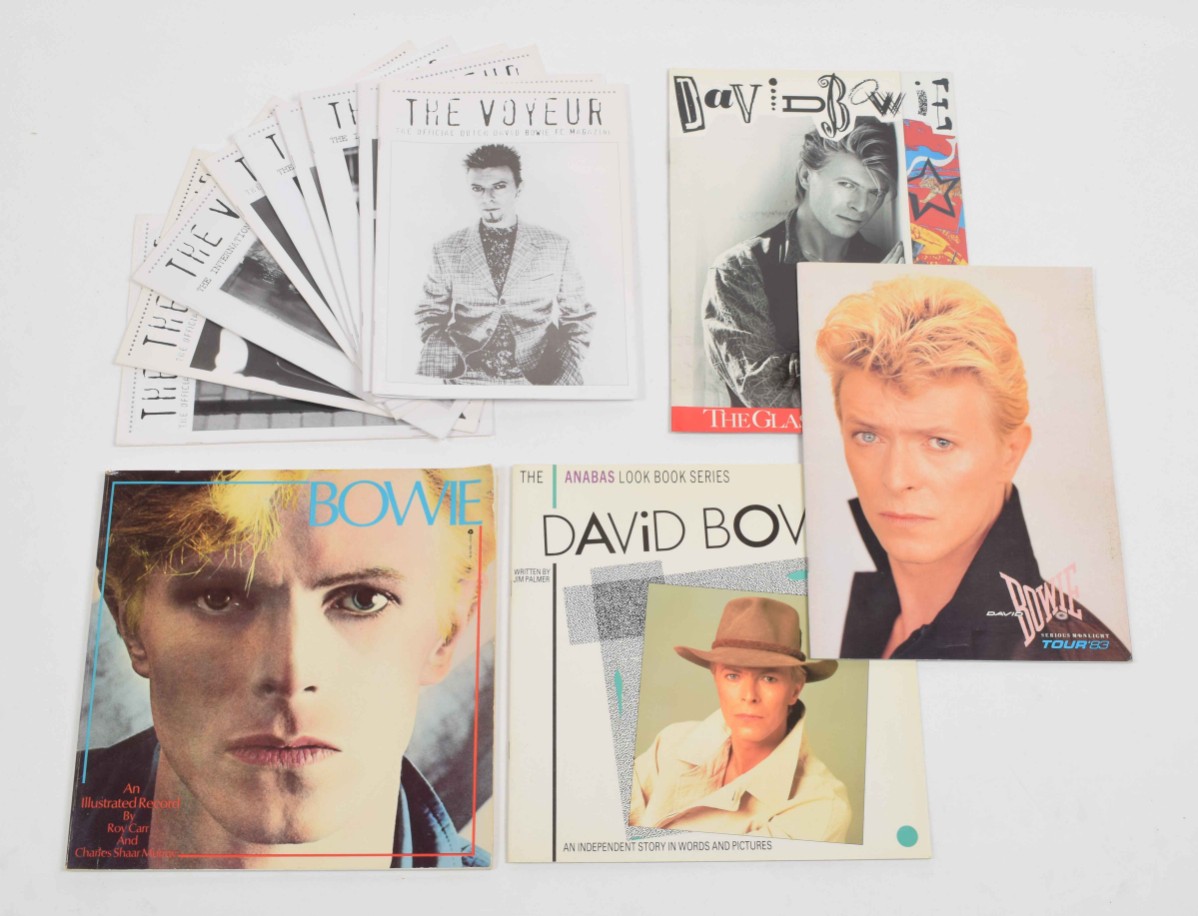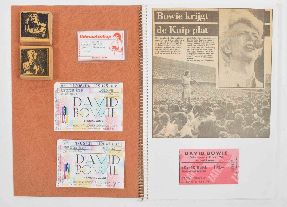 Ring binder with mounted newspaper and magazine clippings, picture postcards, several (folding) posters and 4 concert tickets. The tickets for the Serious Moonlight Tour, the Glass Spider Tour and the A Reality Tour + folder with 18 inserted pictures, some original colour pictures + fanzine David Bowie Now [later: The Voyeur], 28 issues. 1984-1998 + programmes for the Serious Moonlight Tour '83 and the Glass Spider Tour - and 28 more, incl. picture reproductions, a poster and books.